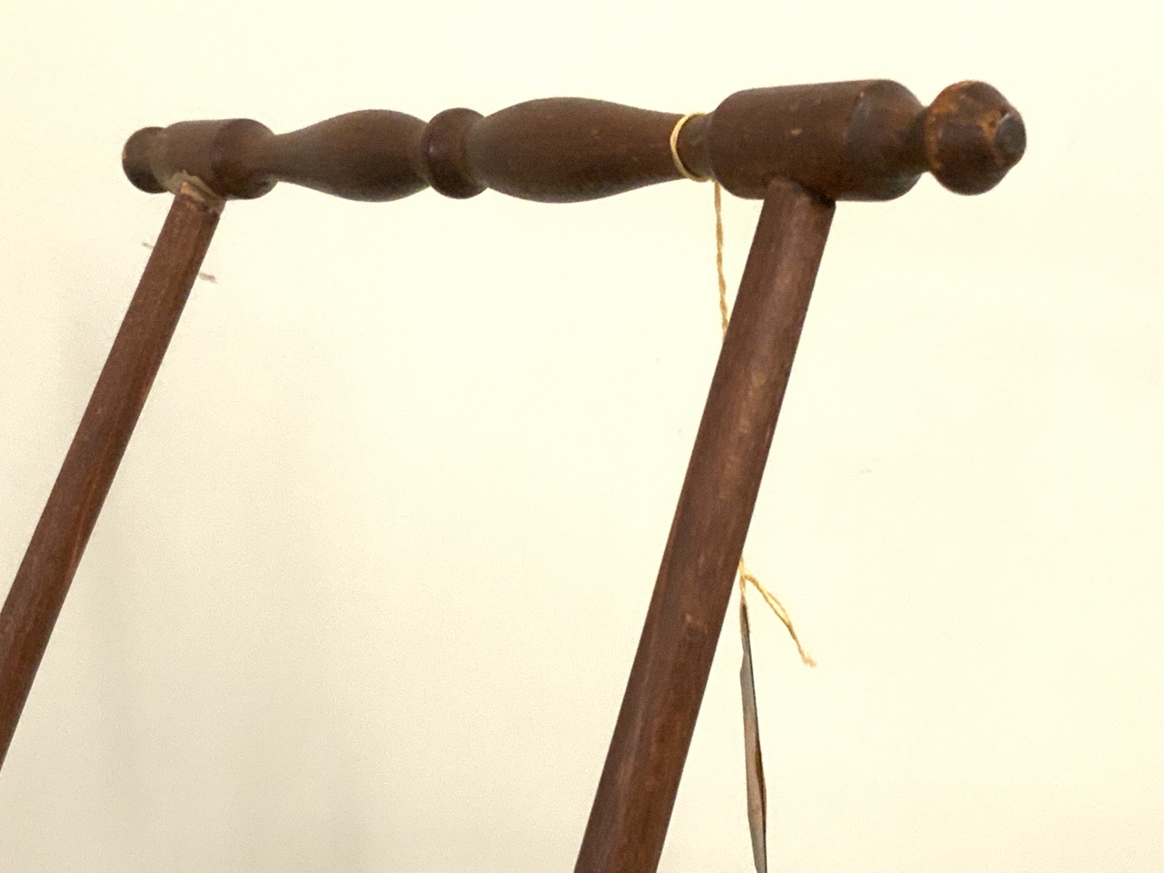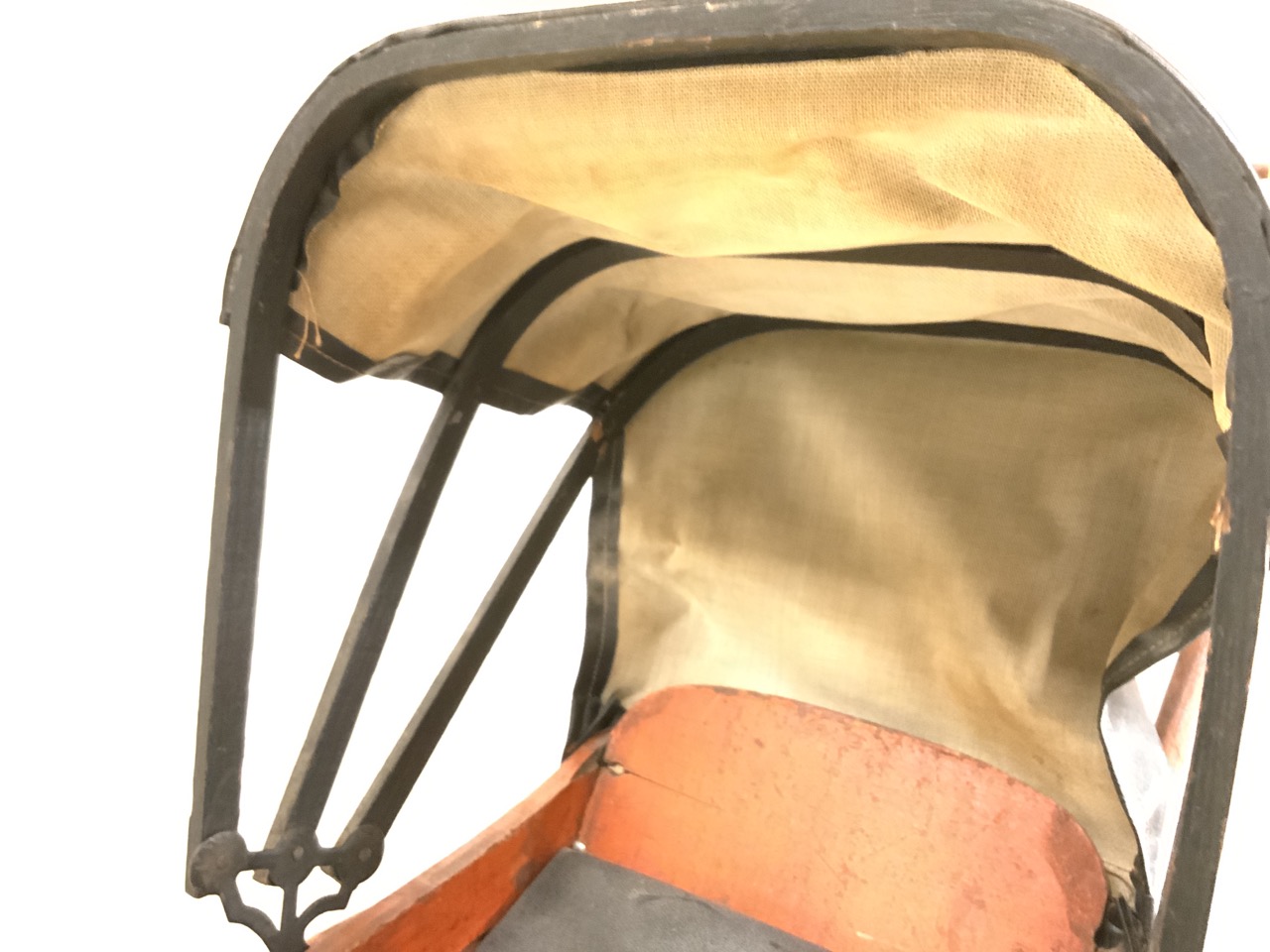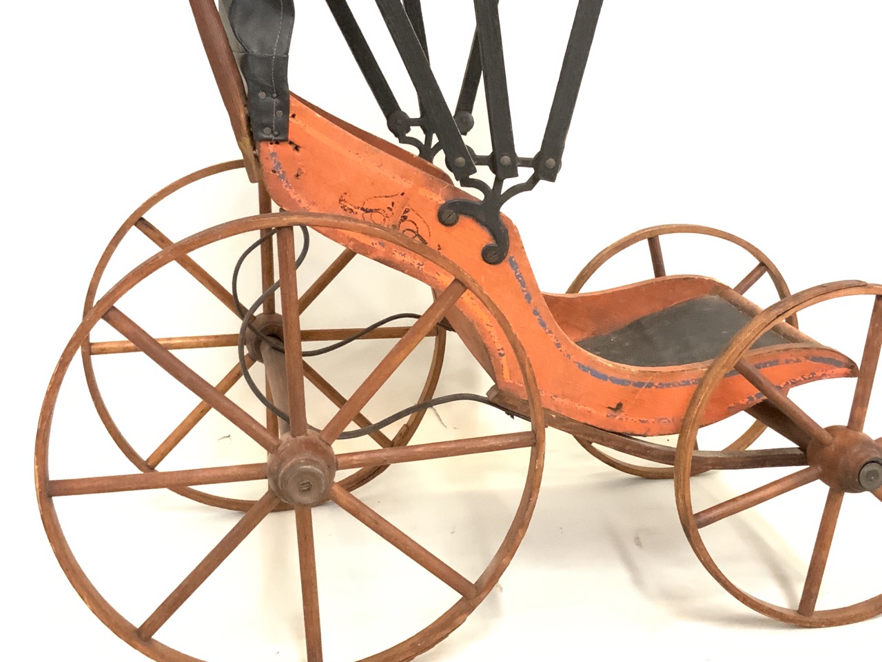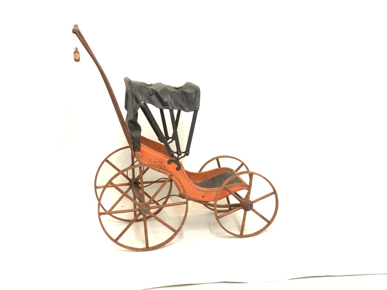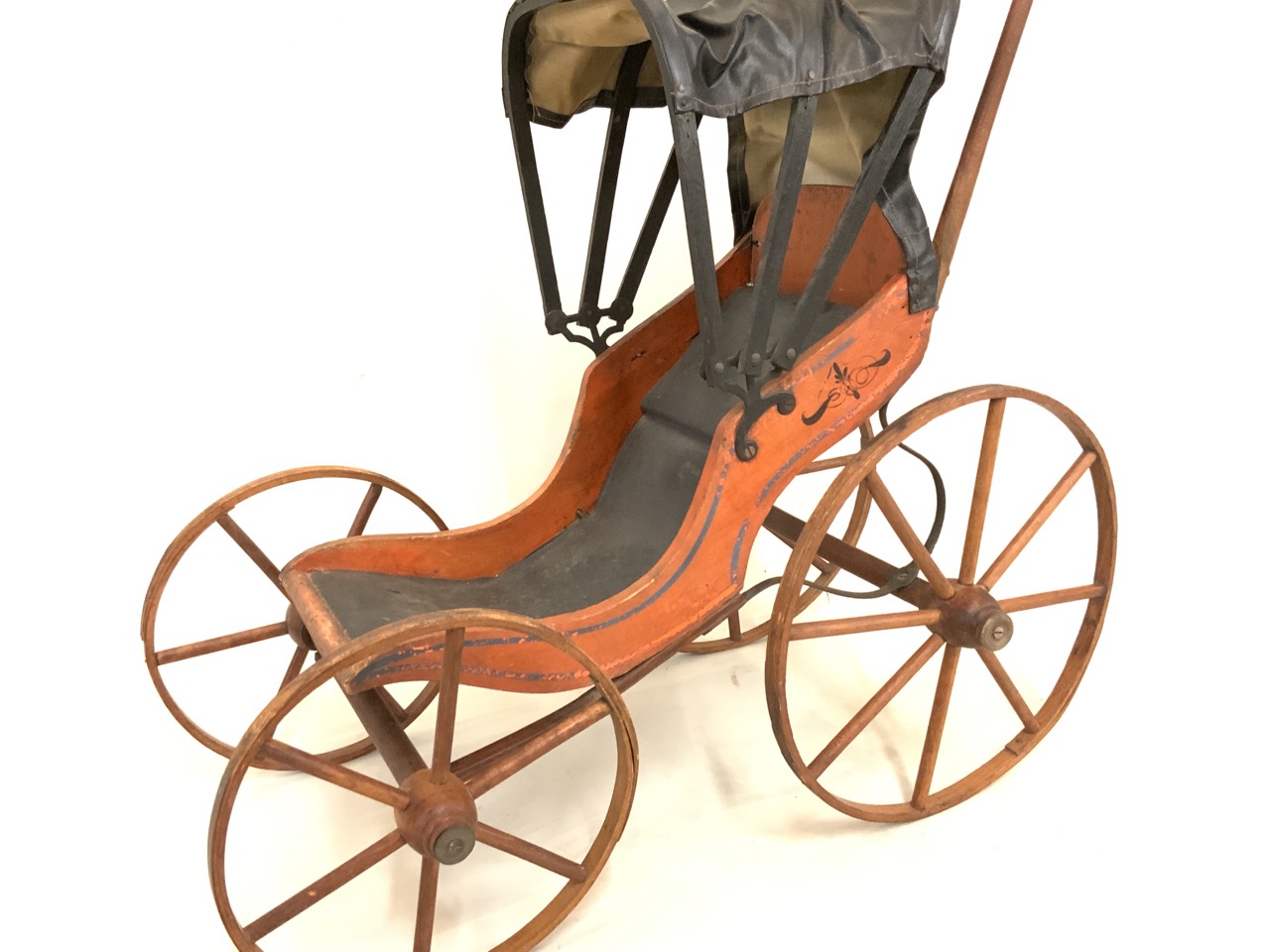 19th century antique wooden doll carriage with orange paint and retractable covered top.