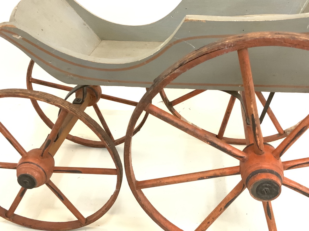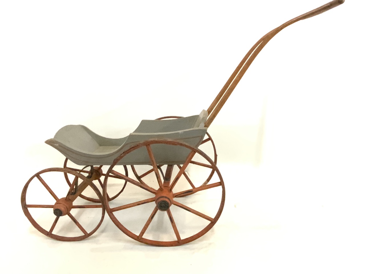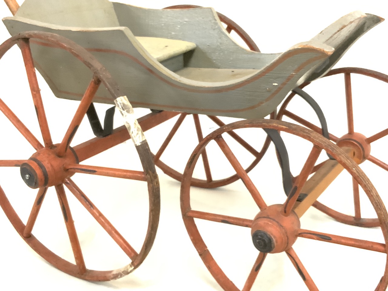 Wooden doll carriage. 19/20th century. Open wagon with four spoked wheels.