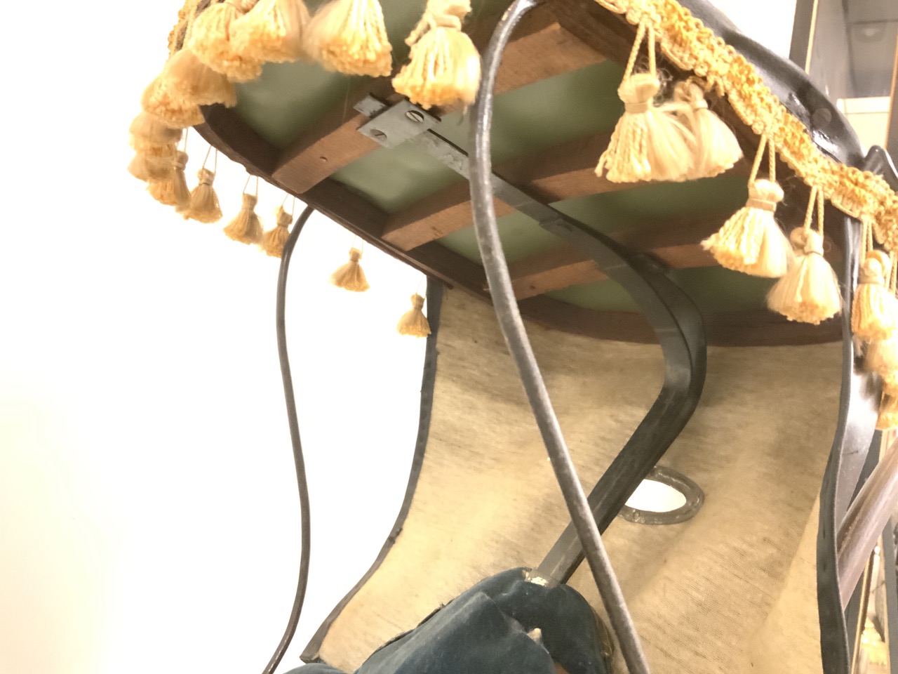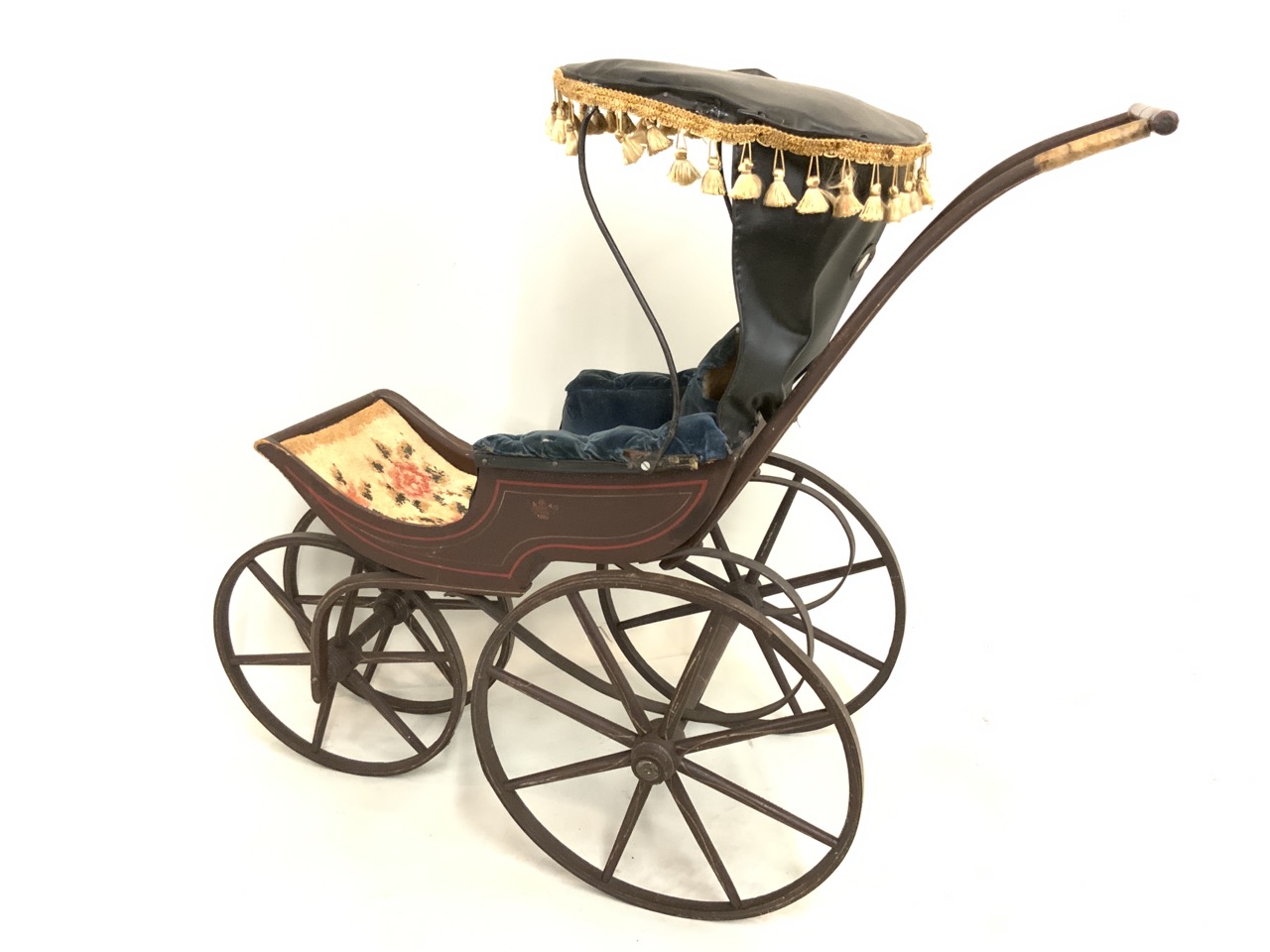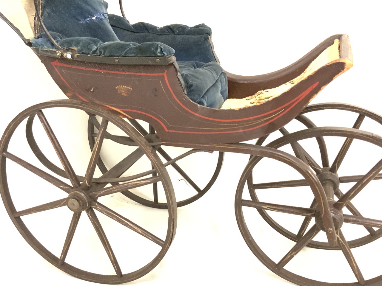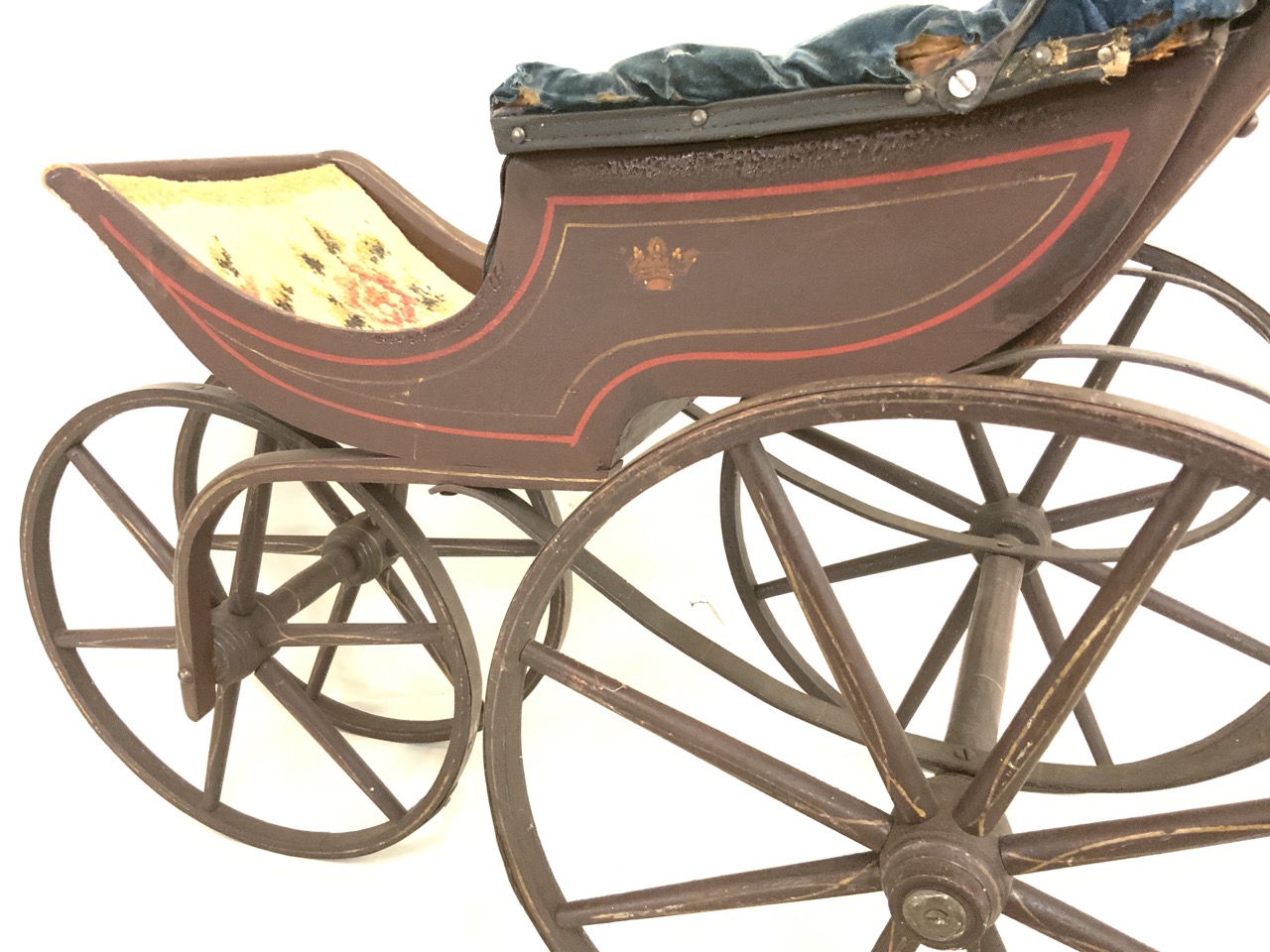 Fancy 19th century doll carriage with blue tufted seating and brown paint with red trim.