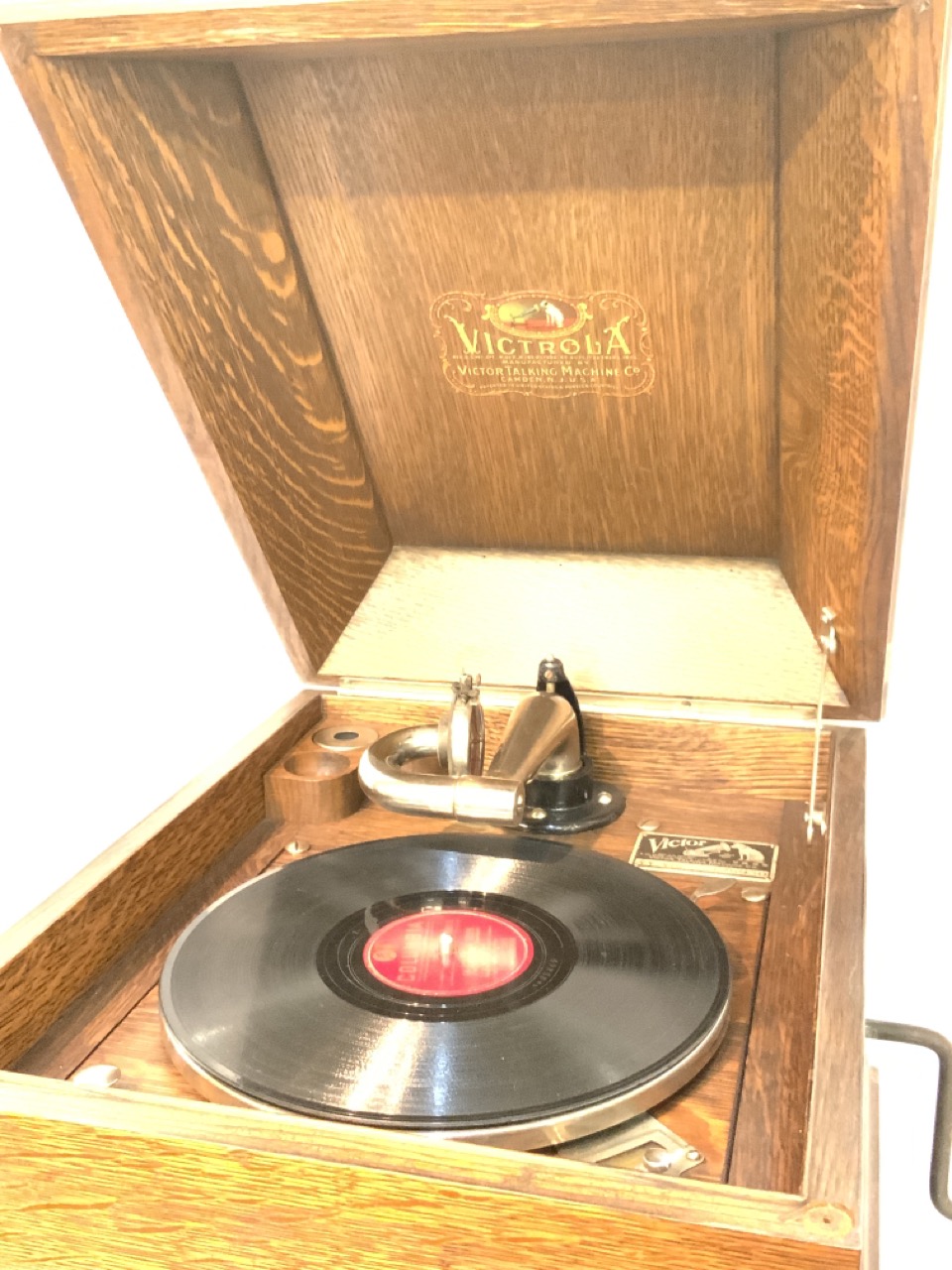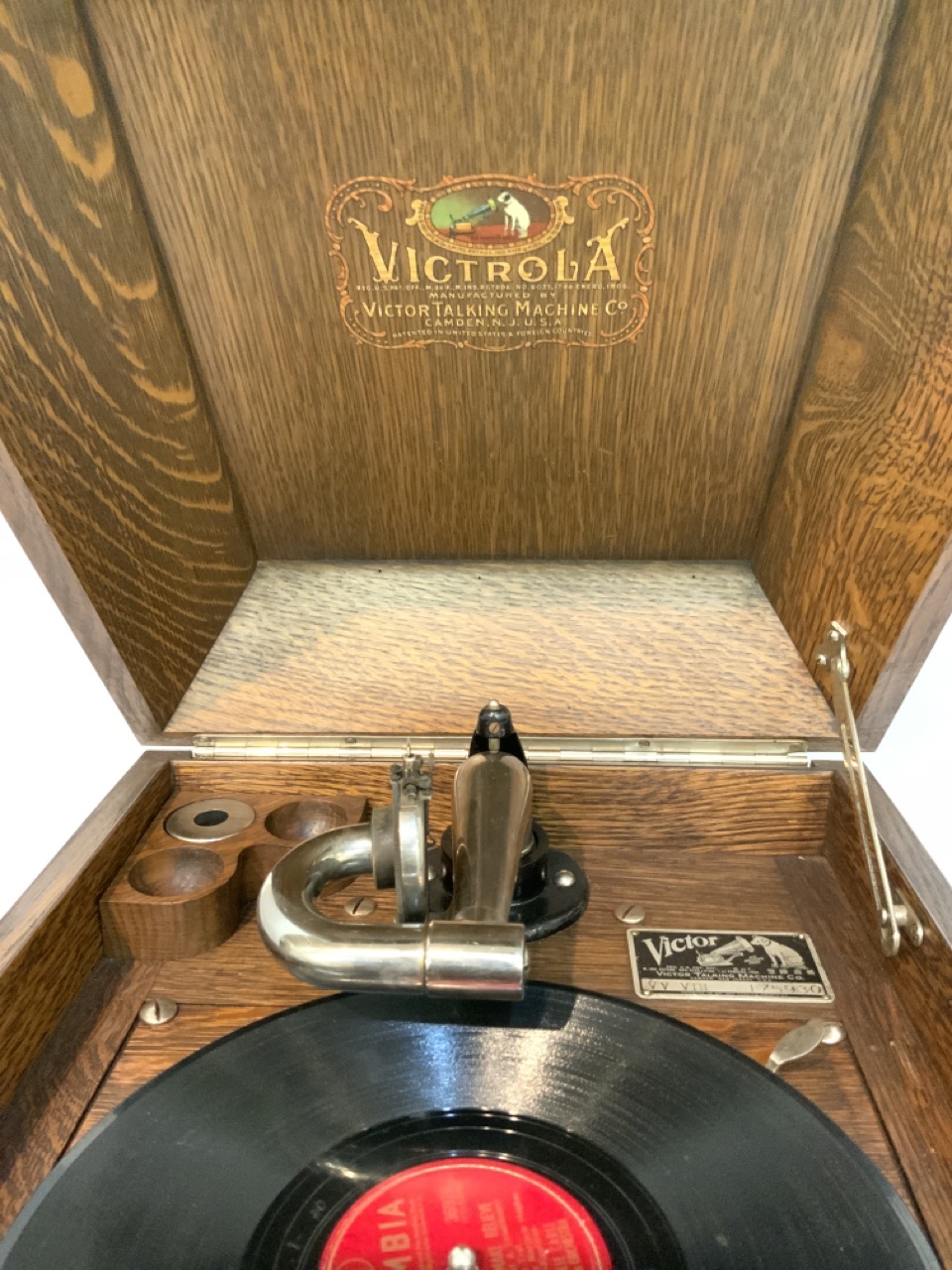 Victor Victrola Talking Machine. 175960 serial number. Oak casing. Nice condition. One pin needs replacing on front door hinge.
