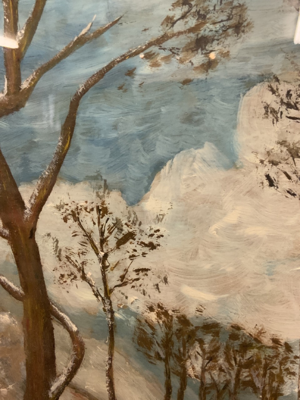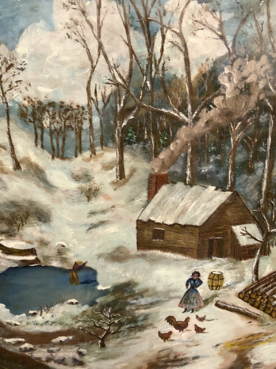 An American folk art oil painting depicting a log cabin in the woods scene. Unsigned.