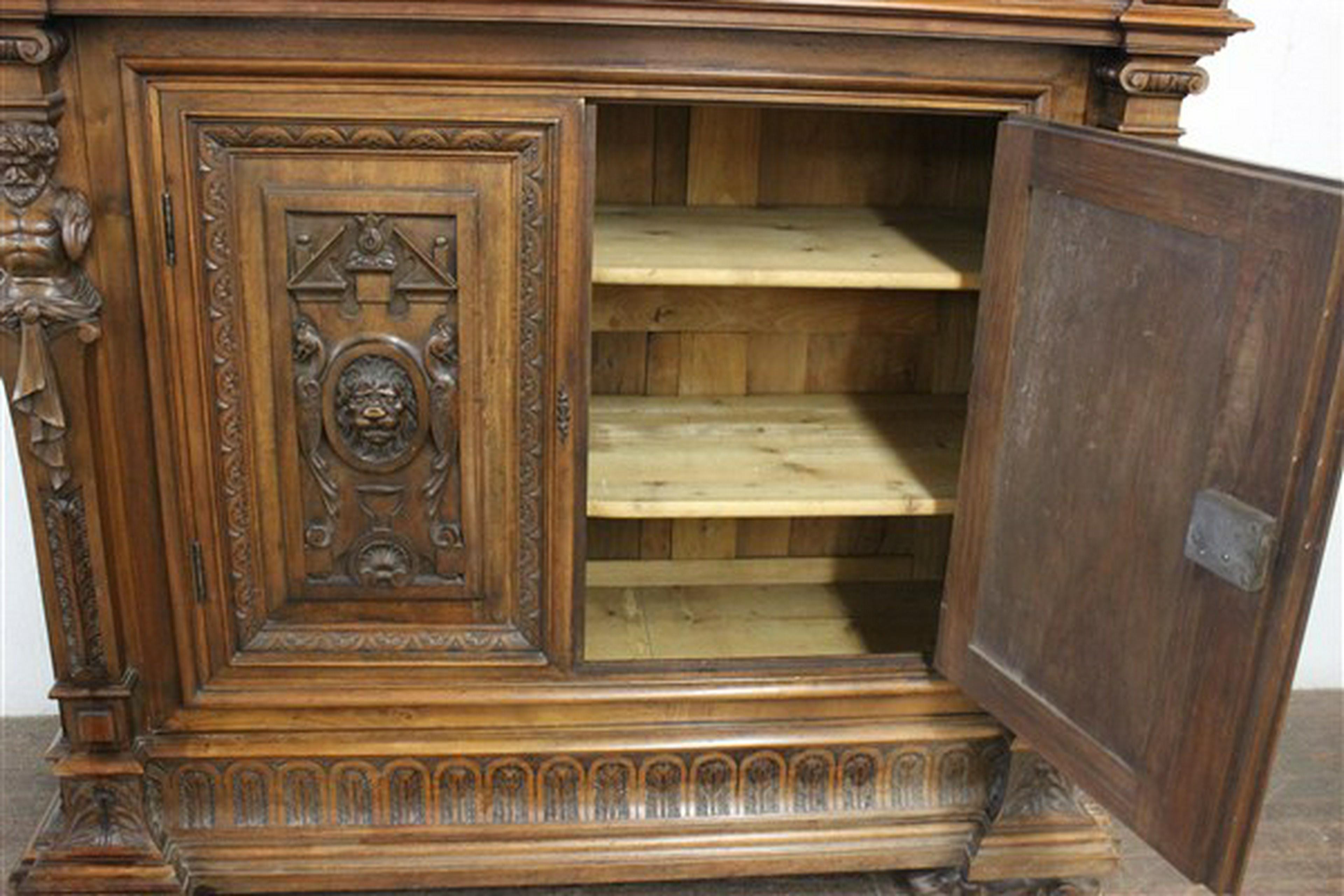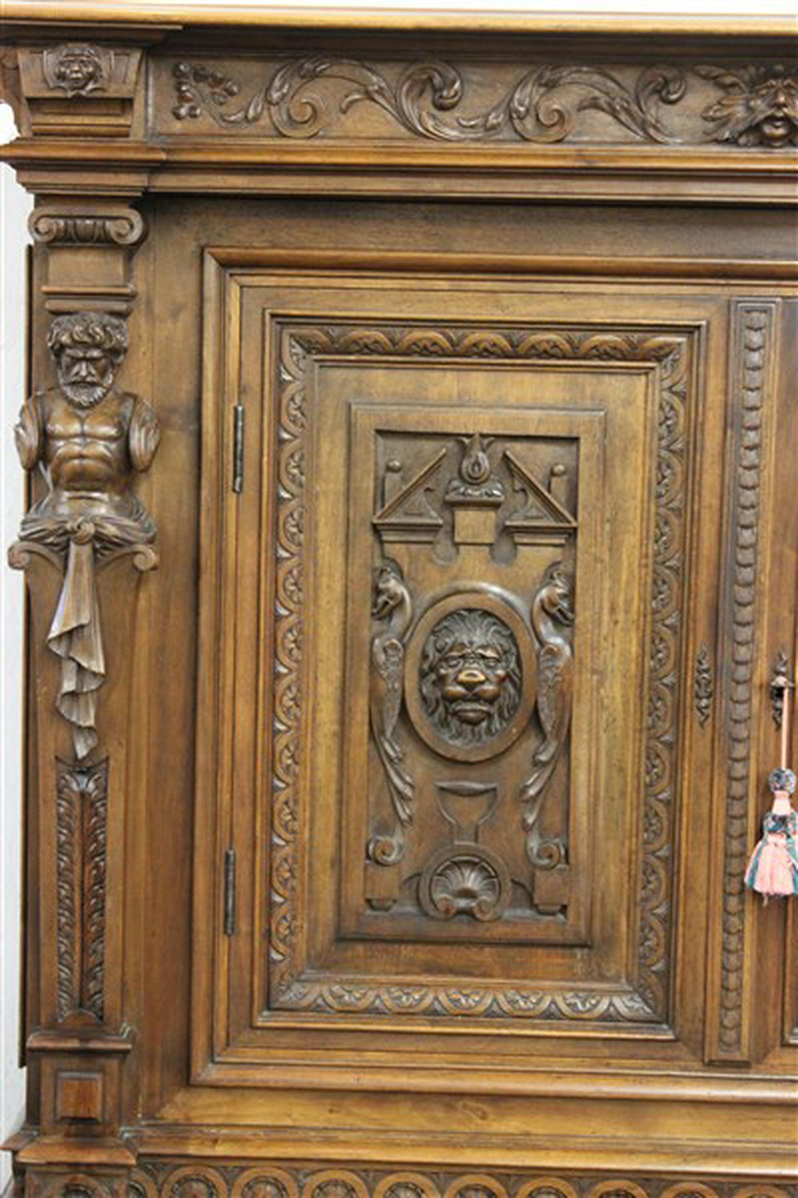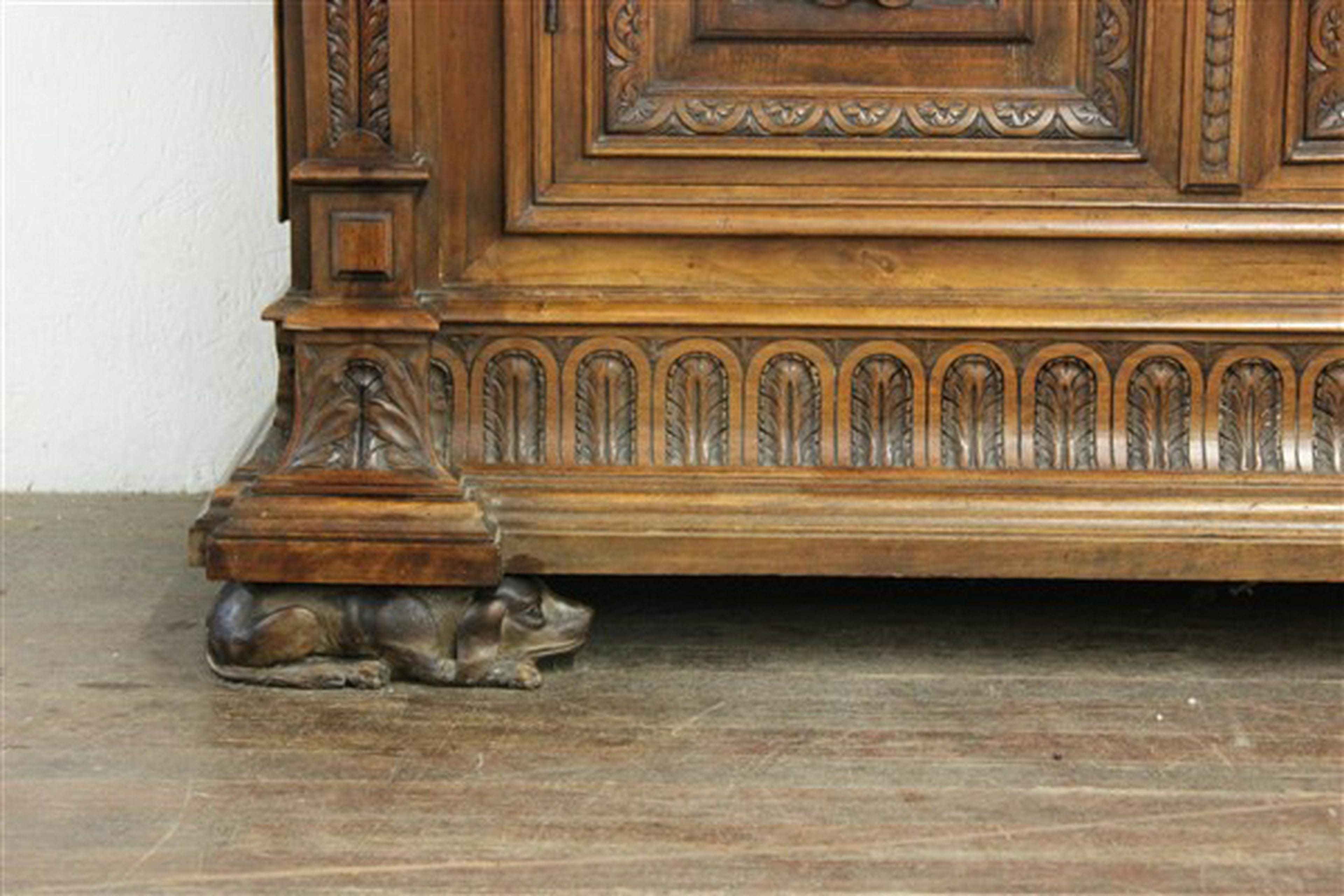 A 19th century heavily carved Renaissance revival cabinet. Unusual Daschund full bodied dogs as feet.
