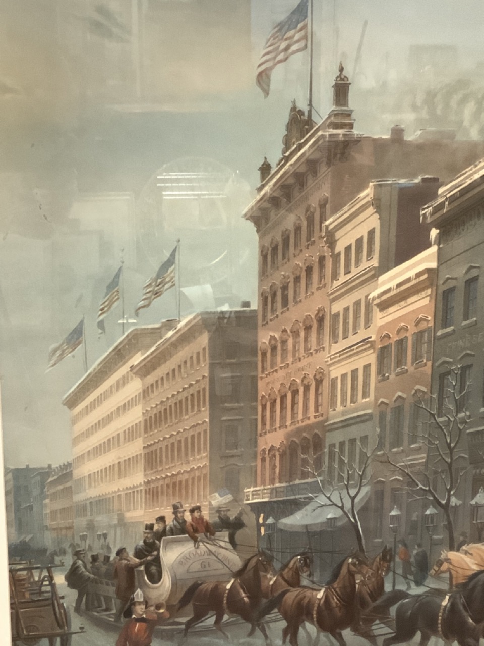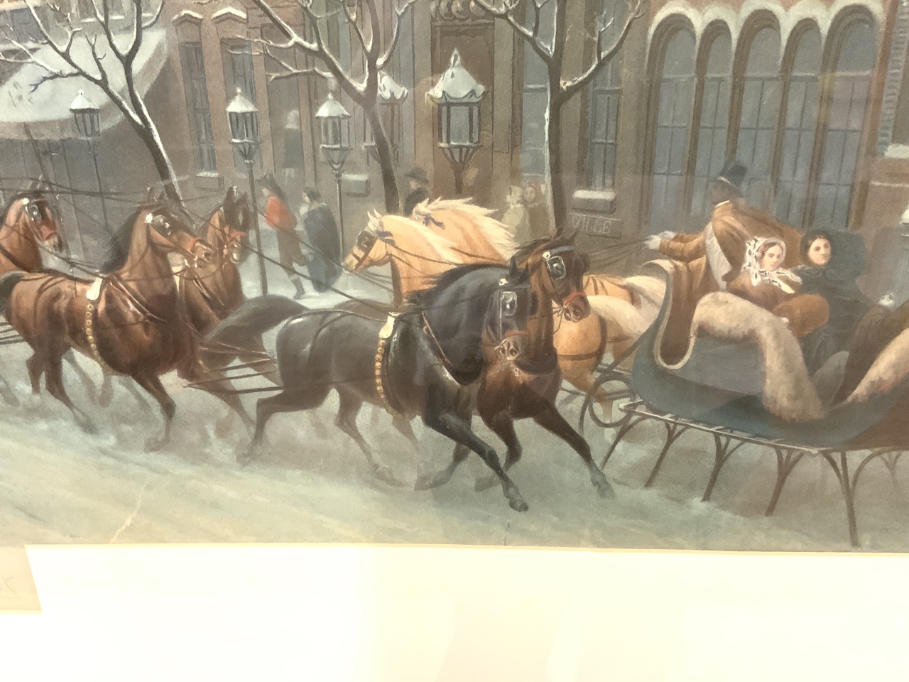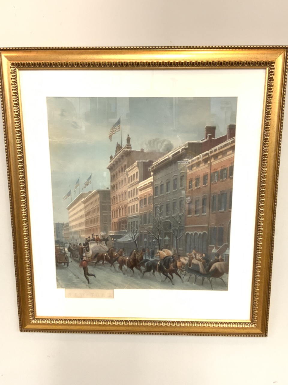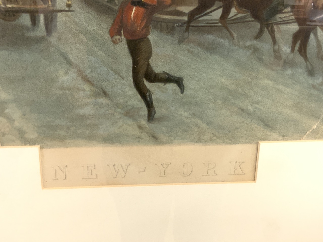 New York City print in winter with horsedrawn sleights.