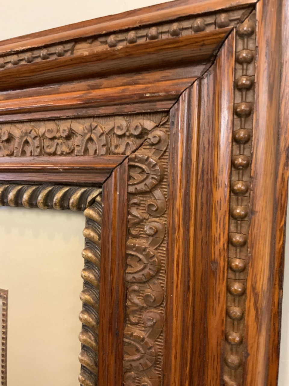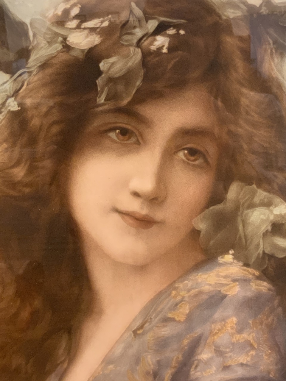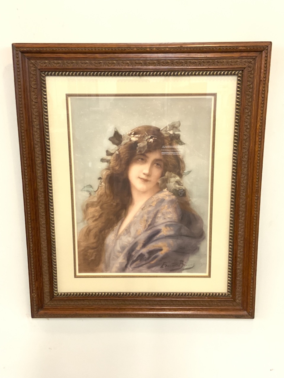 Beautiful Female Chromolithograph Print. House In Carved Oak Wood Frame.