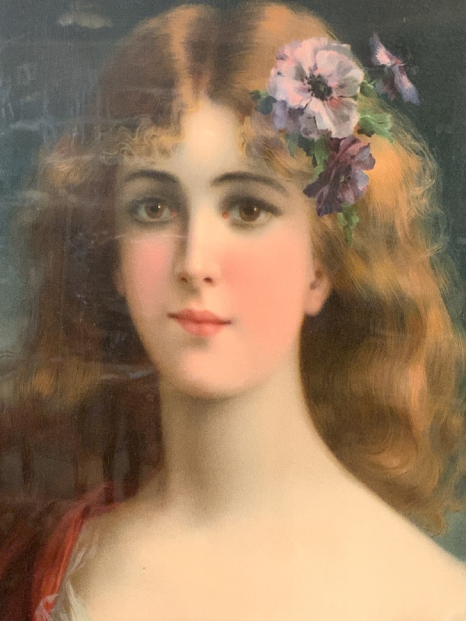Chromolithograph print of female with violet flowers.