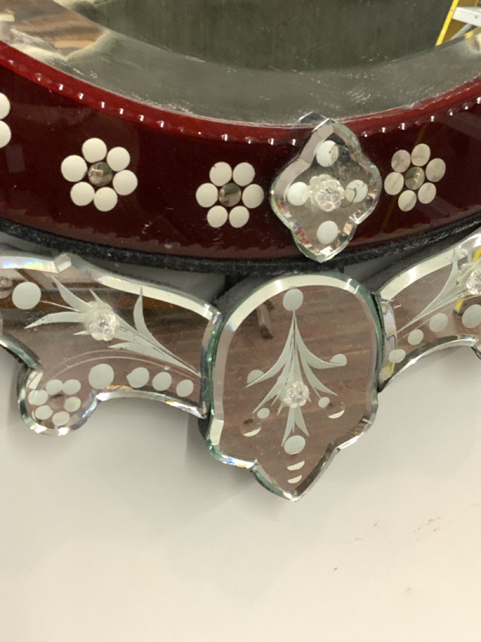 Ruby etched and bevelled glass mirror.