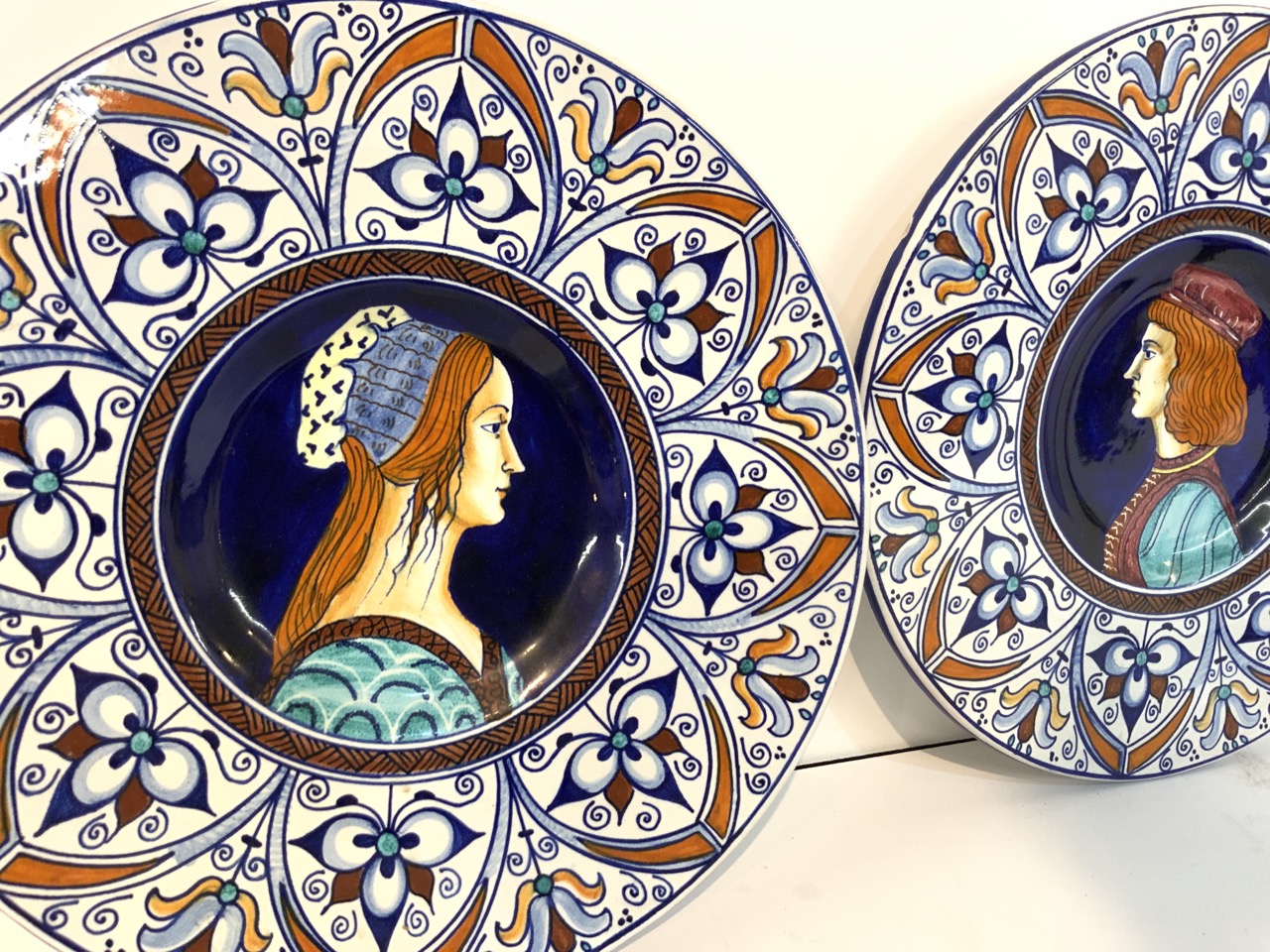 A pair of Italian hand painted Faience style portrait plates.