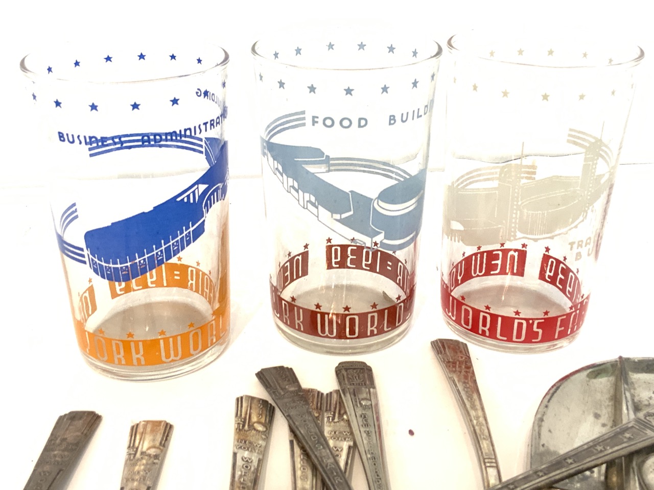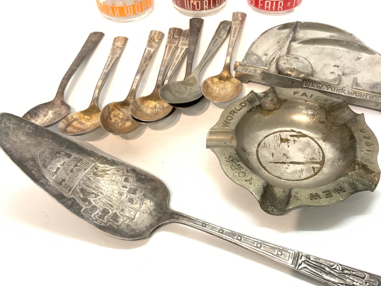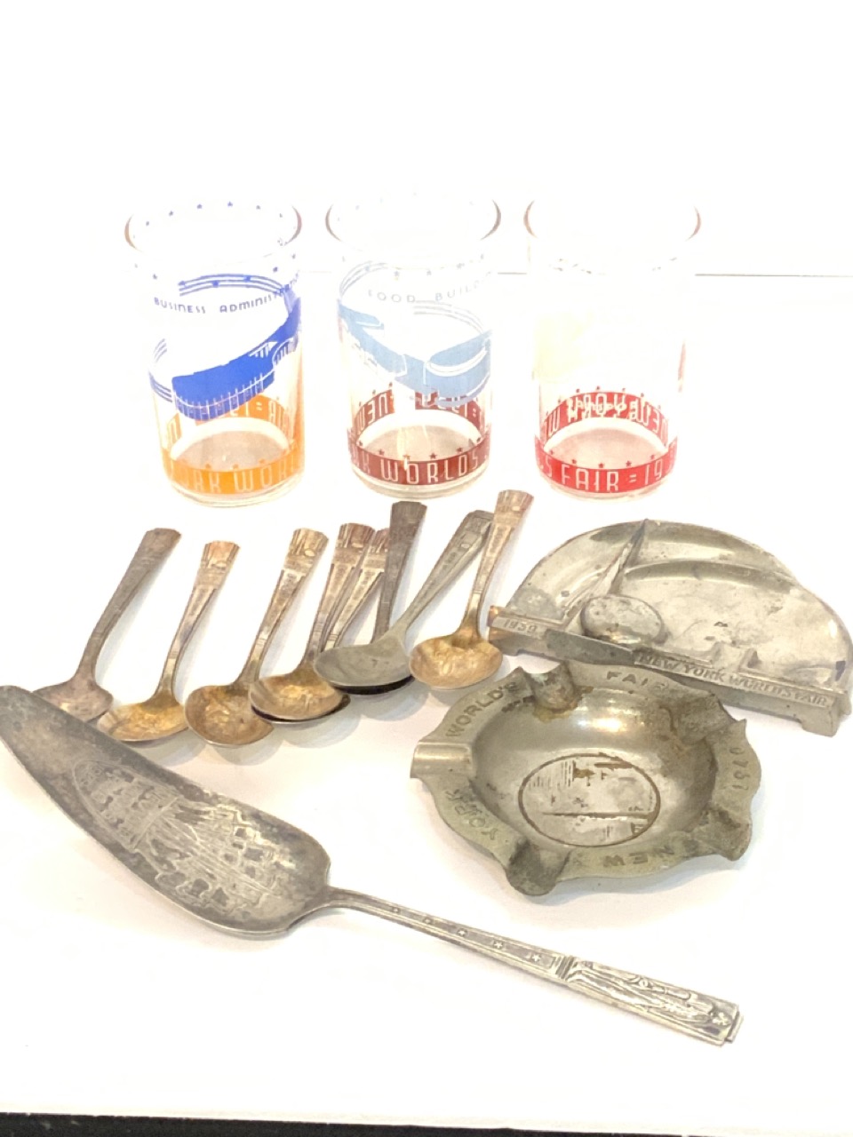 Collectible 1939 New York World's Fair objects including glasses, metalware, spoons, trays etc.