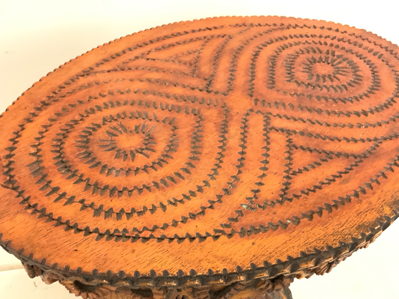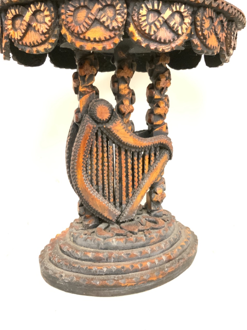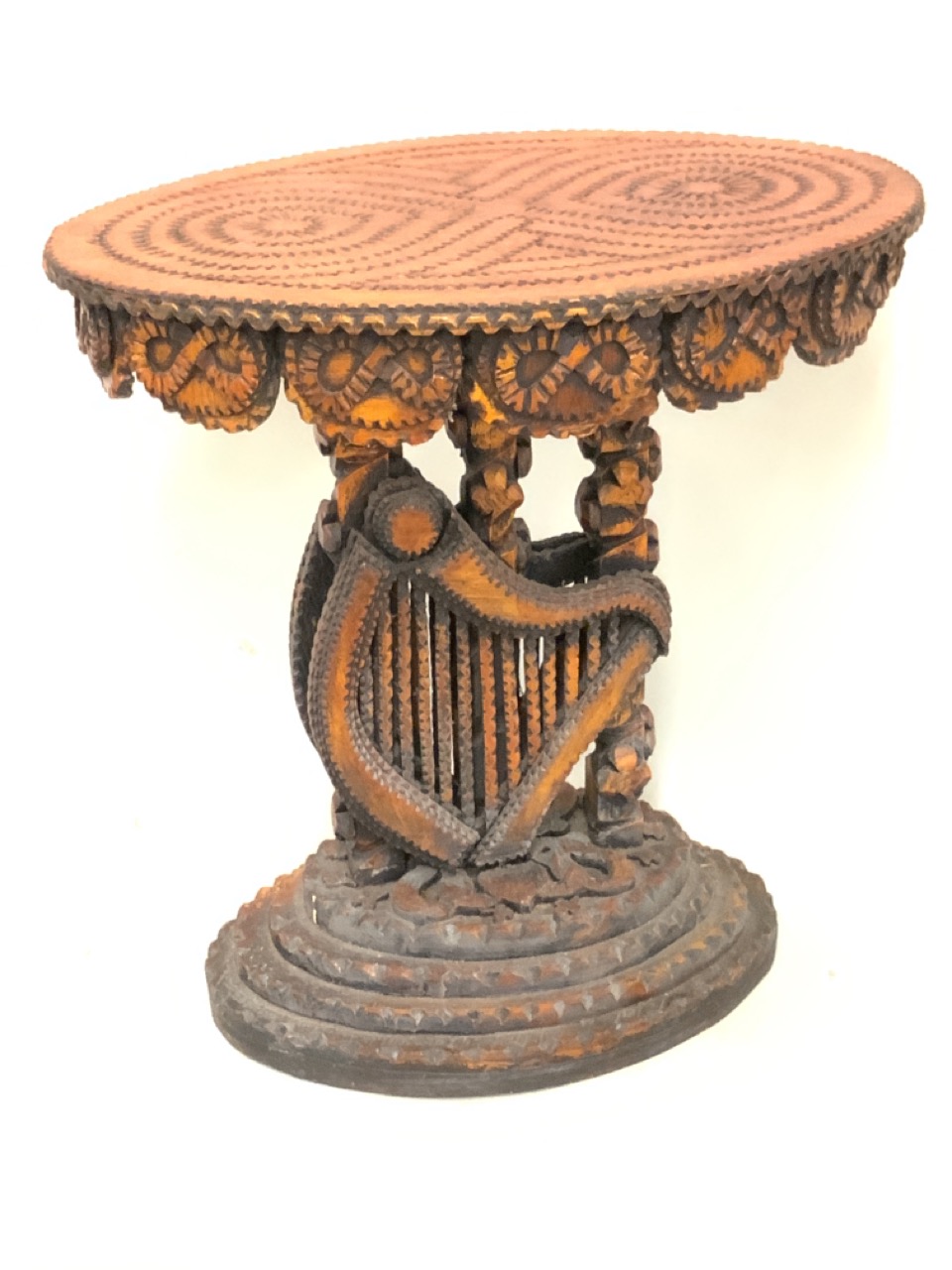 Tramp Art Table. All hand carved with harp base. Attributed To Michael Lavery.