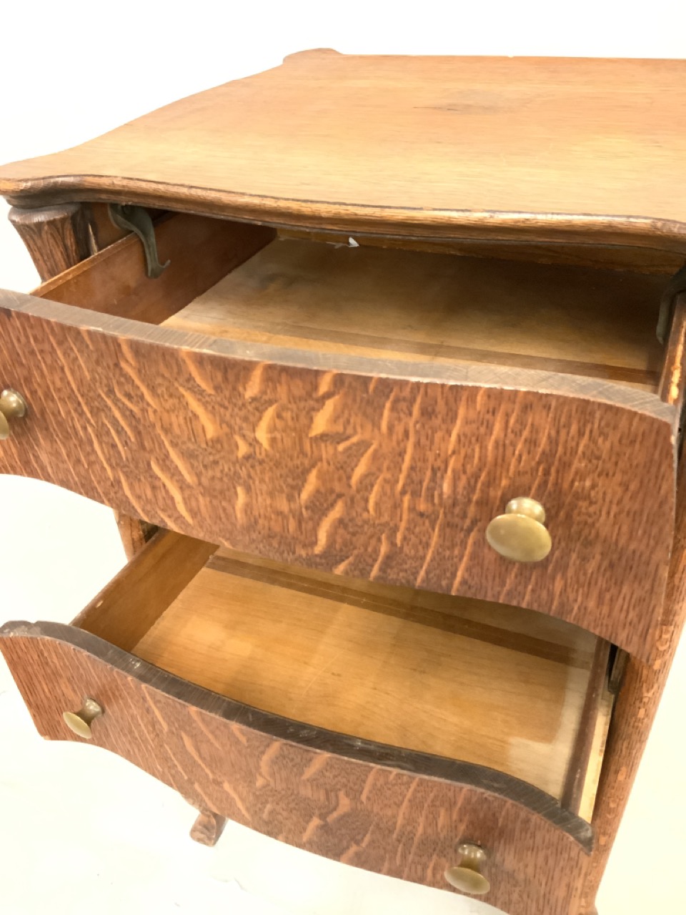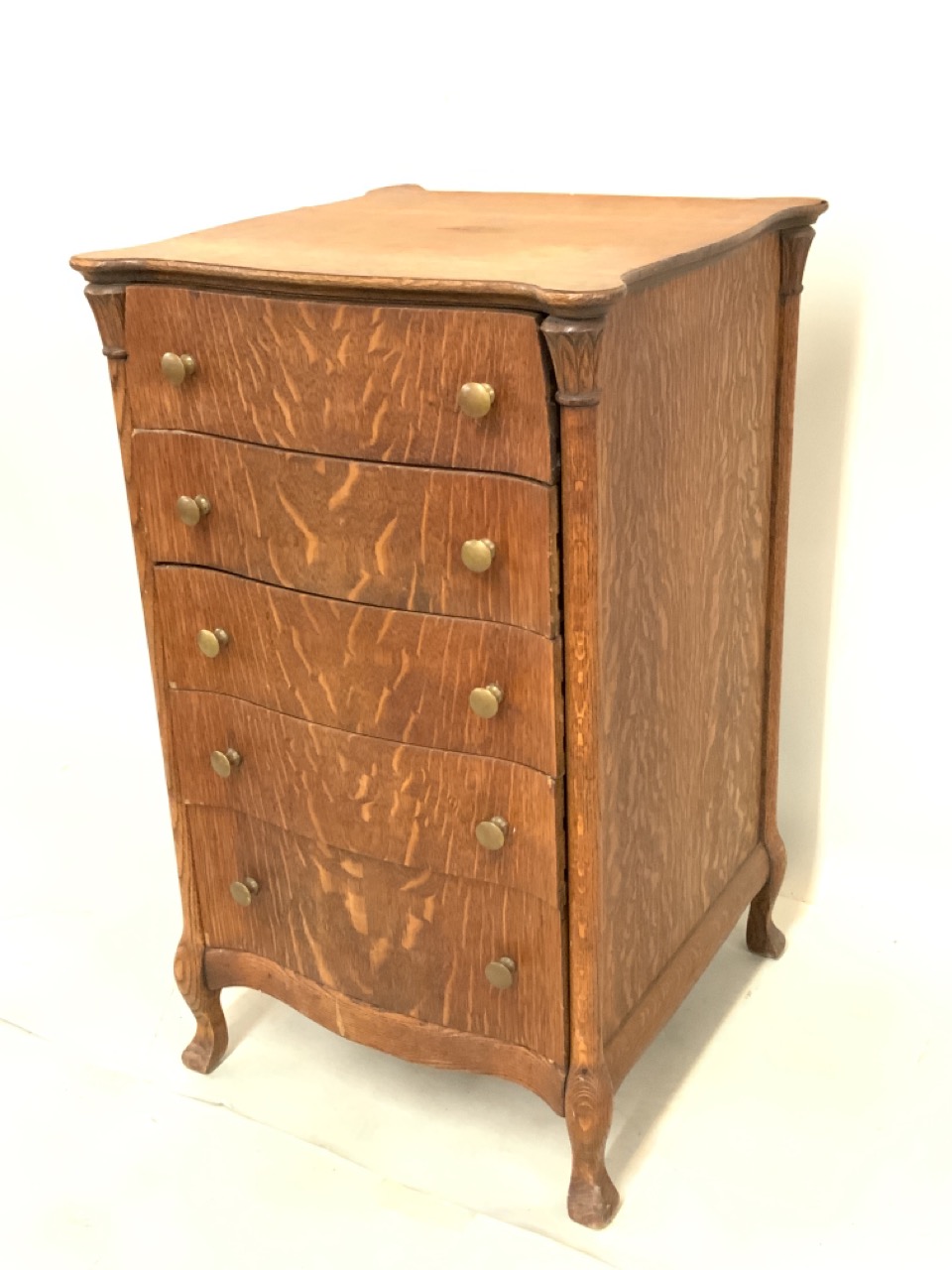 Five drawer oak music cabinet and stand for cylinder or disc. player. Brass knob pulls. Would make a nice jewelry chest or watch cabinet.