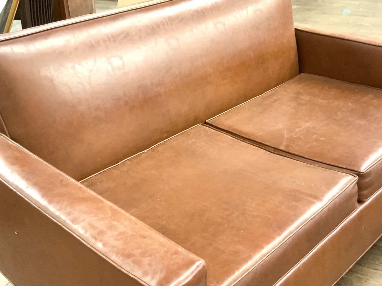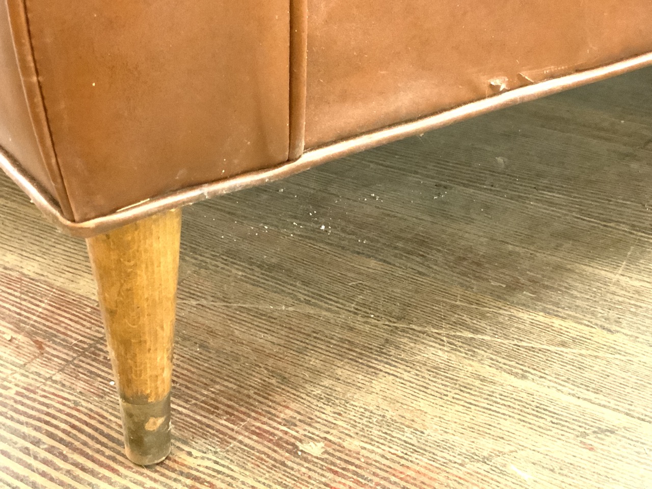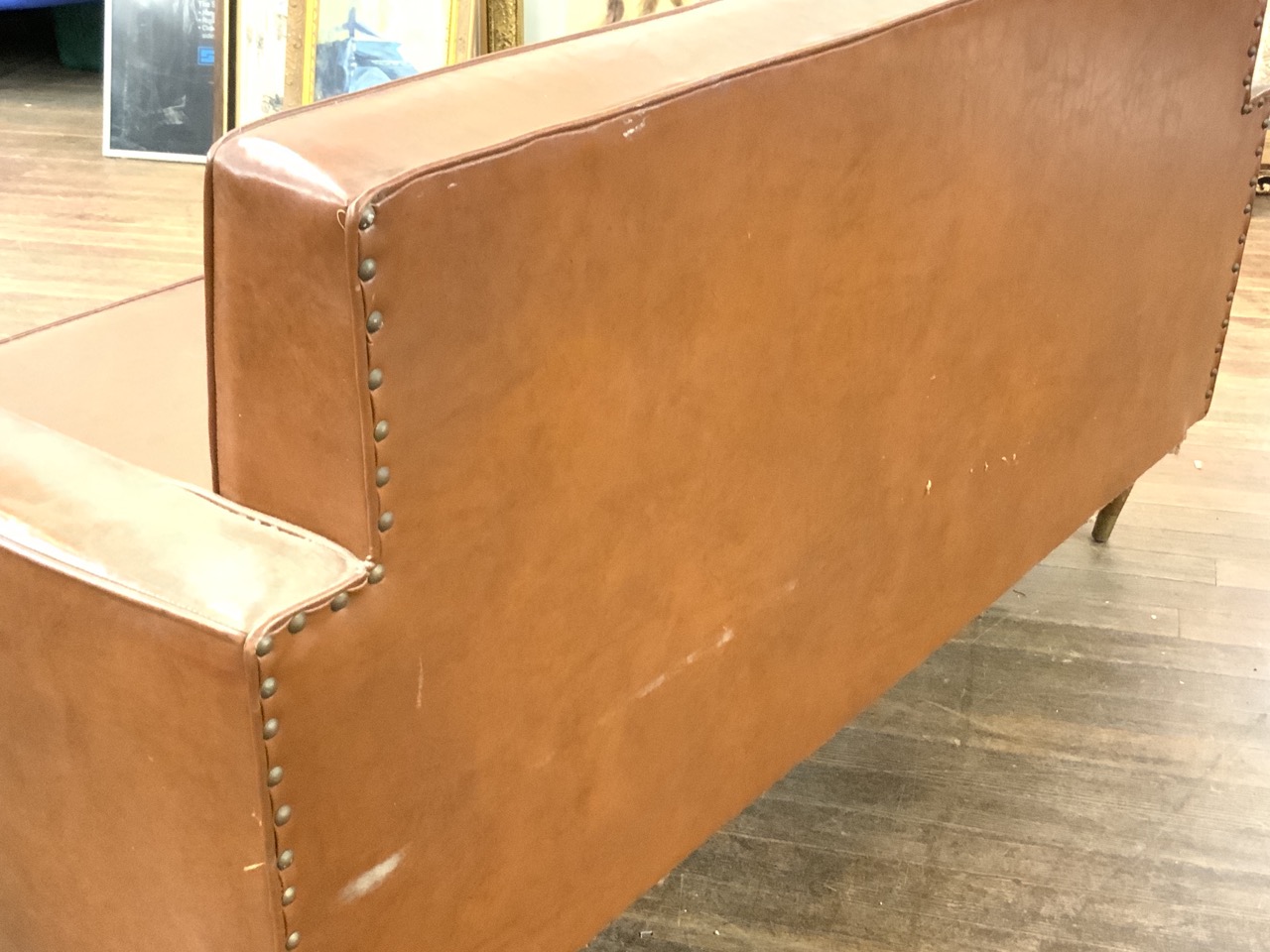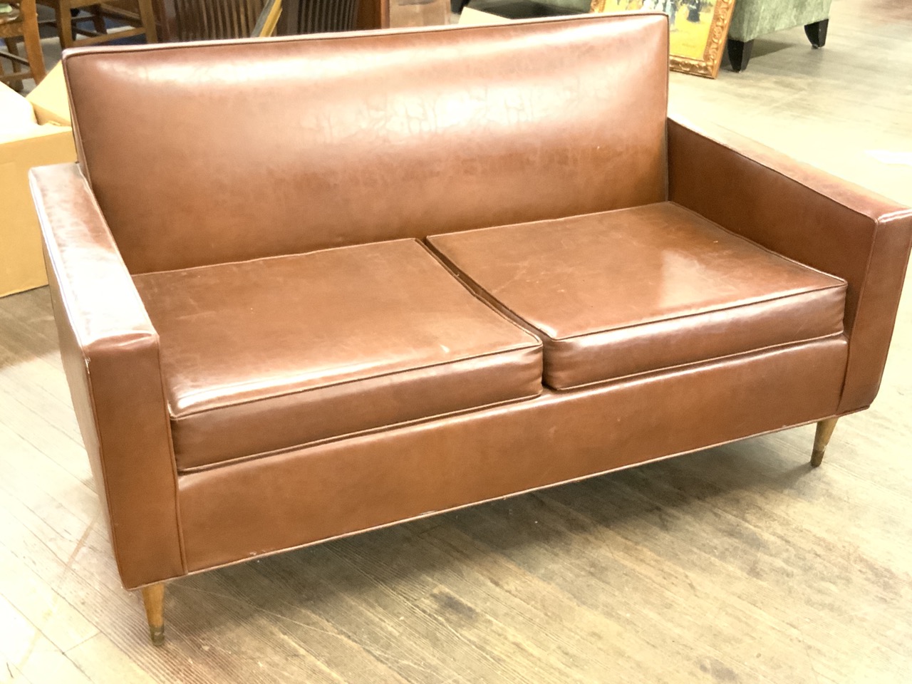 Mid century modern design Naugahyde two seater sofa with wooden peg leg feet and tacked backing.
