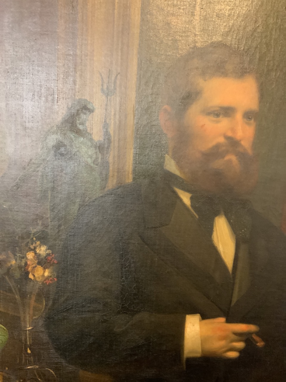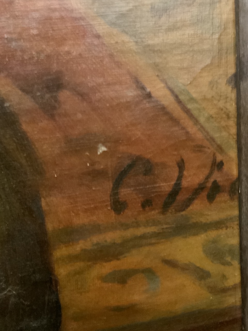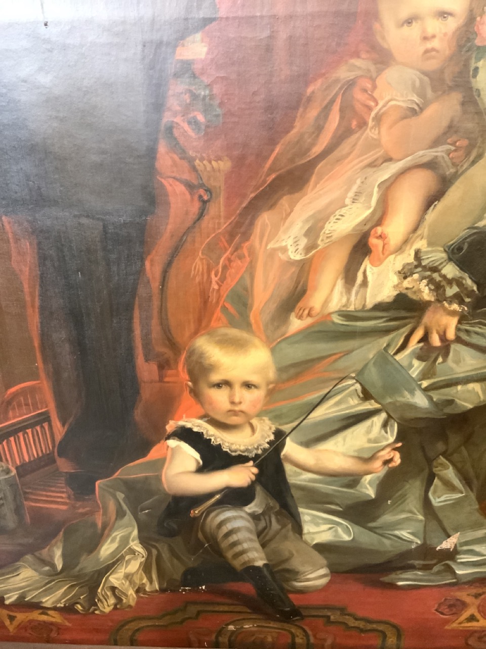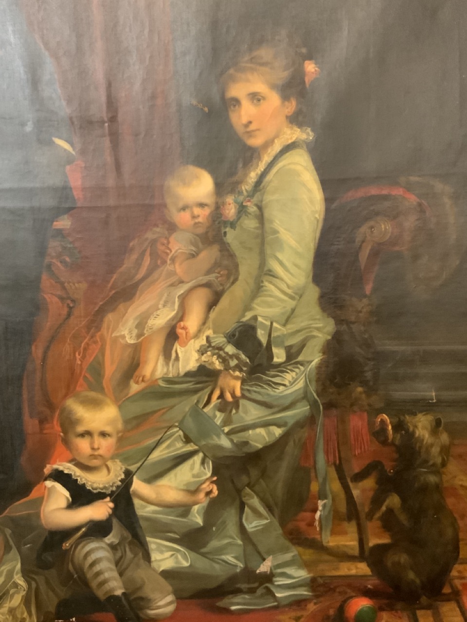 Cesare Dies (Italian,1830-1884)German Official with family in Italy c.1878.An interior family portrait scene with family in parlor with fireplace and dog.Signed lower right and signed on reverse and dated 1878 at Roma Via Babuino 144Dimensions: 95" X 69" Approx. 7ft x 5ft including frame. Slight tear to the left of the lady. Older tears seen on reverse with tape repairs. Provenance: German's airline executive's estate.