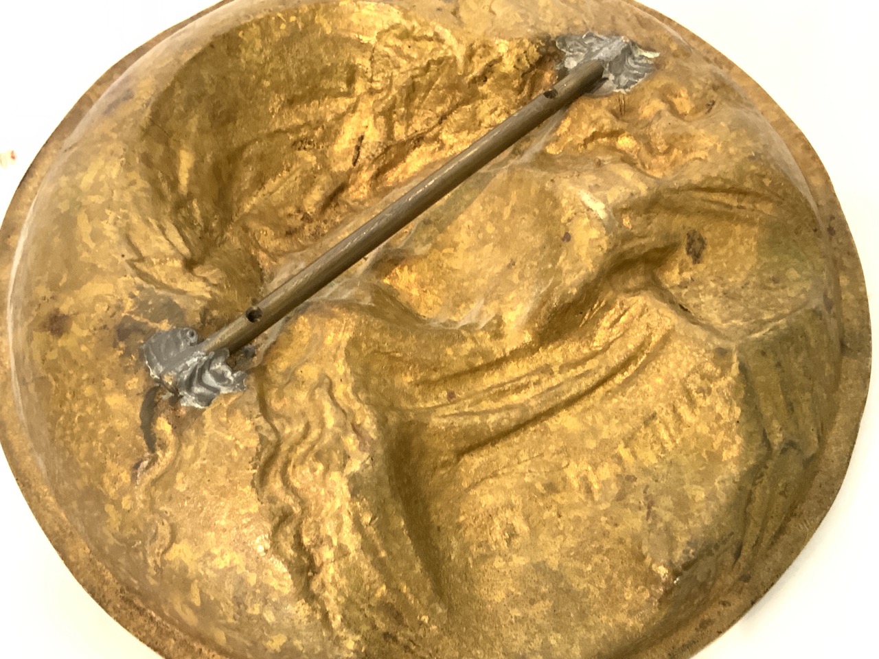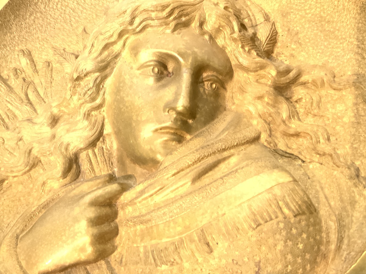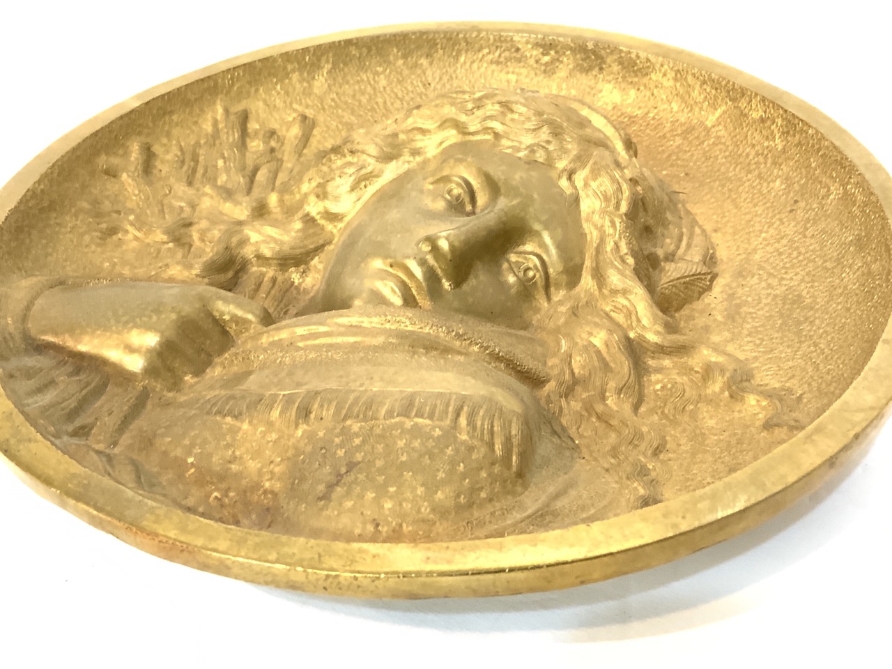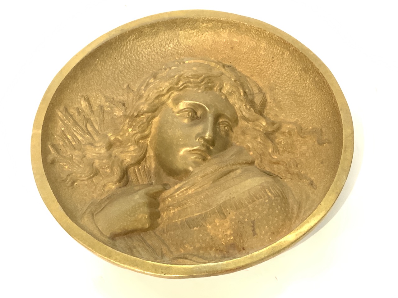 A solid brass plaque of a girl holding wheat (Ruth).