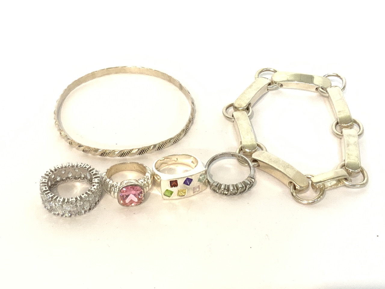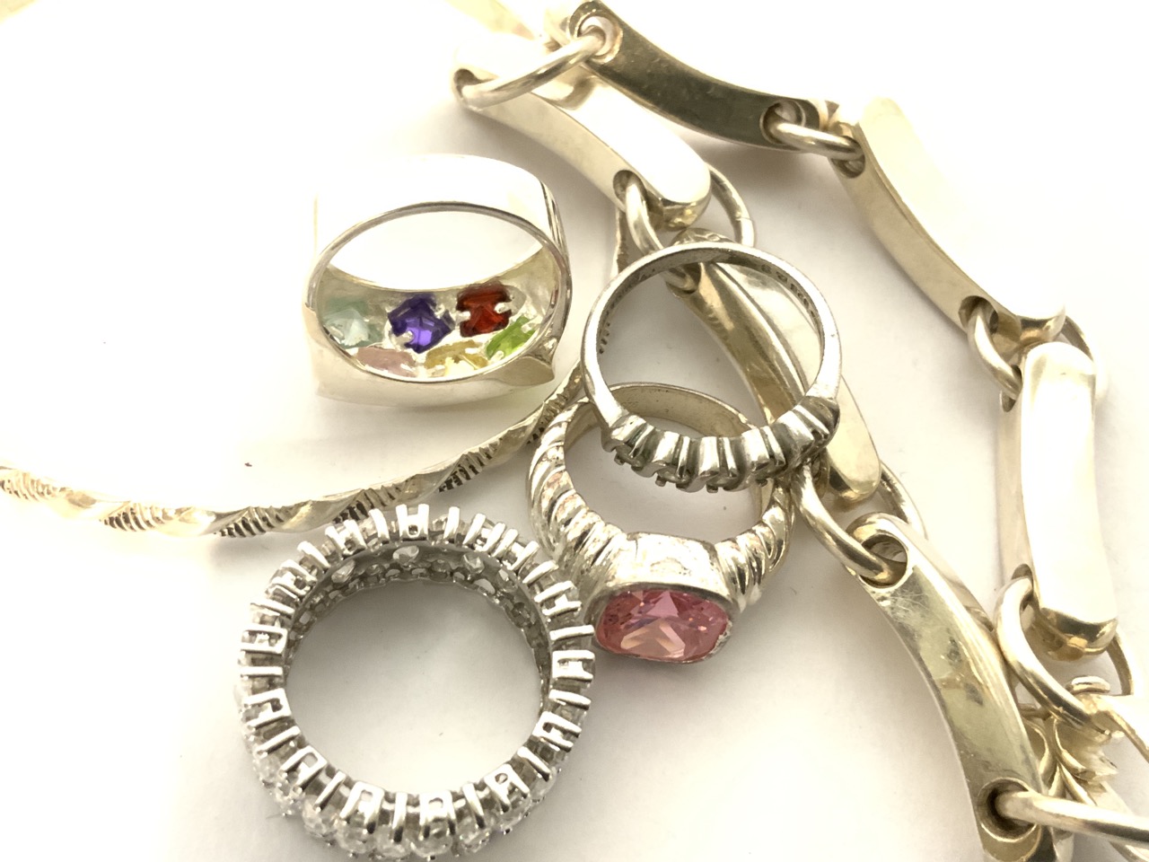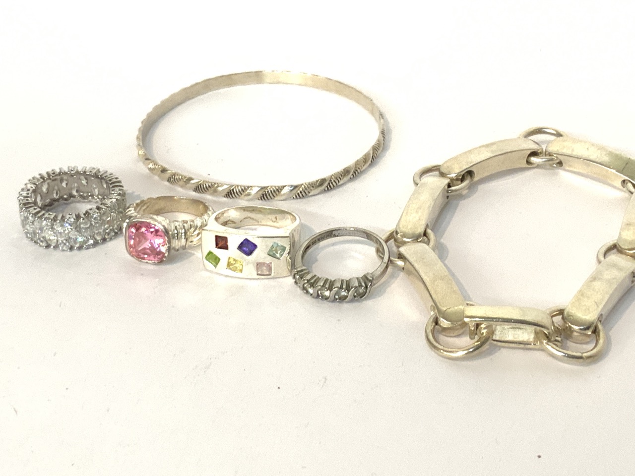 Assorted sterling silver jewelry group lot. Four rings and two bracelets.