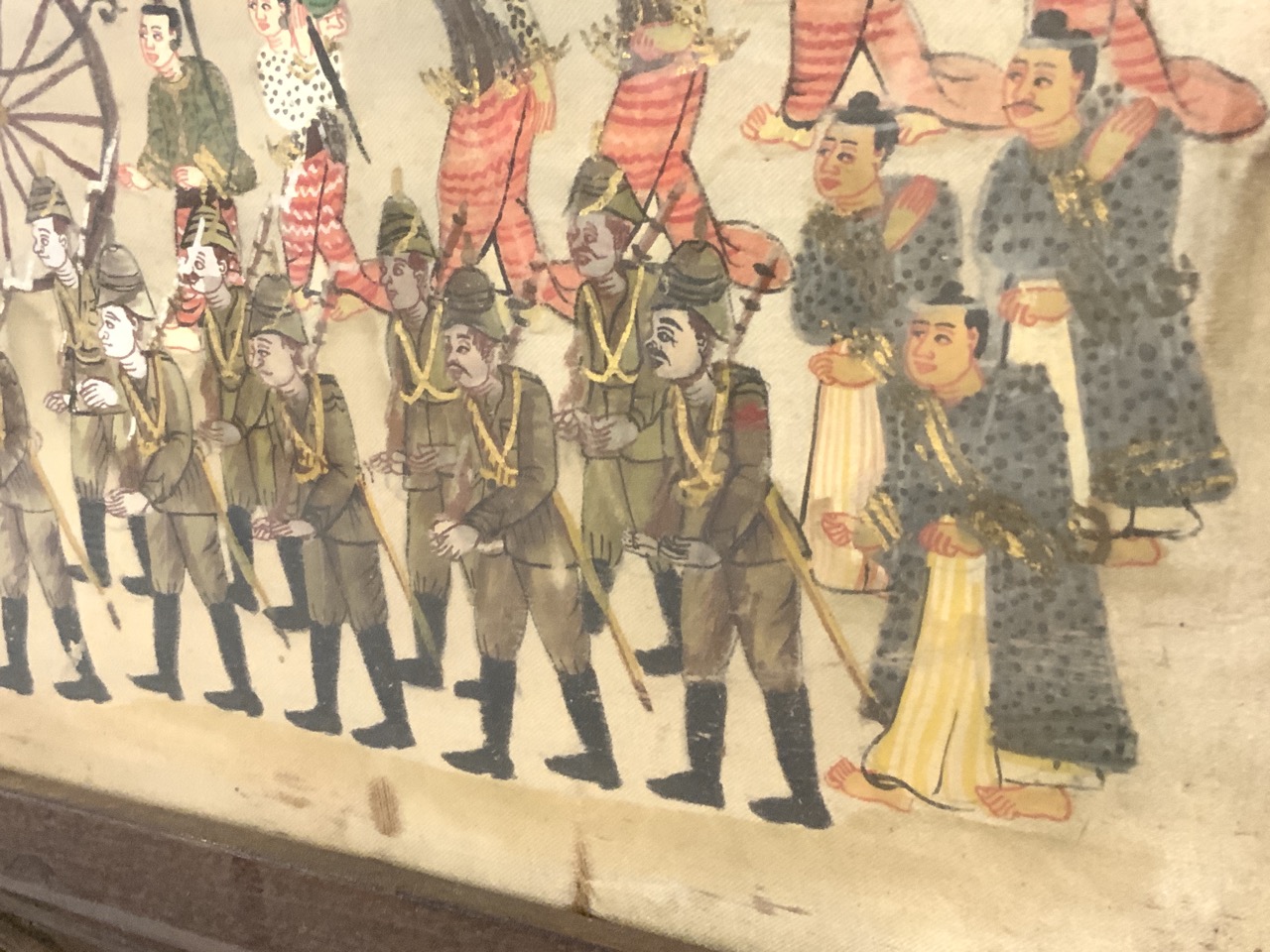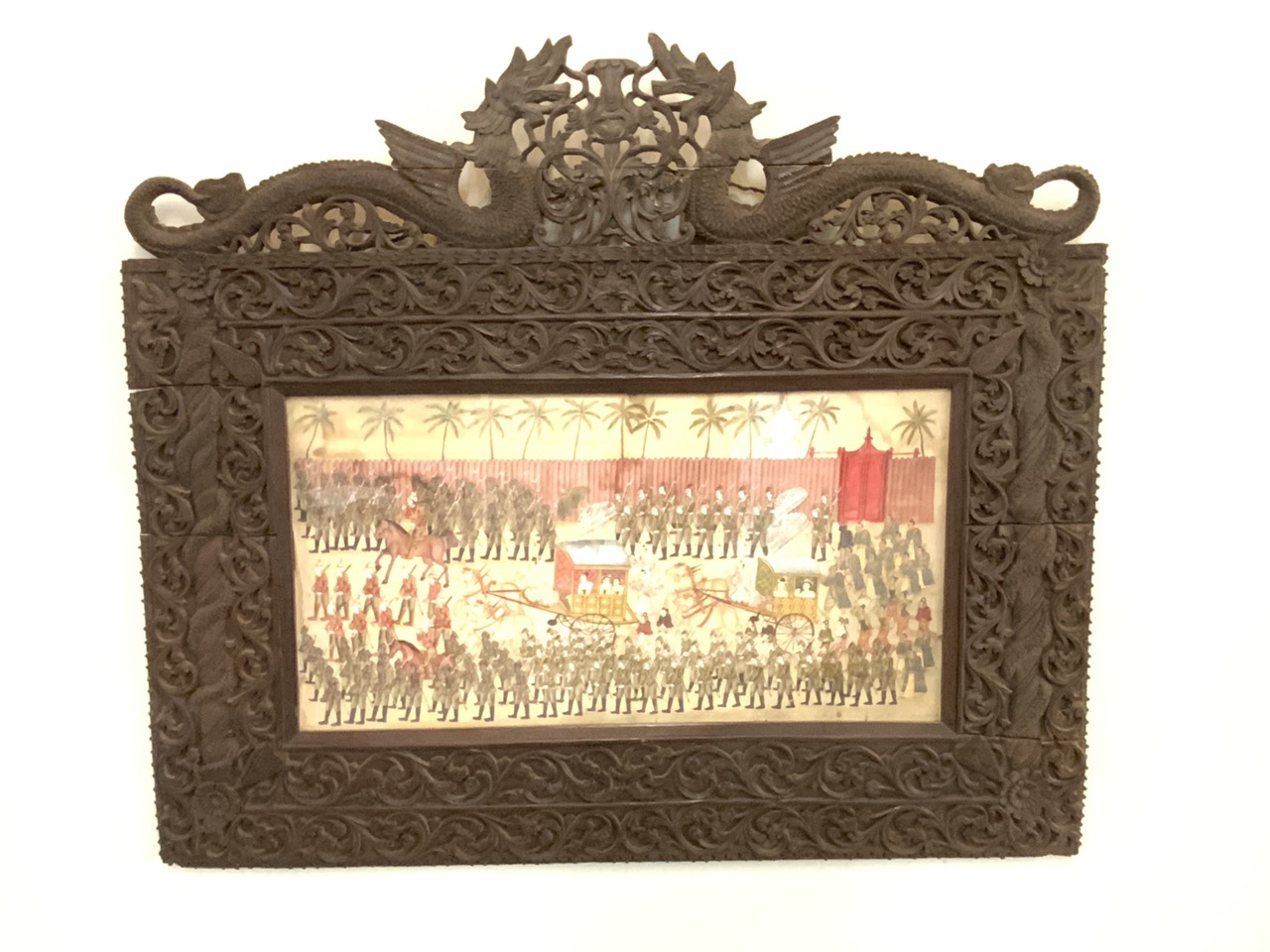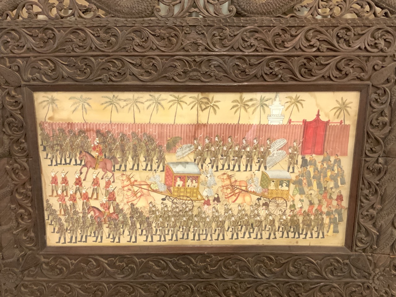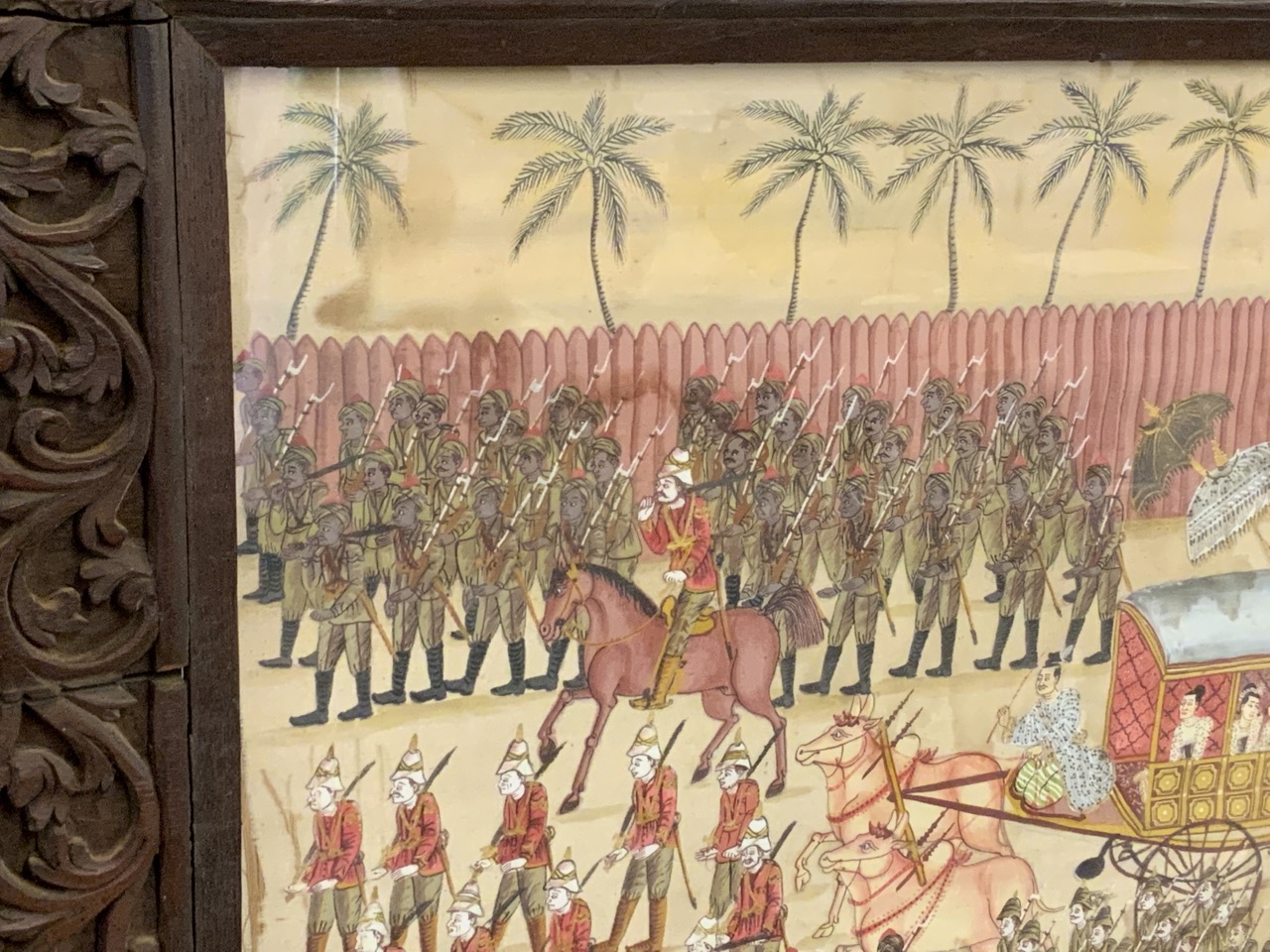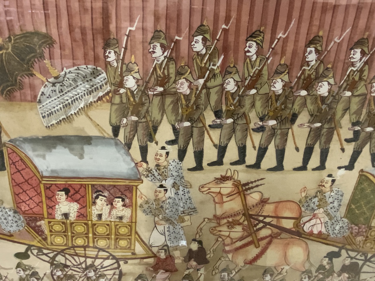 A large framed oil on silk panel of processional of wealthy family with military guards marching along side. Late 19th century.