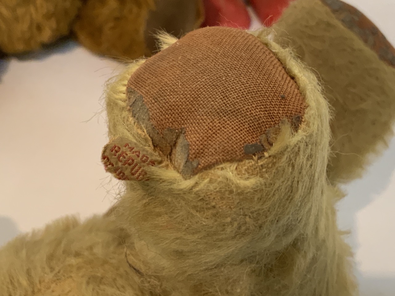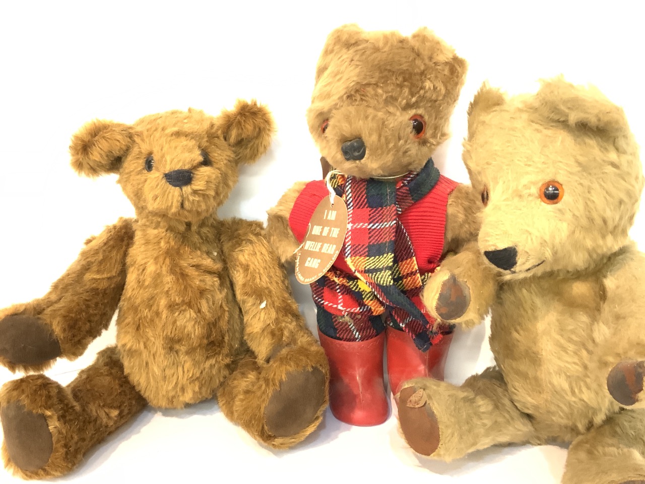 Three (3) Vintage teddy bears. One is unmarked, second Made in Ireland and third (newest) bear is part of the Bear Gang by Laura Grant in Scotland. Good Condition.