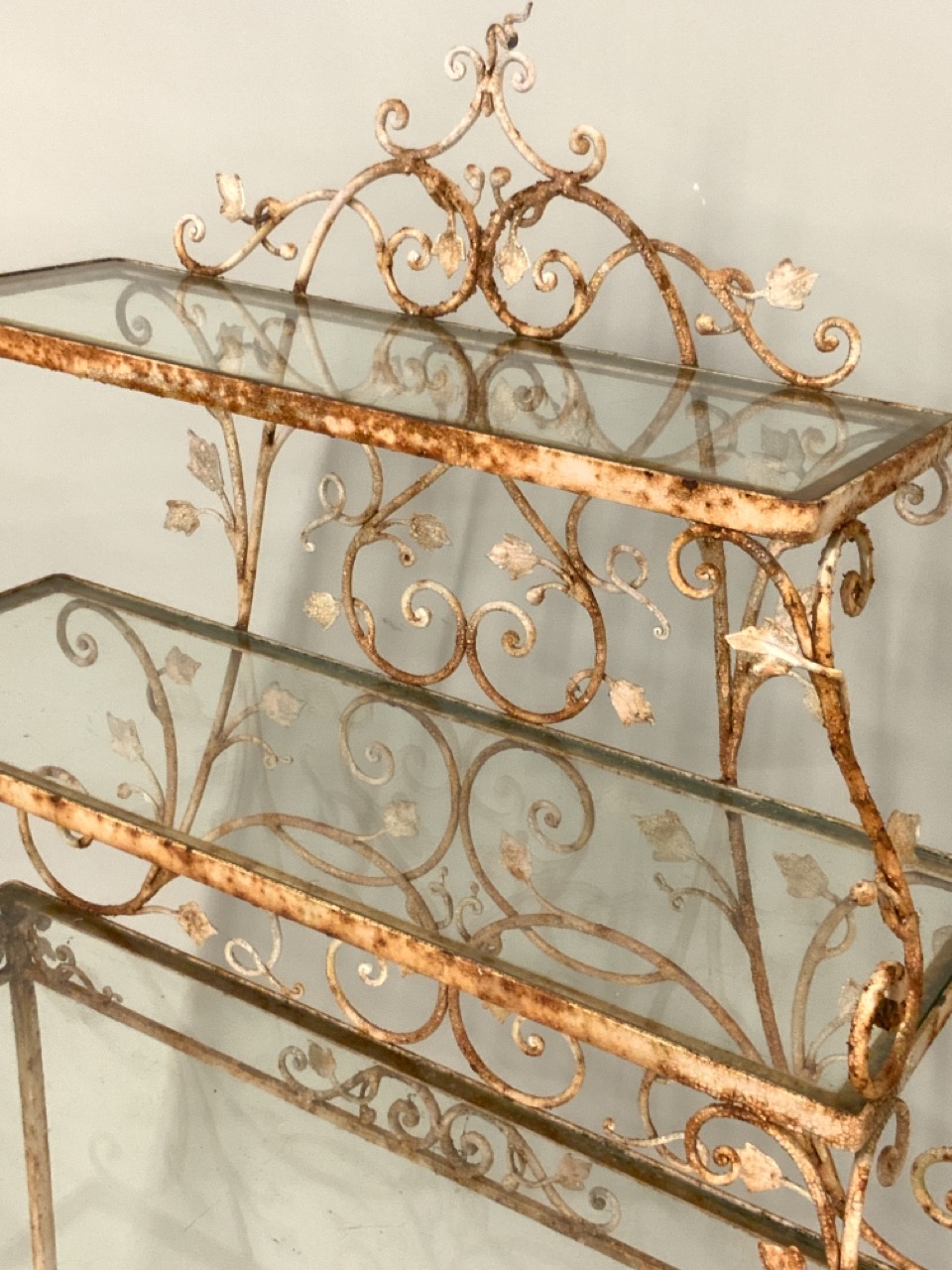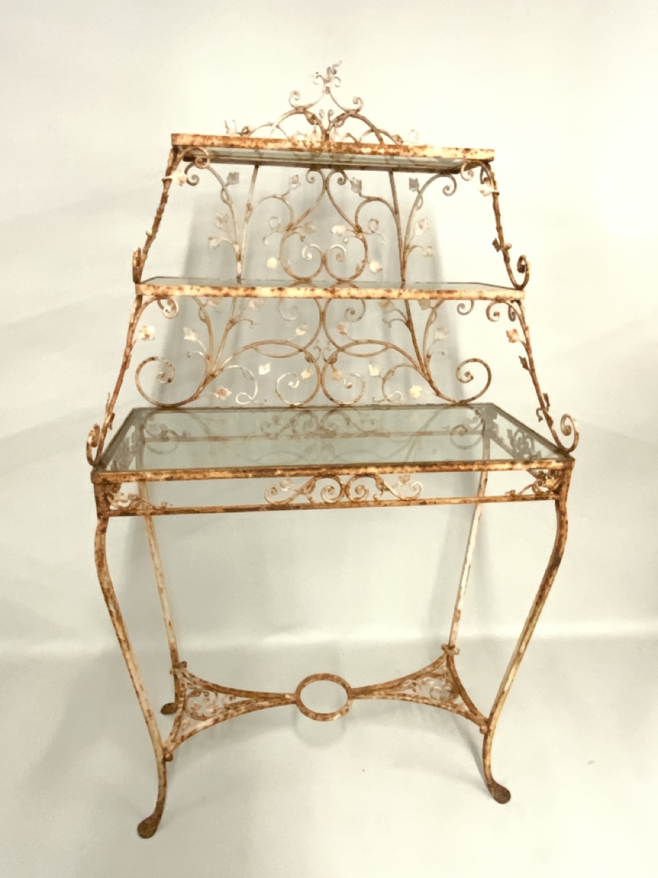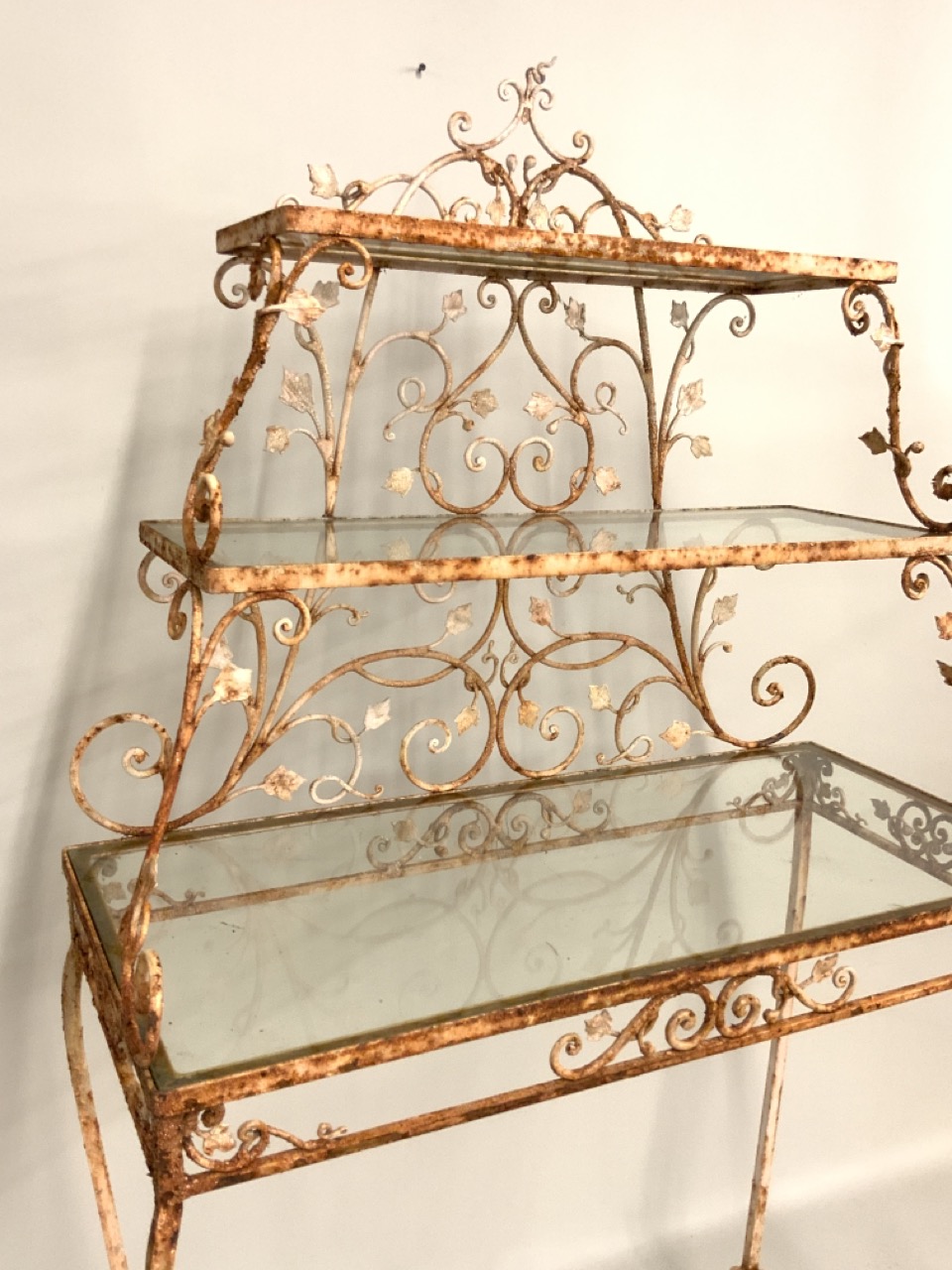 Three (3) tier antique iron three tiere server used as garden plant stand.