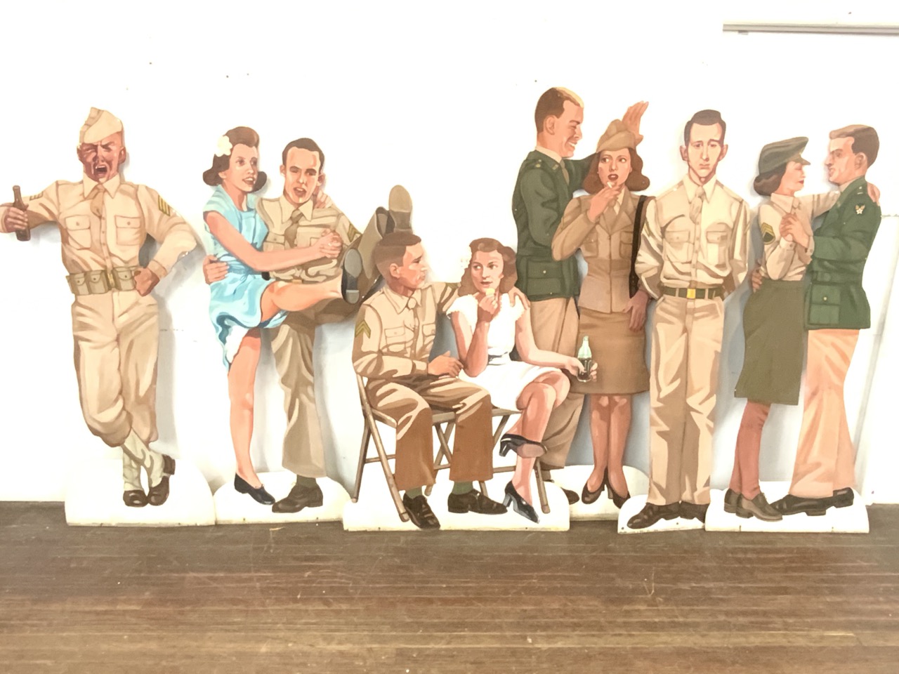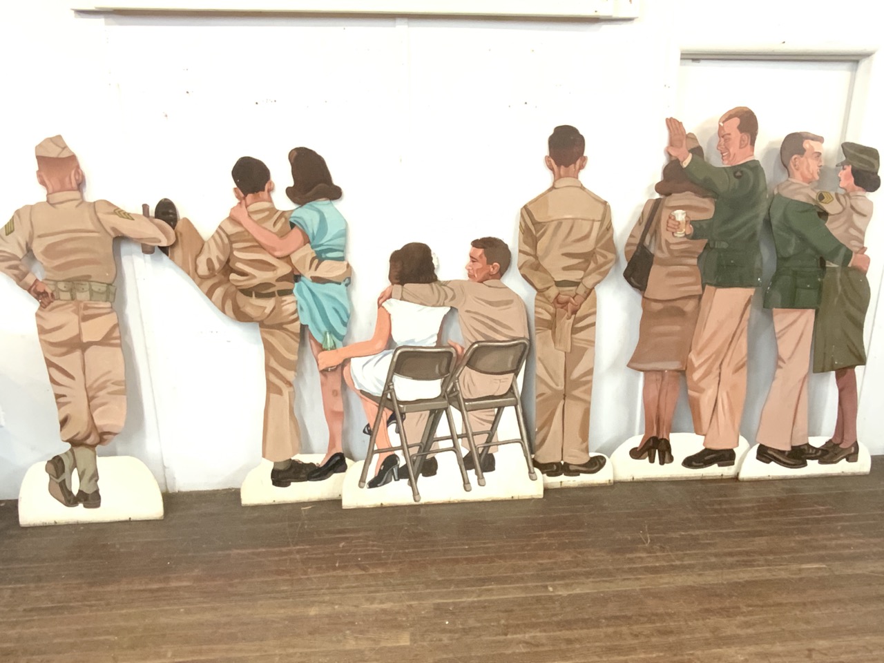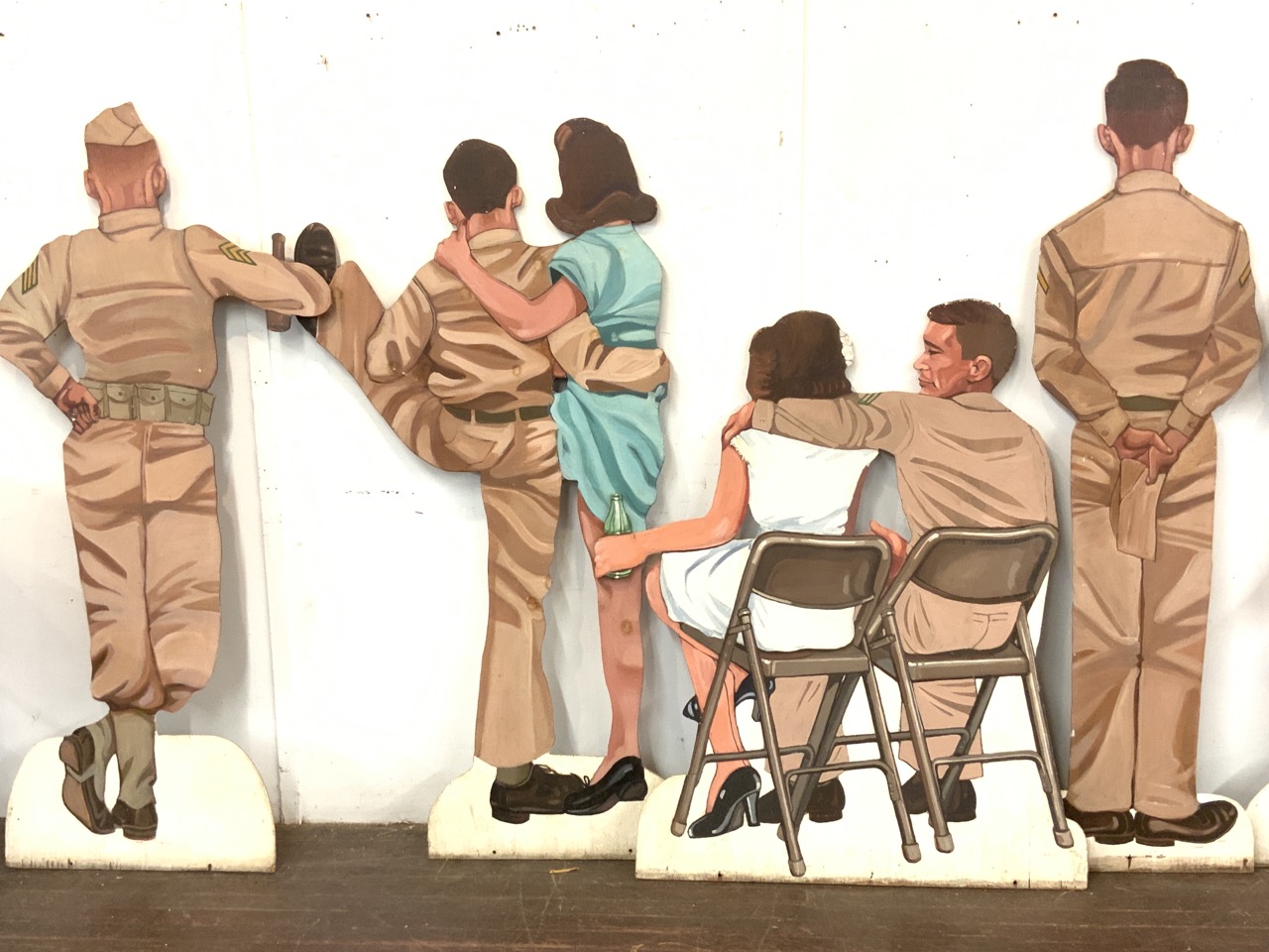 Six (6) life size U.S. Army stage props. USO type of dance scene. Each oil painted wood panel is double sided showing front and back of duos and single soldiers. Illegibly signed and dated 1975.