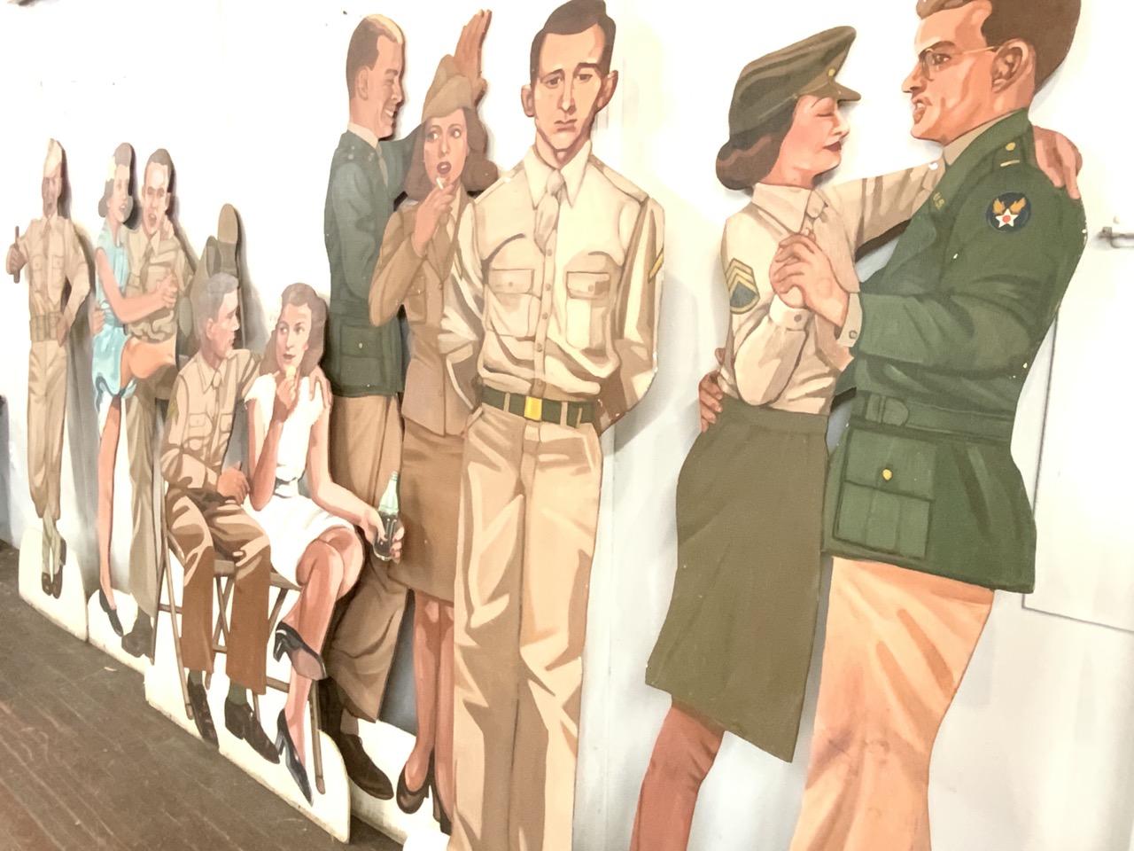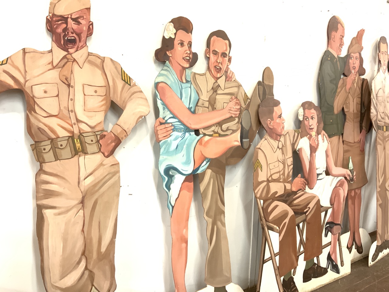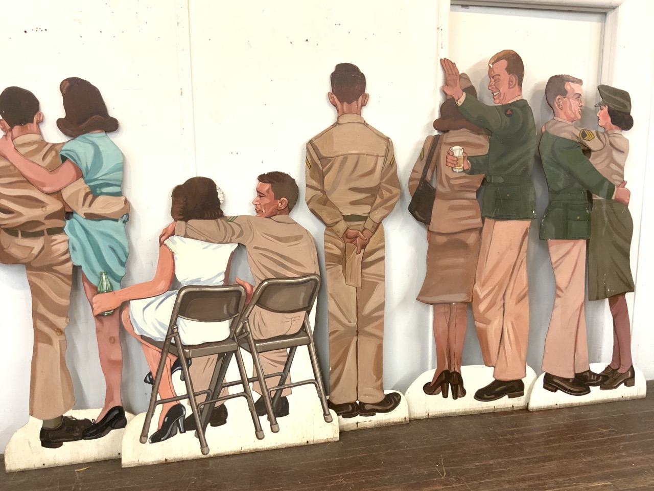Six (6) life size U.S. Army stage props. USO type of dance scene. Each oil painted wood panel is double sided showing front and back of duos and single soldiers. Illegibly signed and dated 1975.