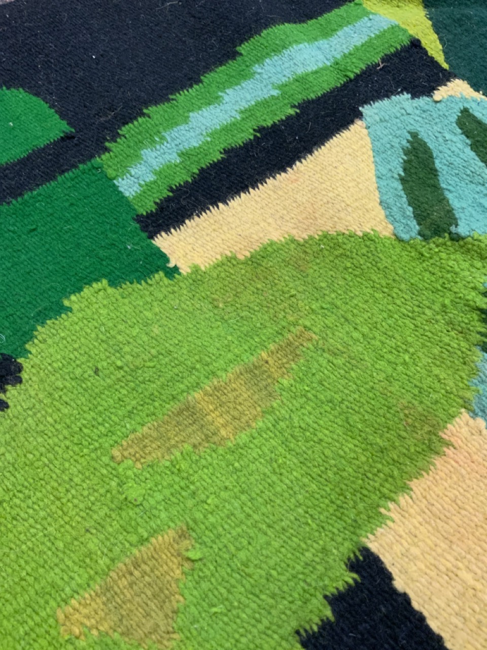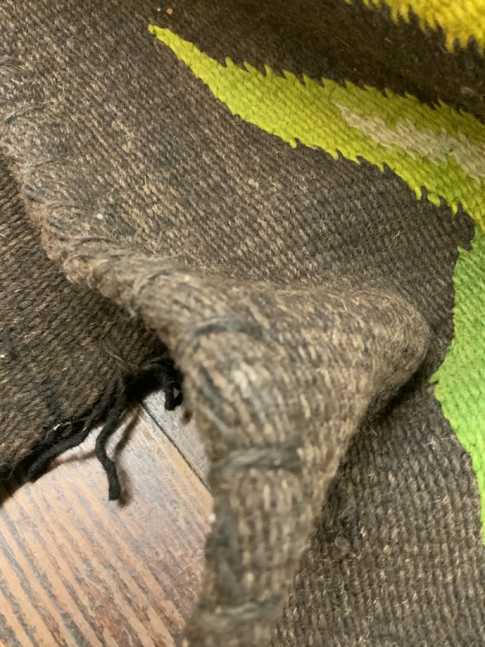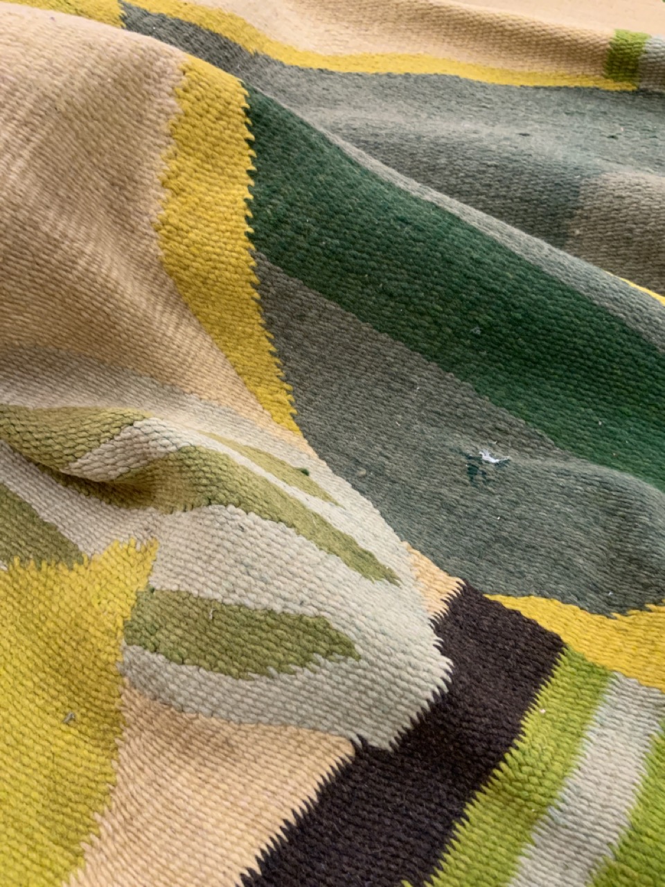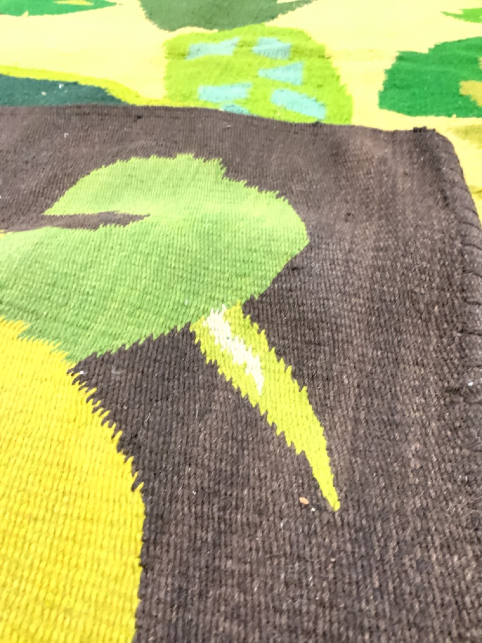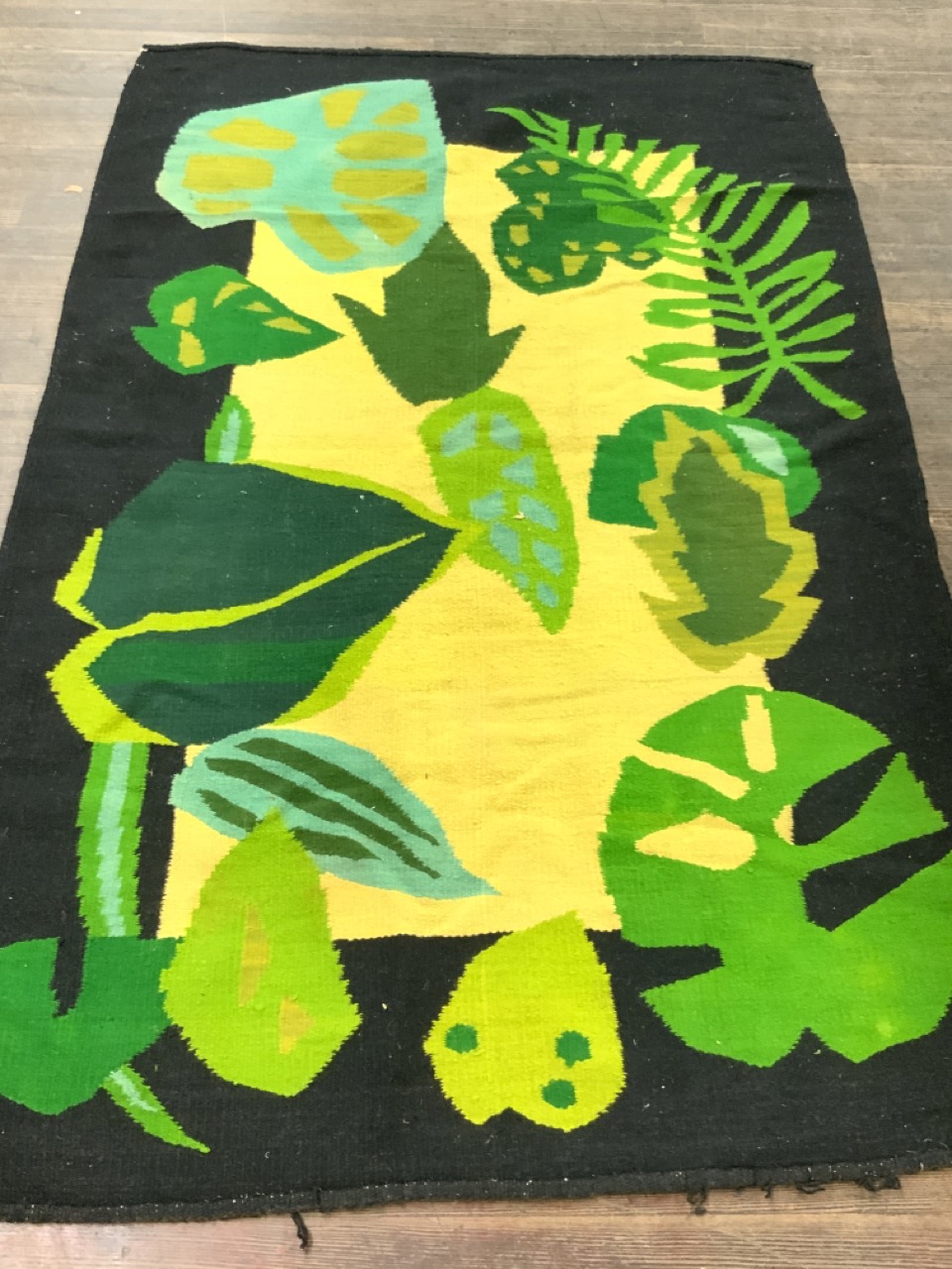 Vintage Handmade wool rug with Botanical greenery pattern.