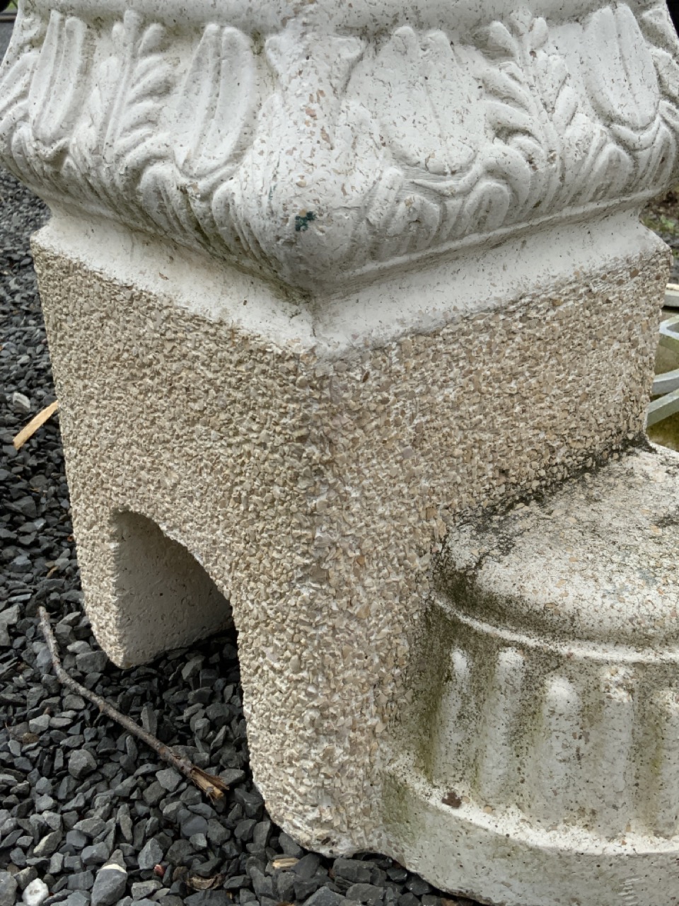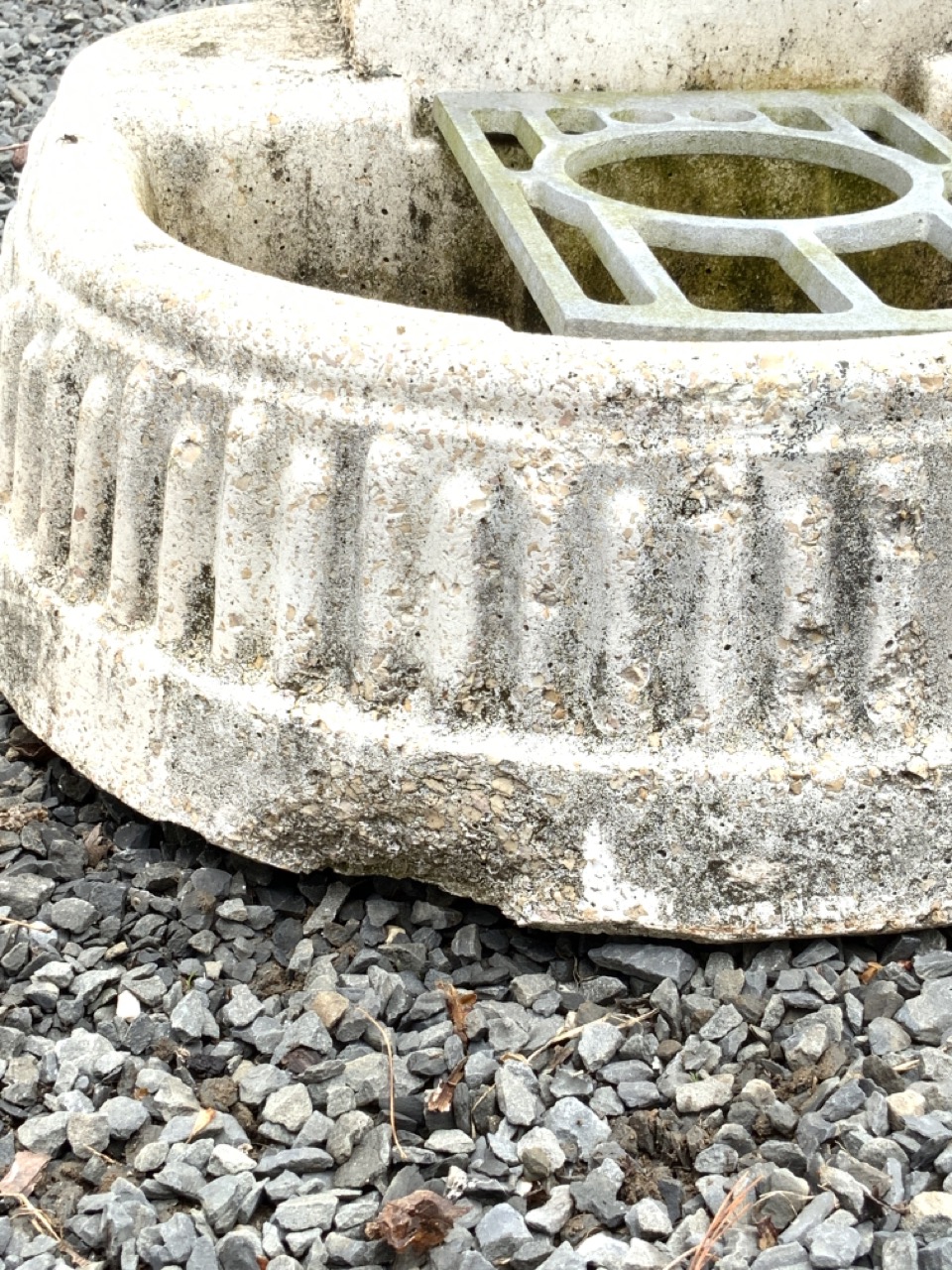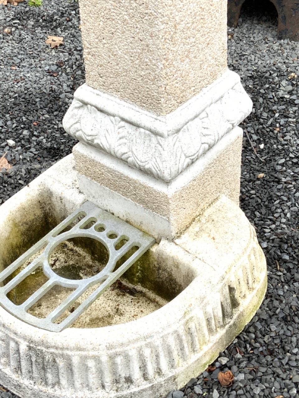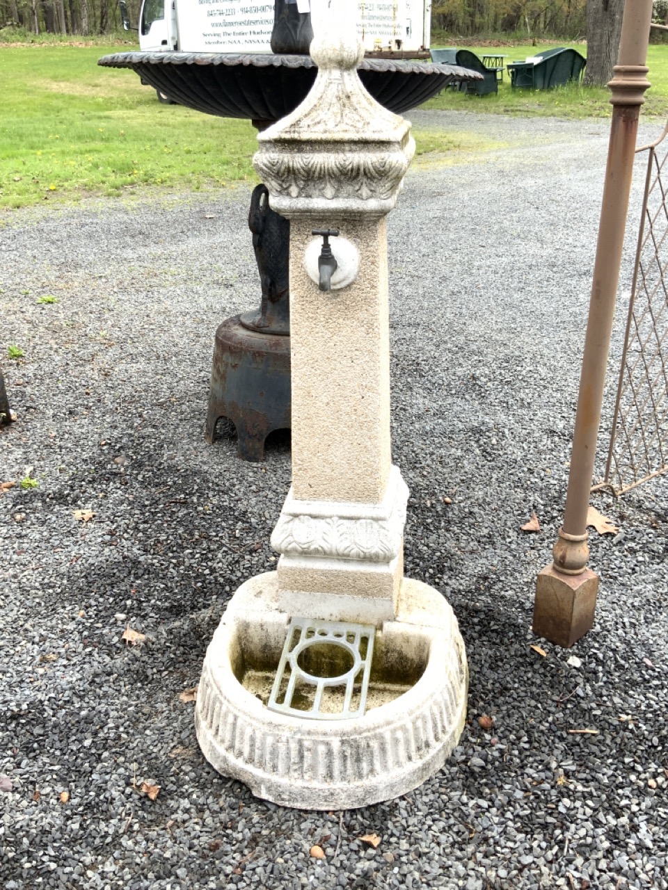 Free standing stone water fountain. Opening in back for plumbing. chipped stone left side front. Please see photograph preview or call.