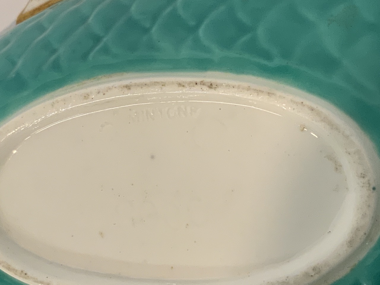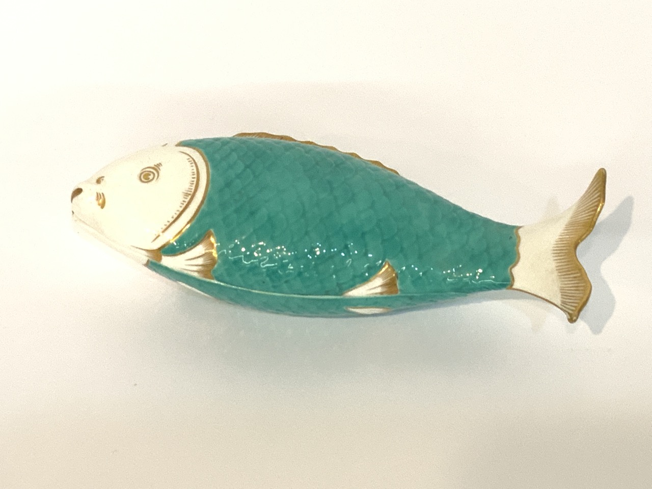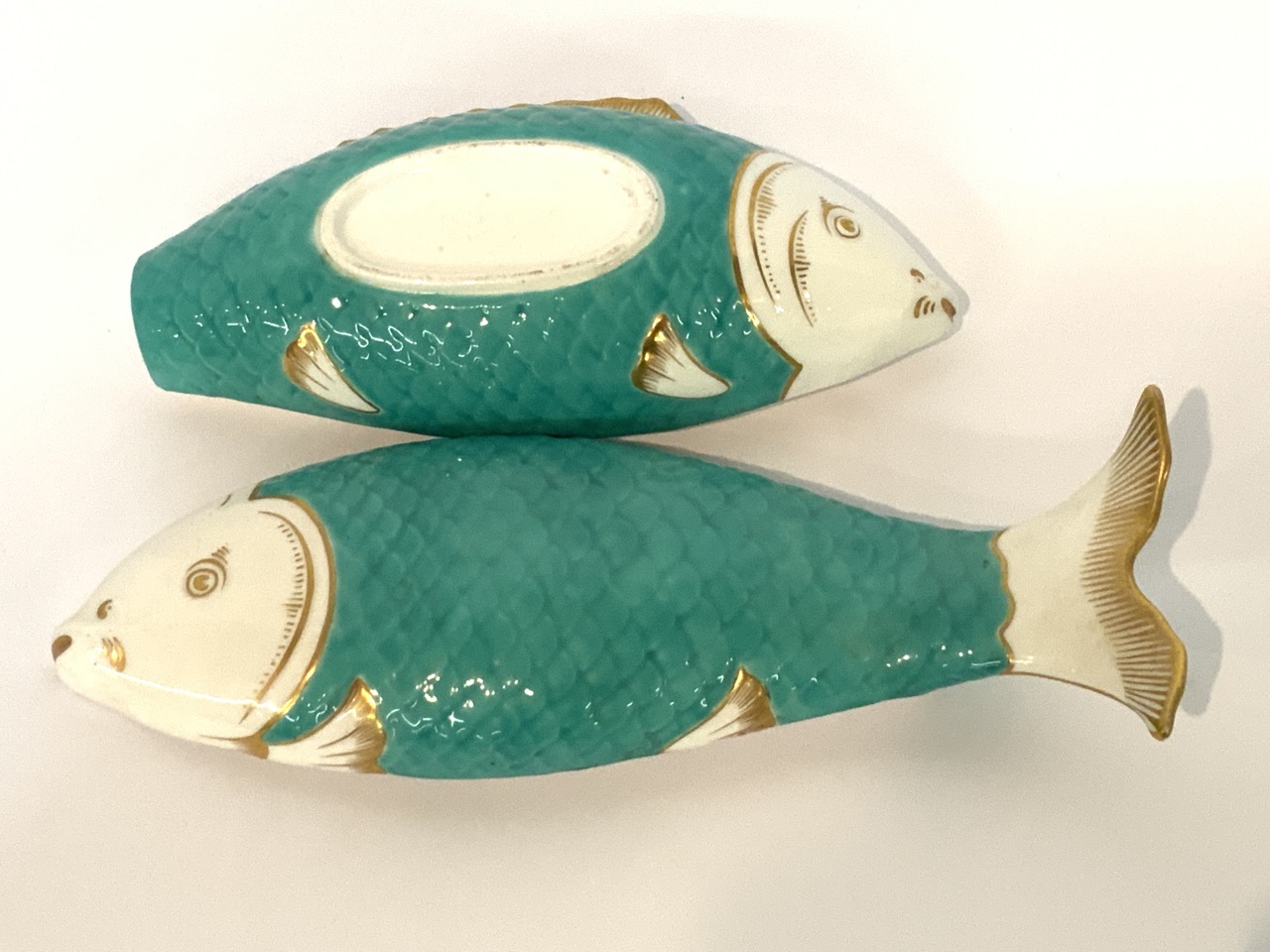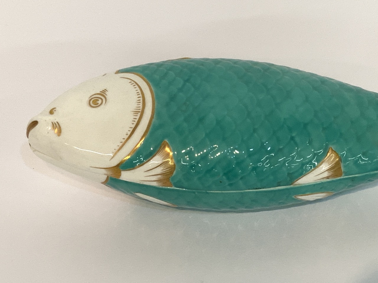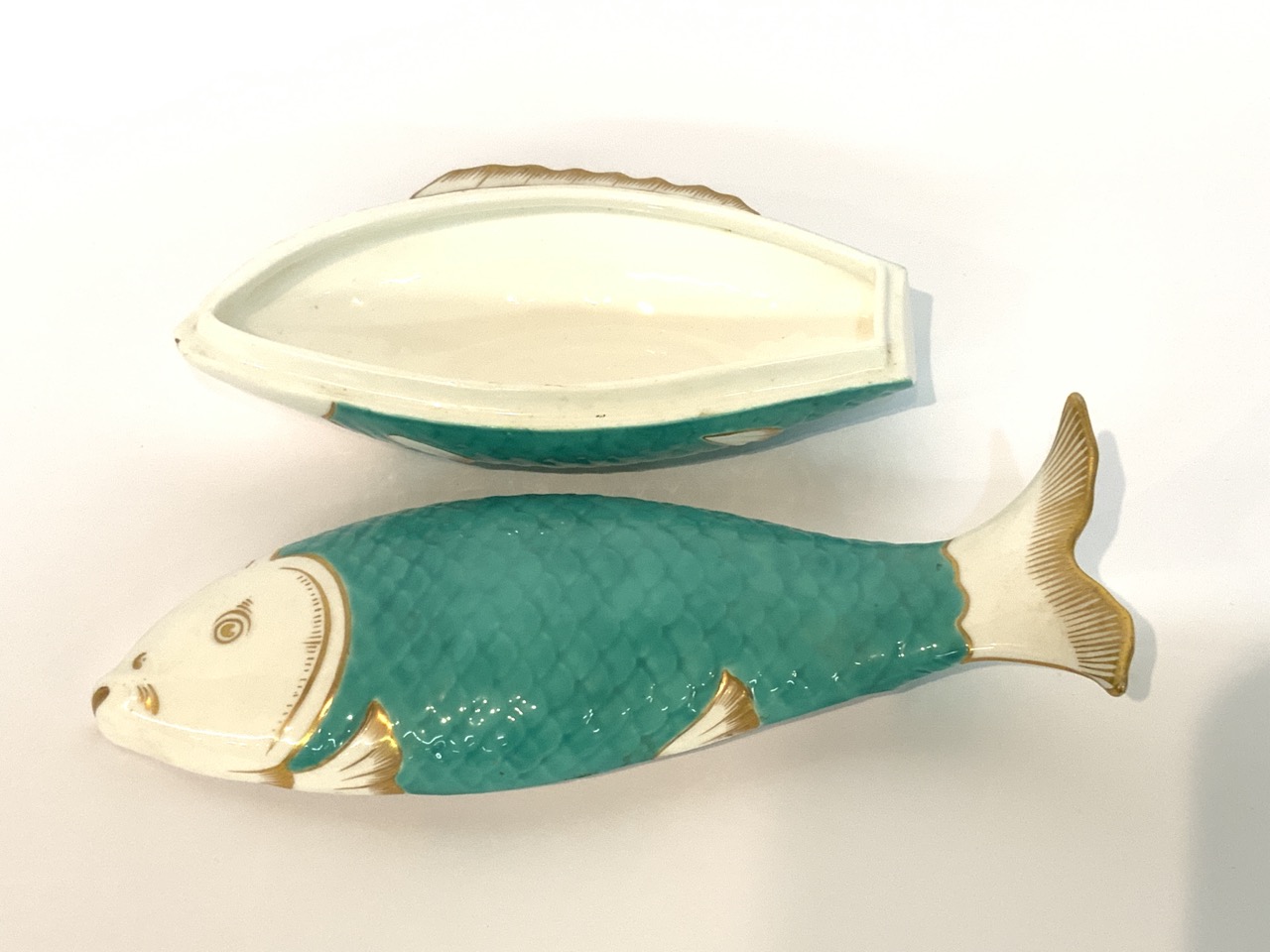 Minton sardine box. 19th century. Double sided fish head lidded dish with green and gold trim decoration.