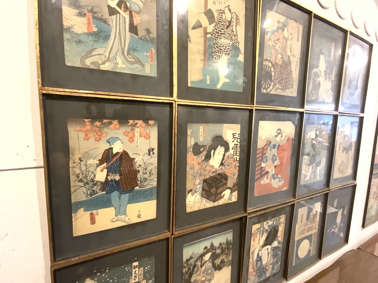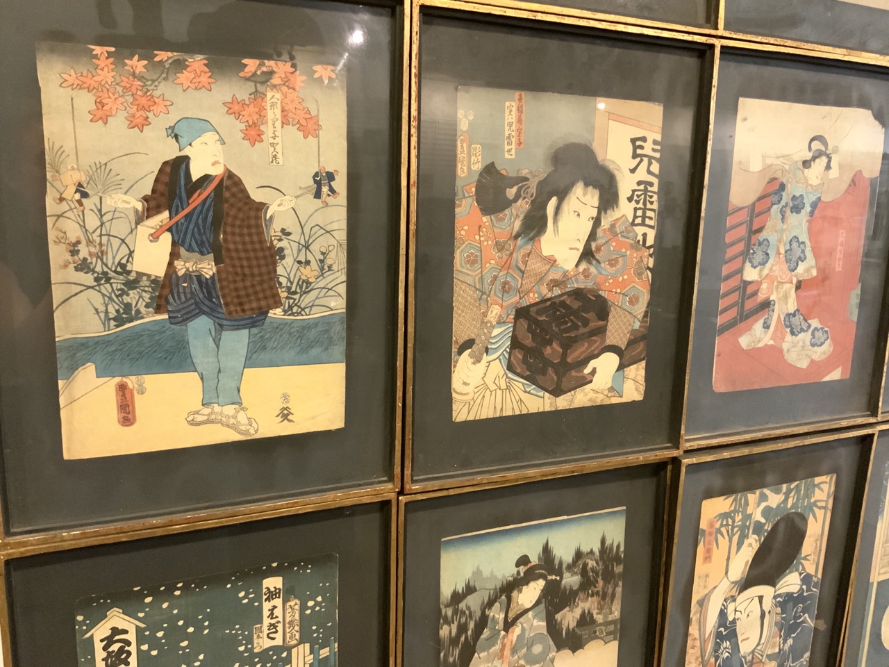 A collection of Fifteen (15) Japanese Wood block prints. All professional layed on black matting. Set in matching black lacquered frames. Various artists. Please see photograph preview or live inspection available.