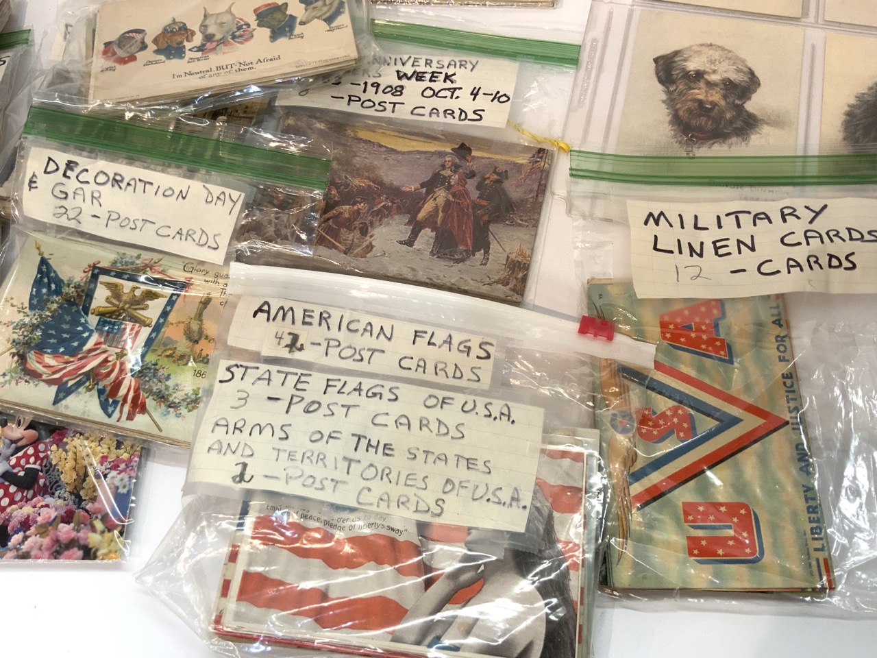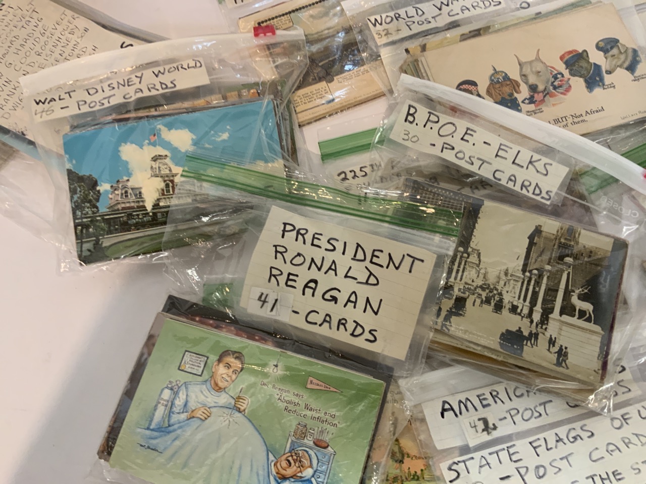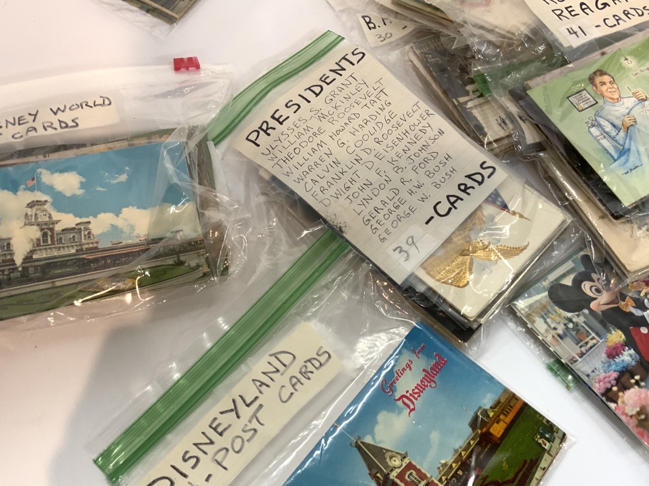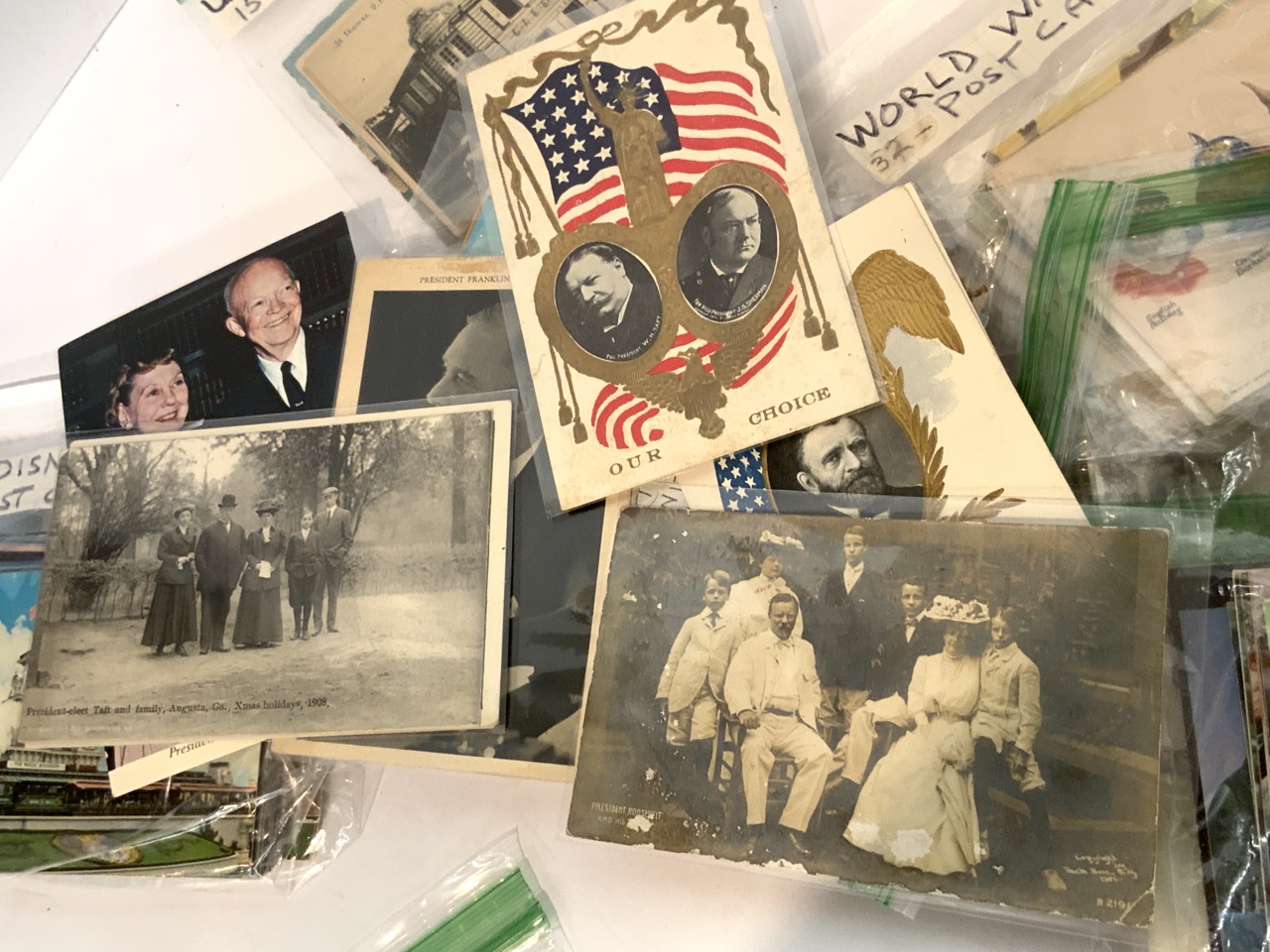 Large Postcards grouping including Military linen cards, American flags, Presidents, Walt Disney World, Carter, Reagan, Teddy Roosevelt etc. Please see photograph preview.