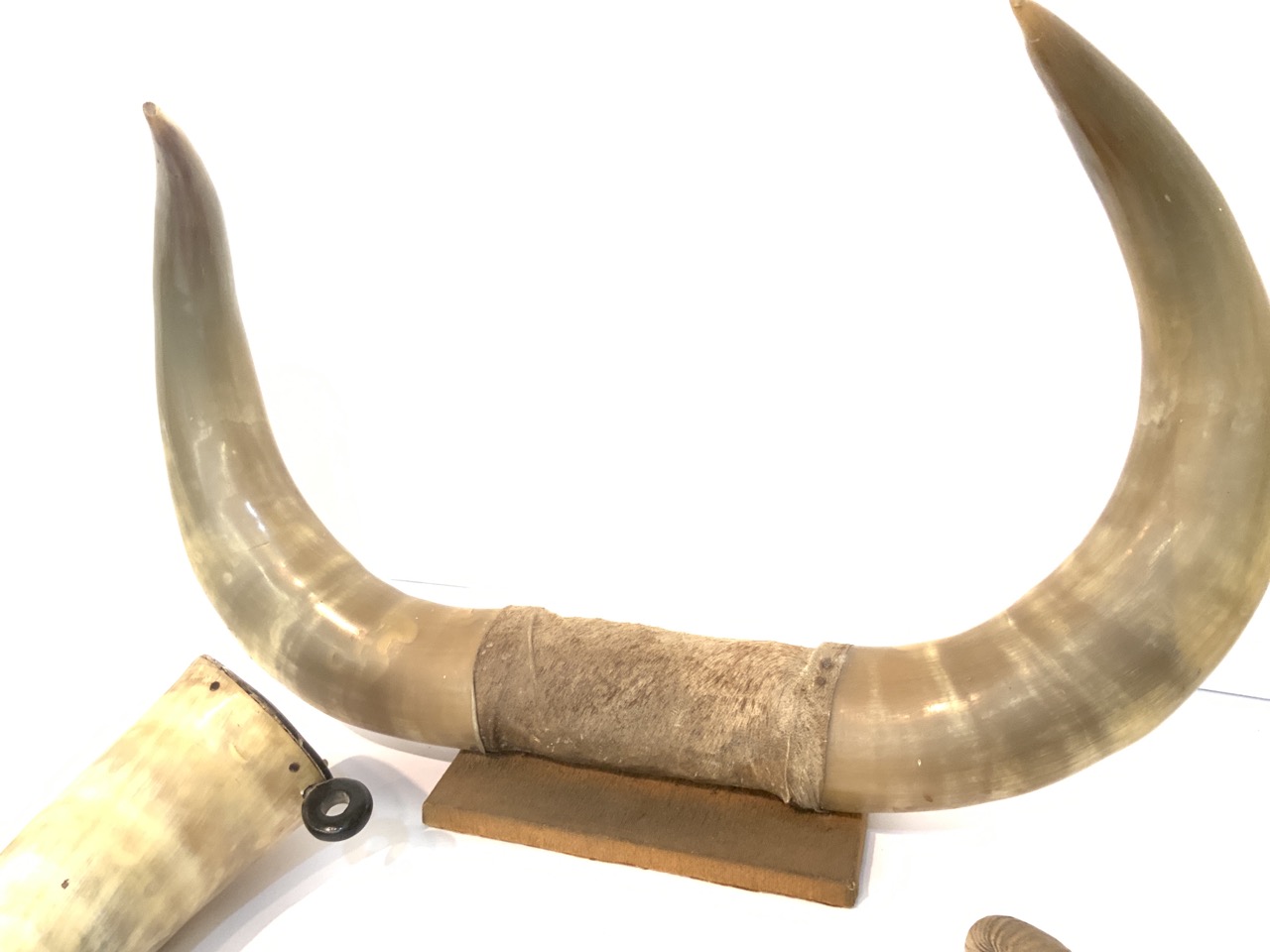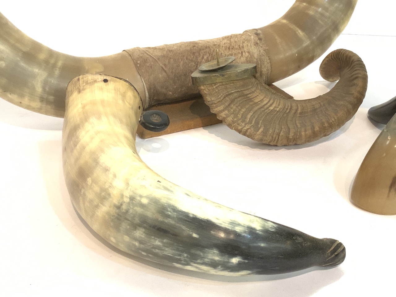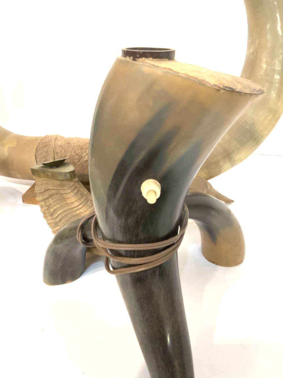Five (5) Horn related objects. Lamp, candleholder, flask etc.