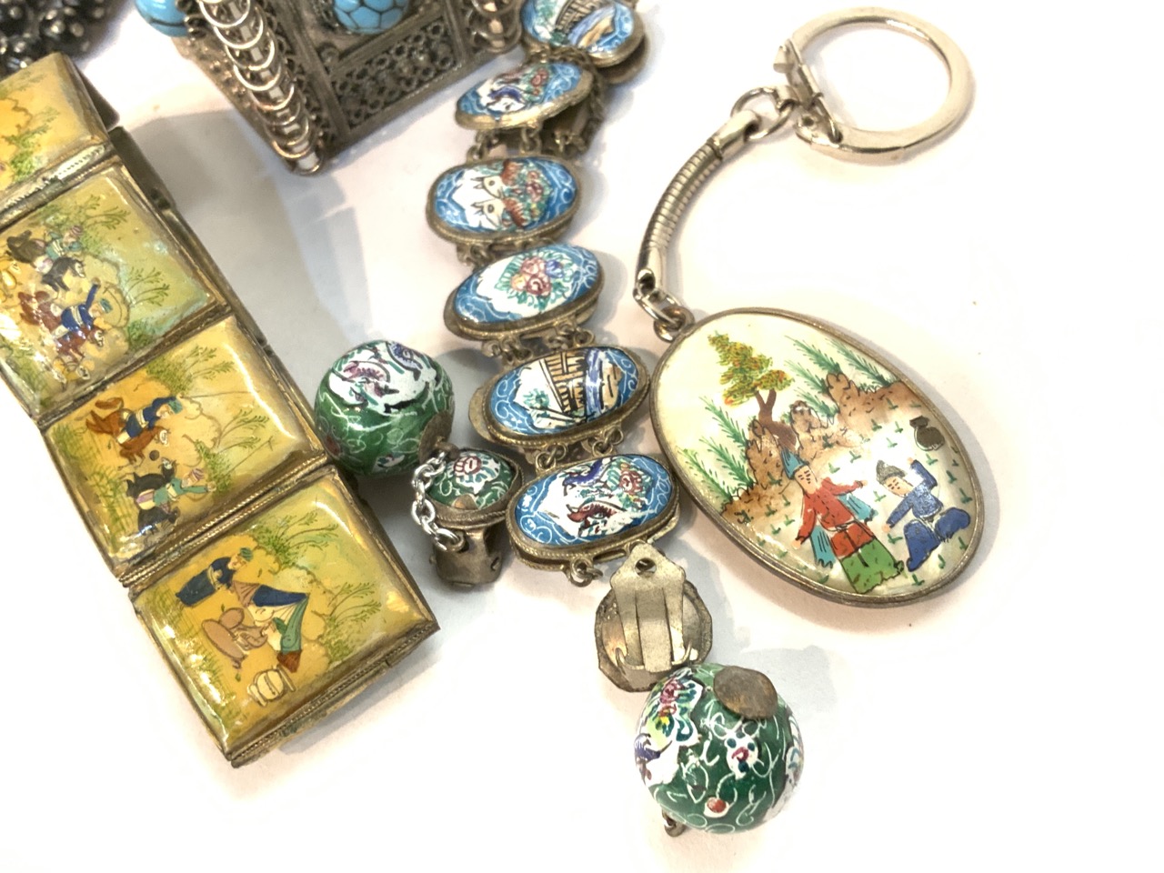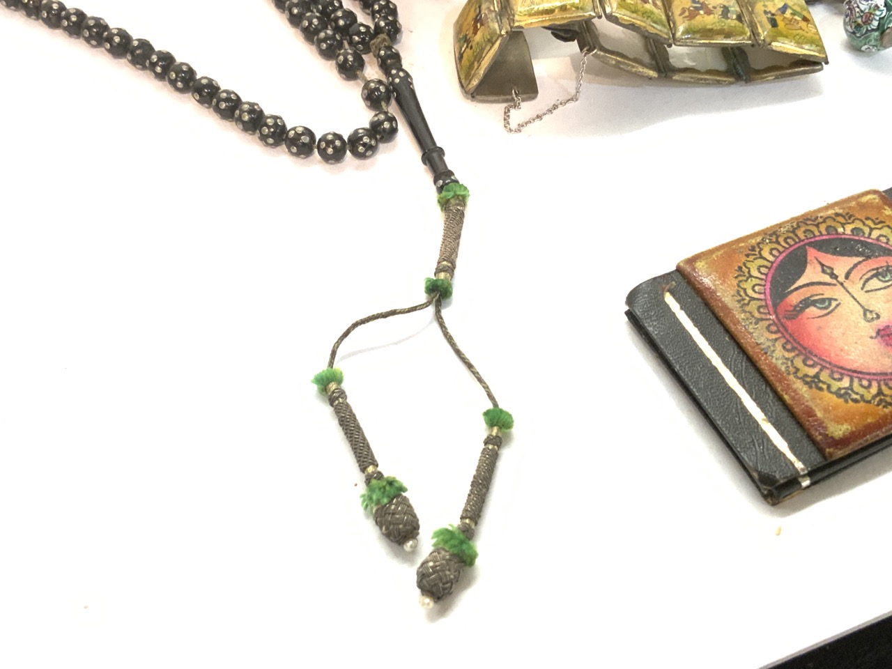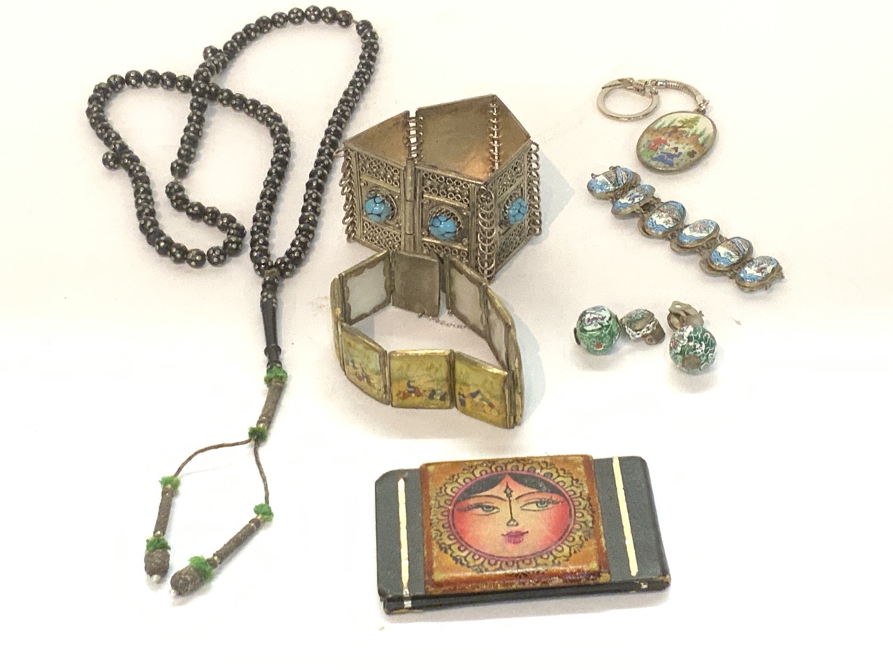 Assorted vintage Persian jewelry group. Necklace, bracelets, compact, fob etc.