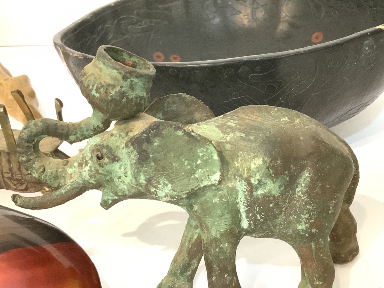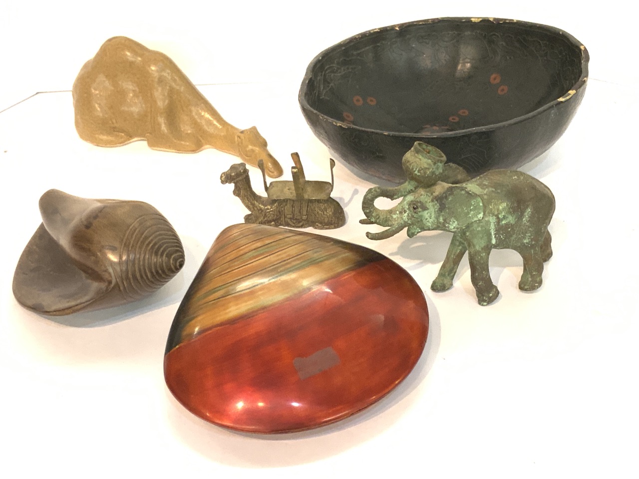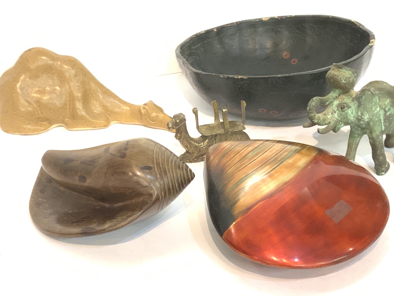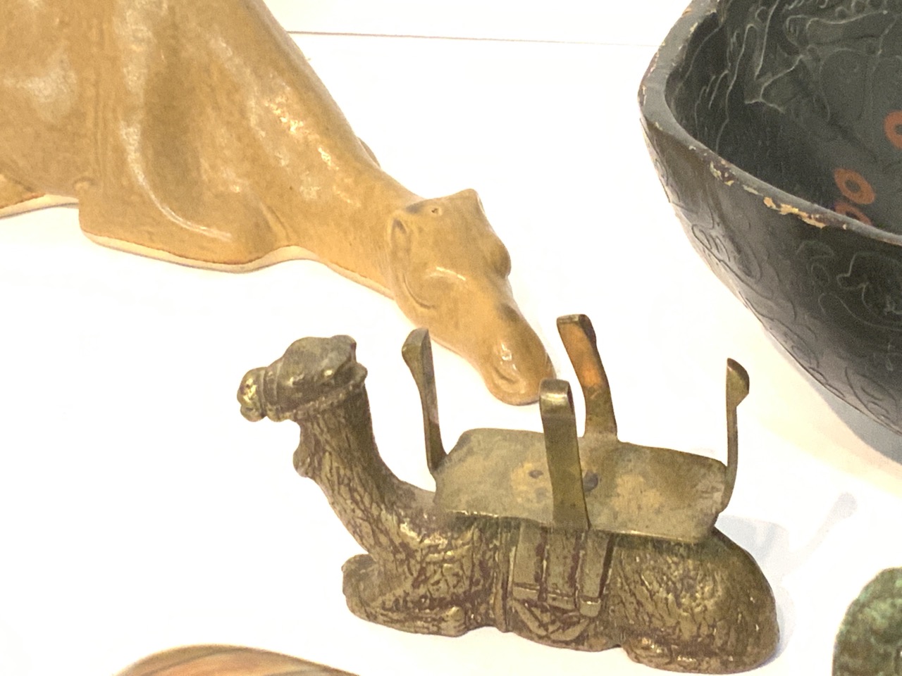Decorative group lot. Pottery camel, metalware camel match holder, lacquerware shell box, bowls, elephant candlestick etc.