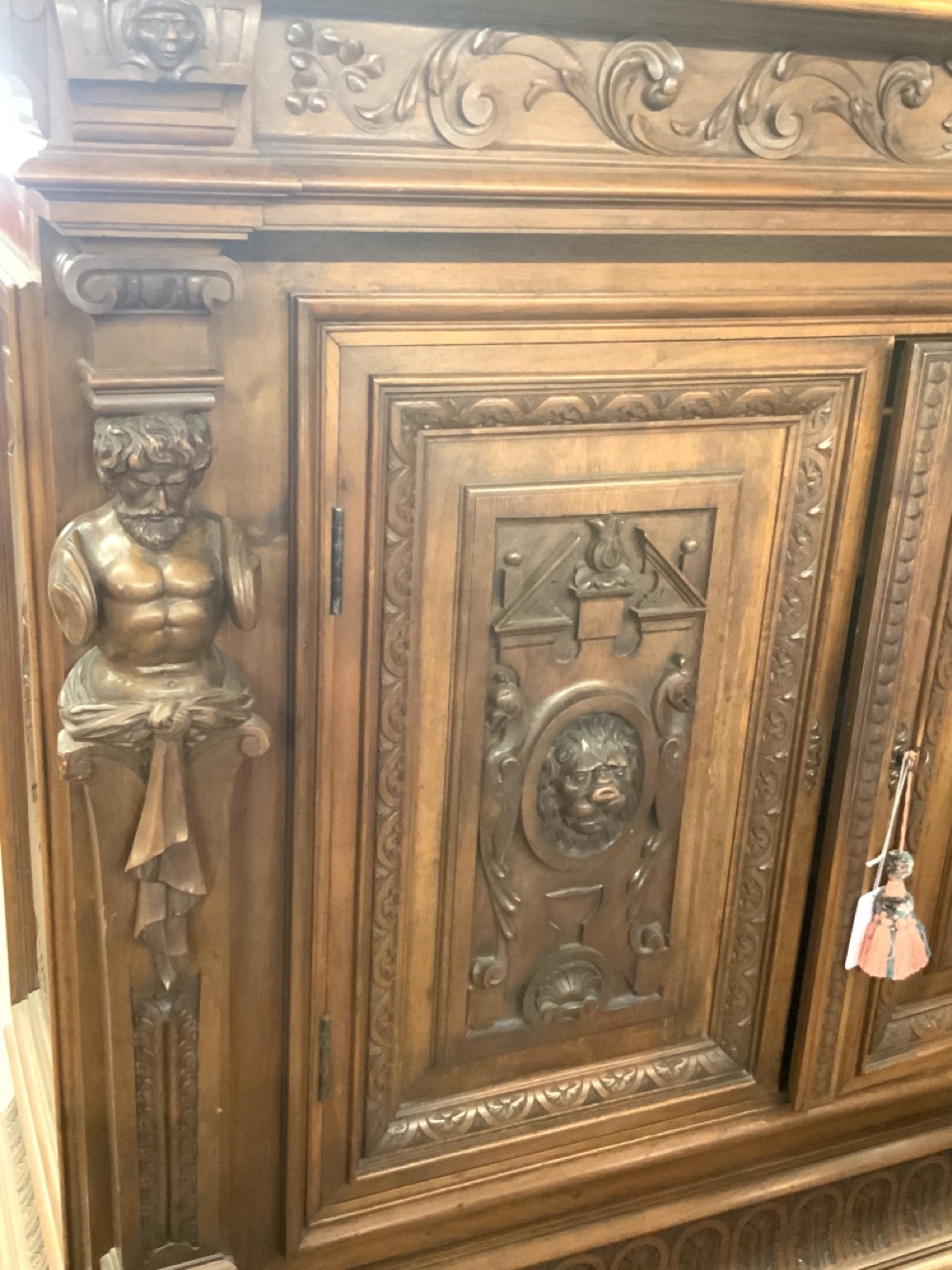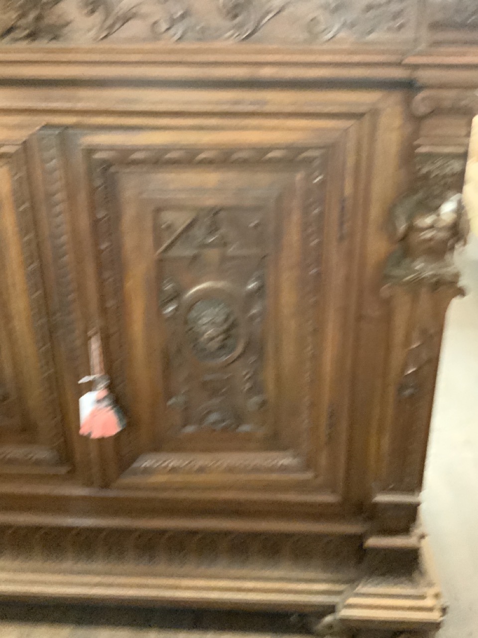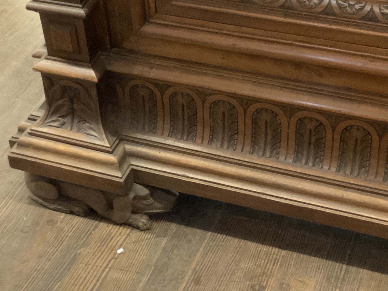 A 19th century heavily carved Renaissance revival cabinet. Unusual Daschund full bodied dogs as feet.