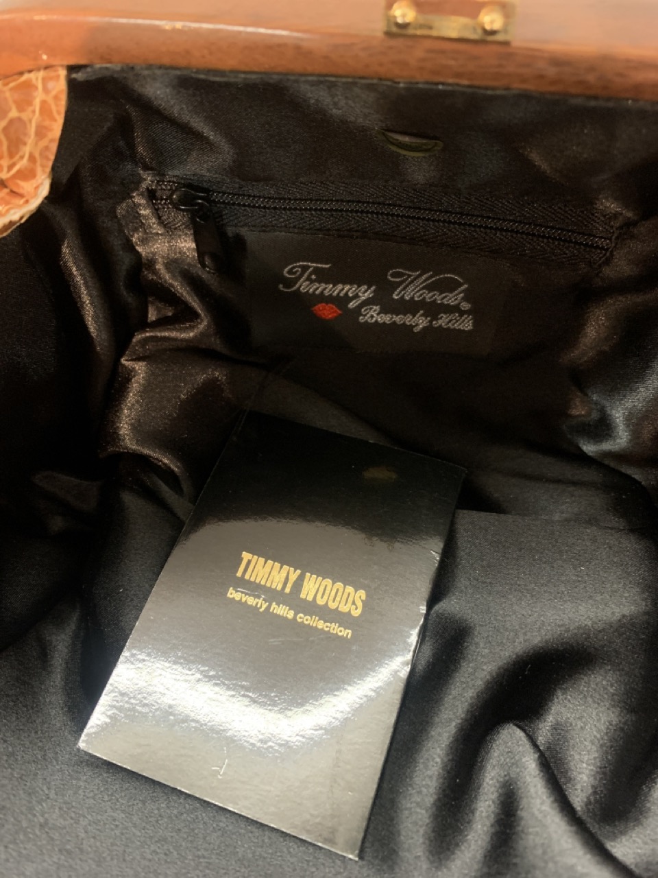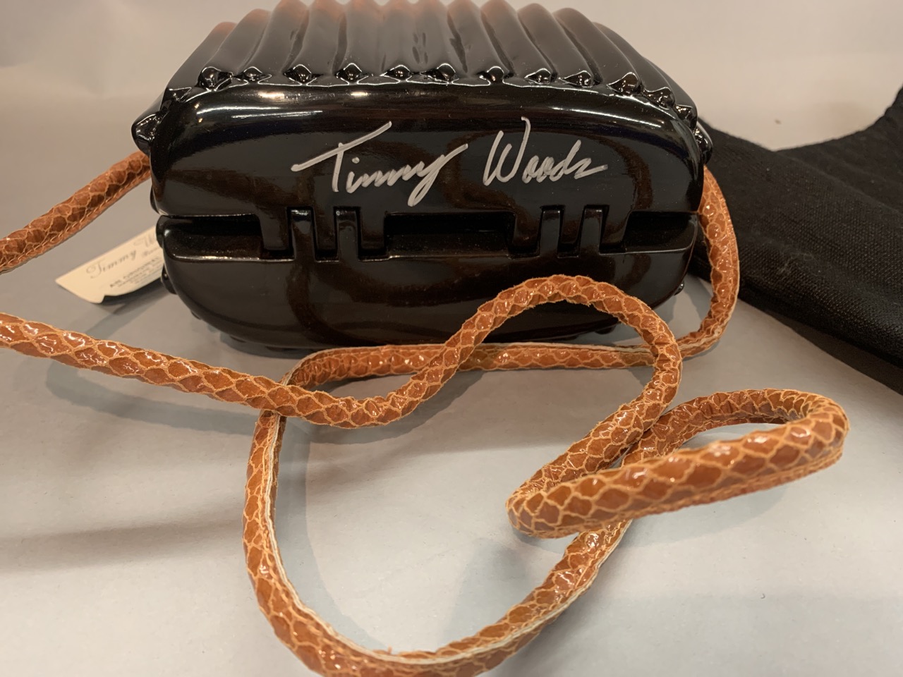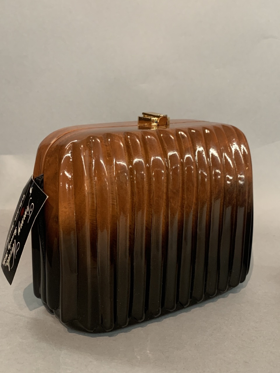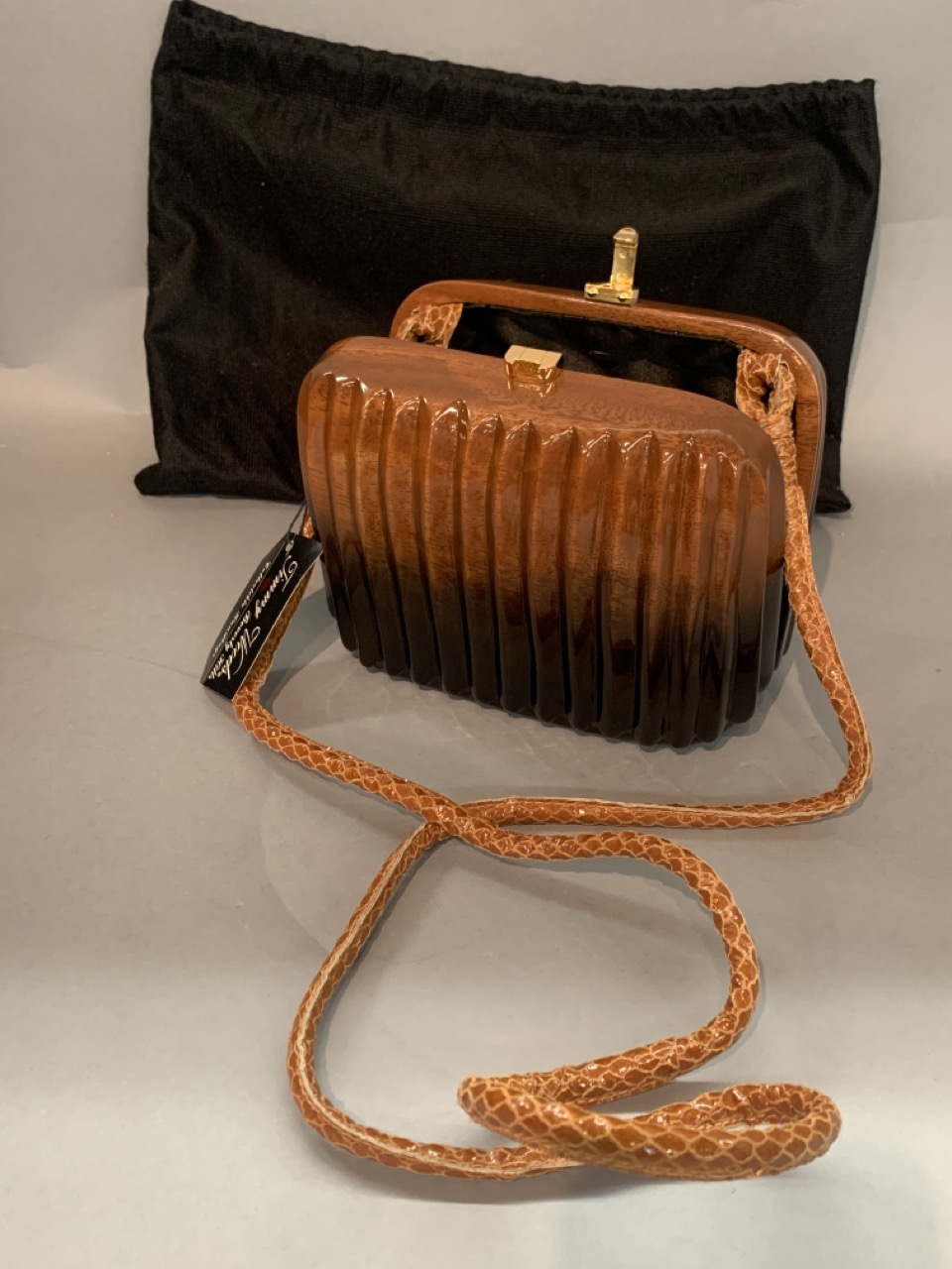Timmy Woods Beverly Hills an original art piece handmade and hand crafted from Acacia wood. Clutch bag with optional crossbody strap.