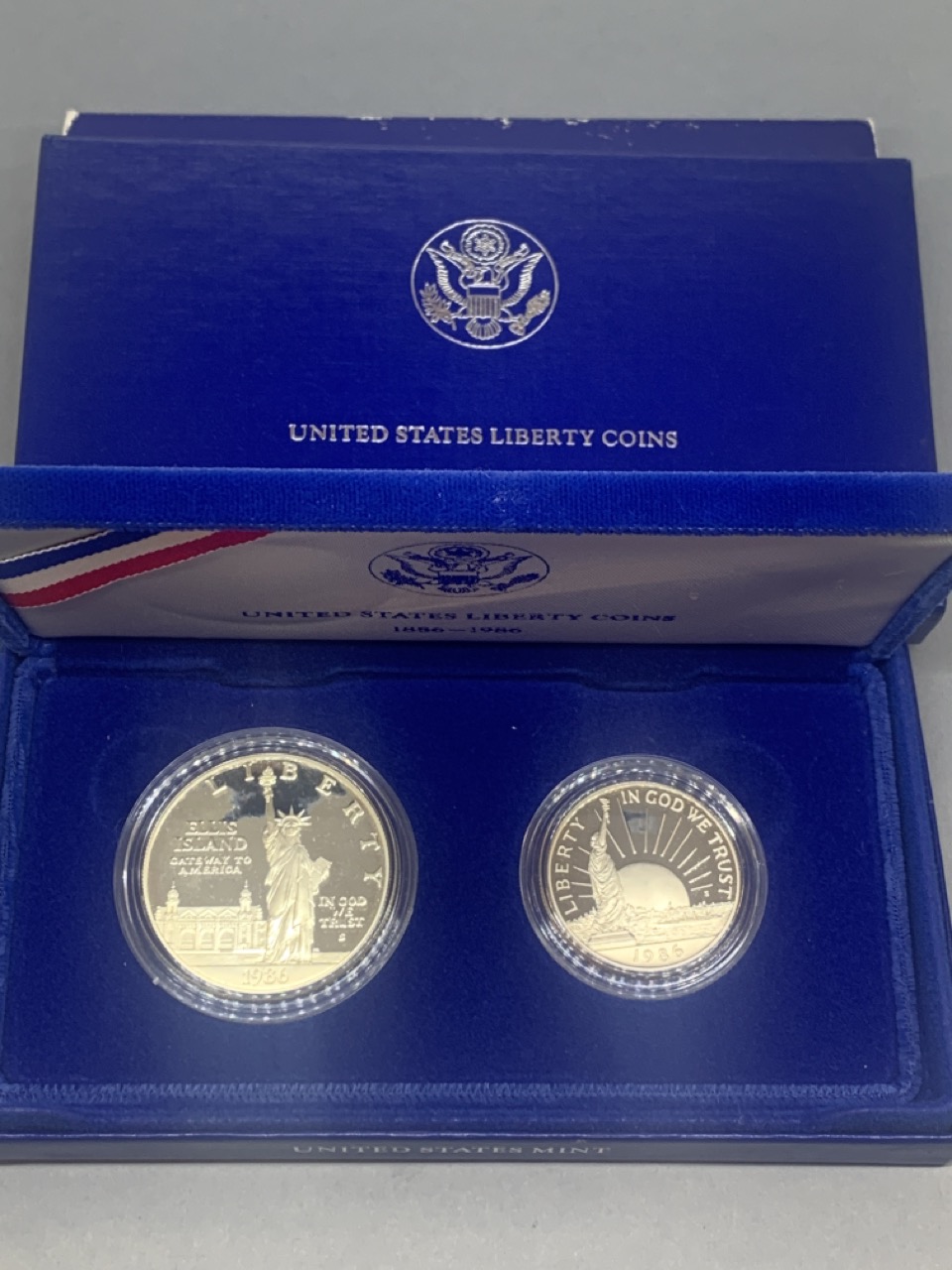 1986 US Liberty/ Ellis Island silver dollar and half dollar issued by the United States mint with box.