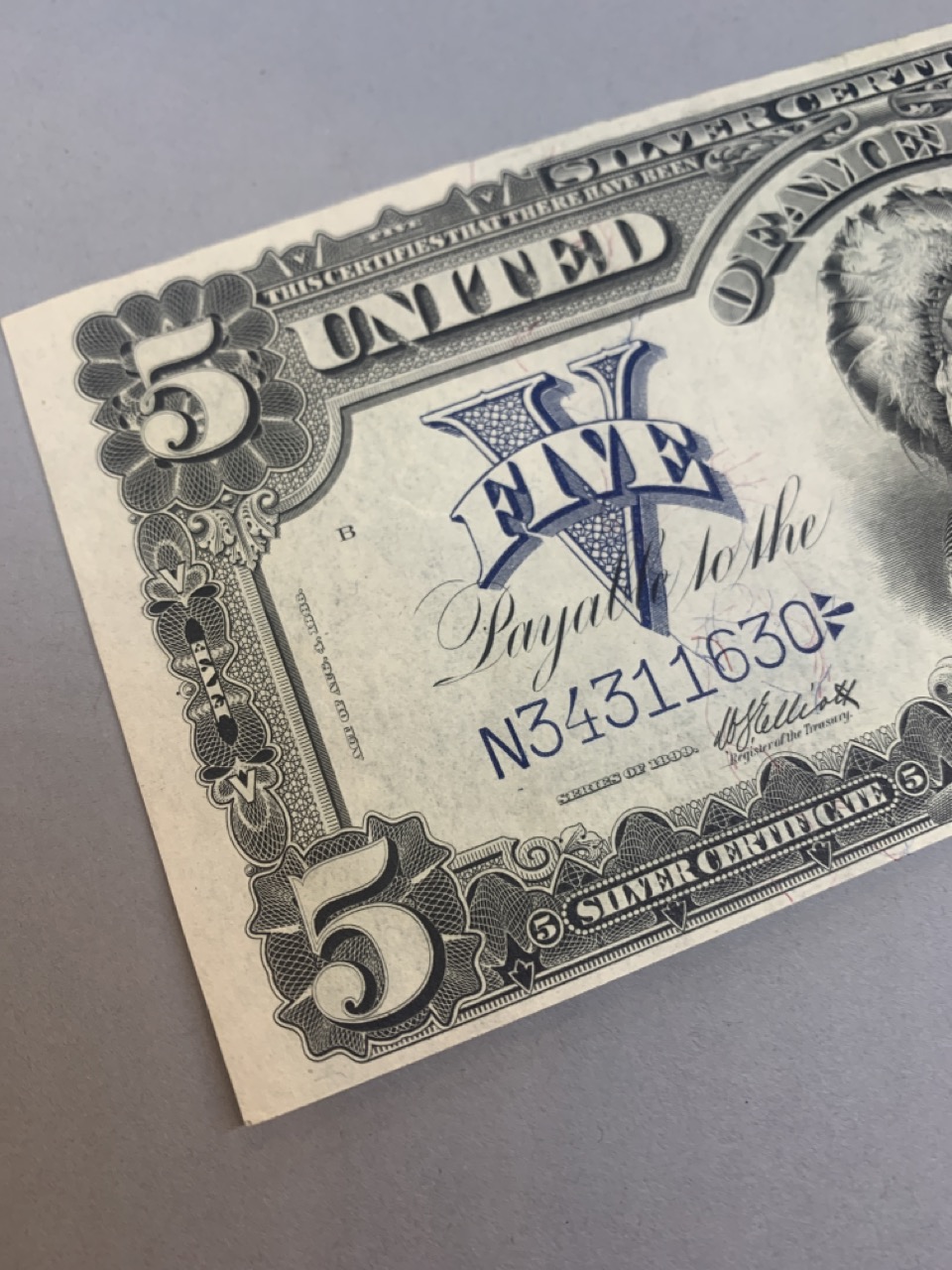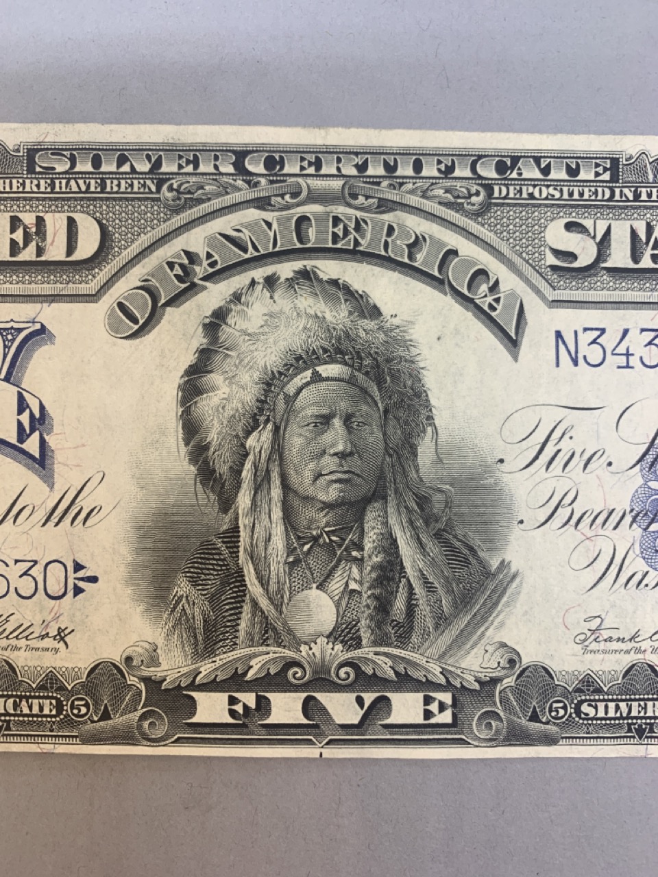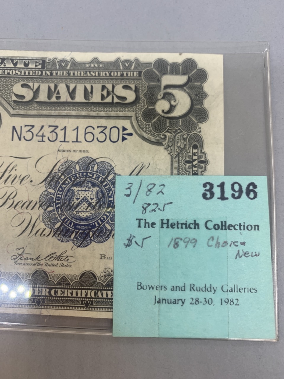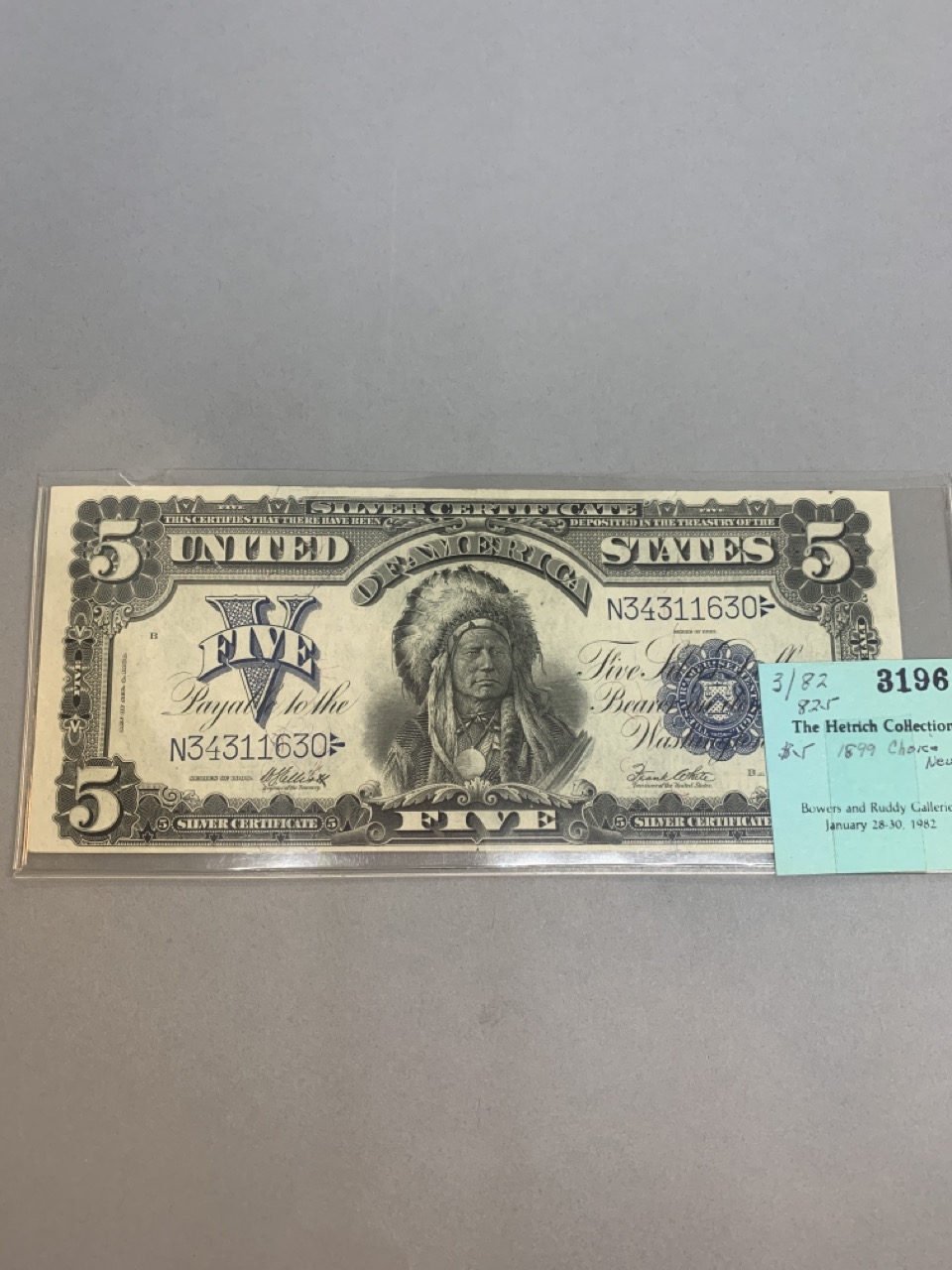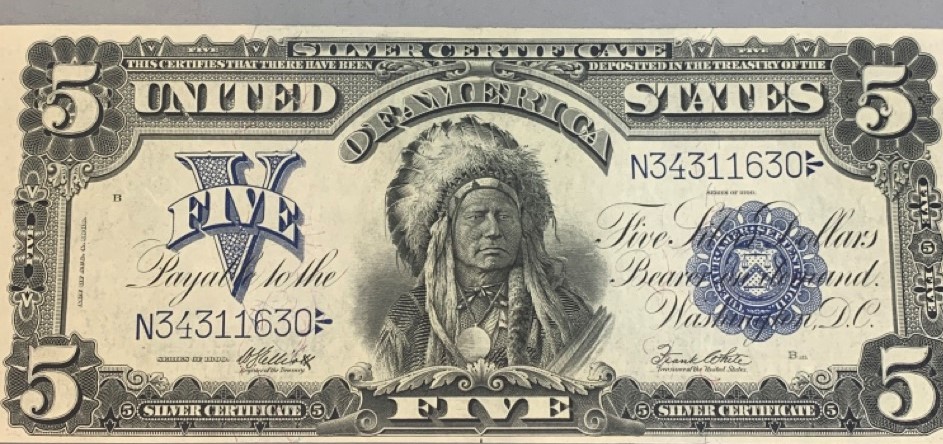 1899 Choice $5 Indian Chief silver certificate. Provenance: The Hetrich collection, Bowers and Ruddy Galleries January 20 8–30, 1982 Lot 3196. Paper currency collection offered in this sale has been stored away in safety deposit box since early 1980's. Exceptional collection all with sale provenance. Ungraded.