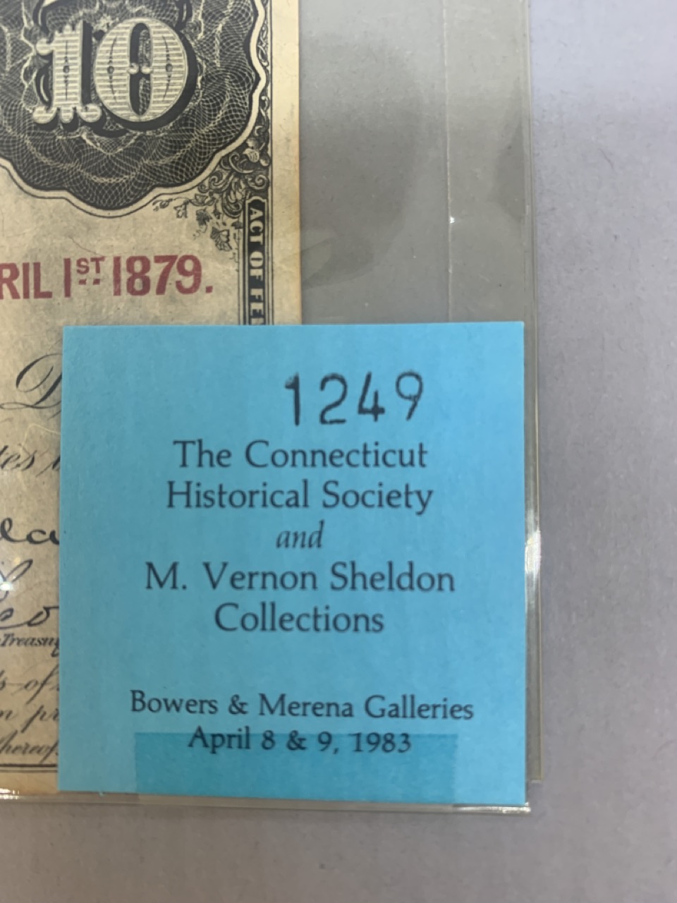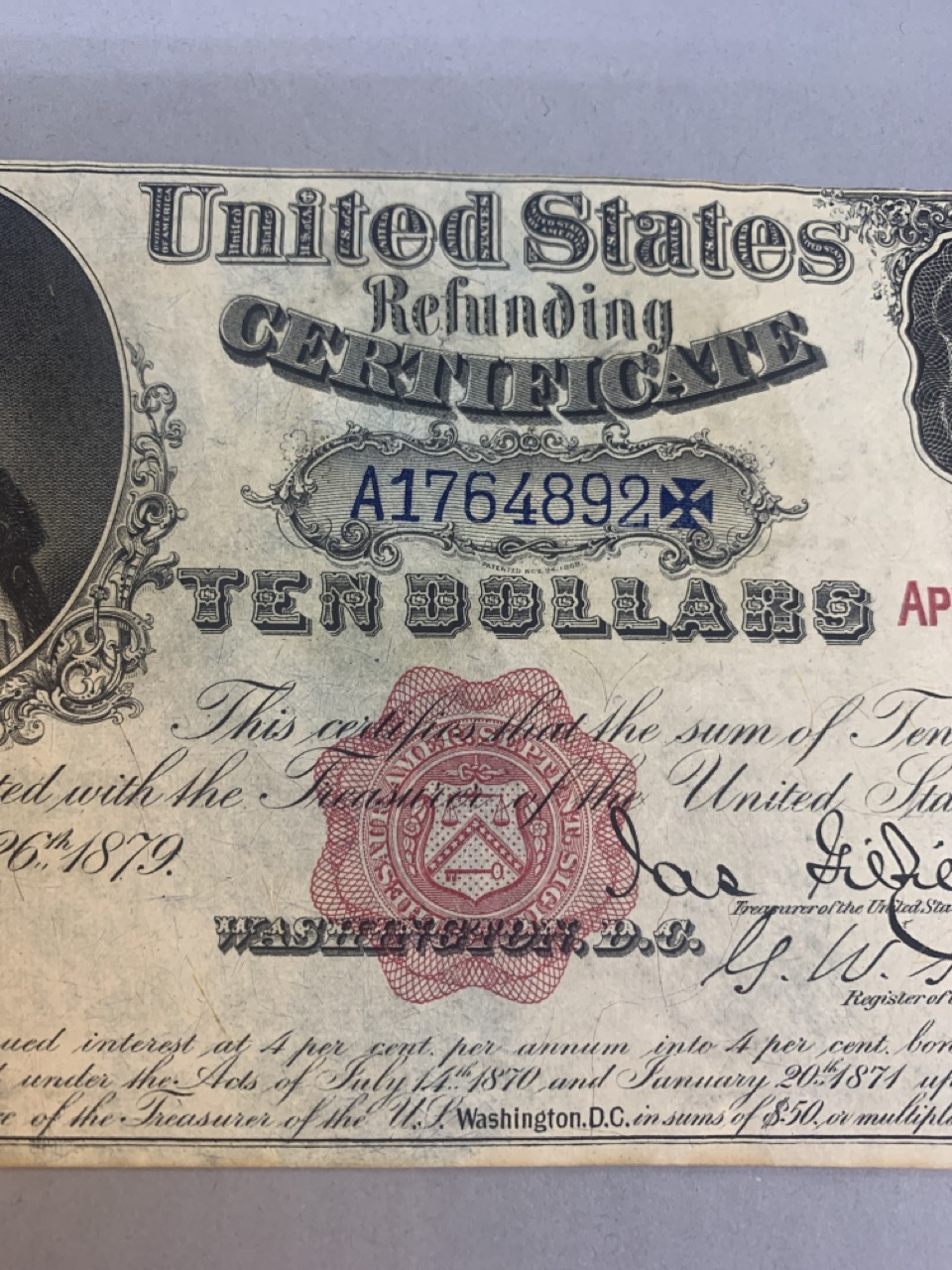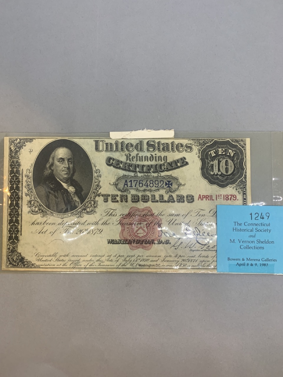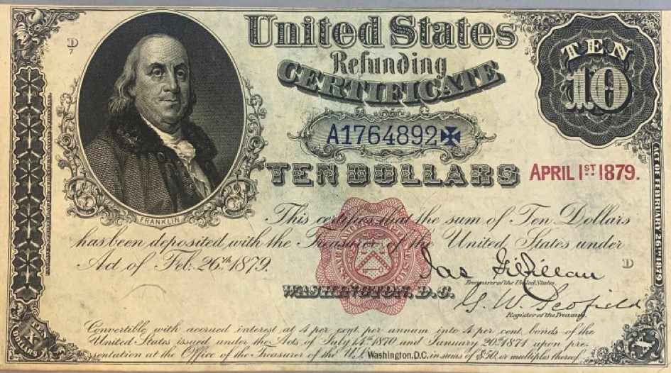 United States $10 Refunding certificate April 1, 1879. Provenance: The Connecticut Historical Society and M.Vernon Sheldon Collections Bower & Merena Galleries April 8 and ninth, 1983 Lot 1249. Paper currency collection offered in this sale has been stored away in safety deposit box since early 1980's. Exceptional collection all with sale provenance. Ungraded.