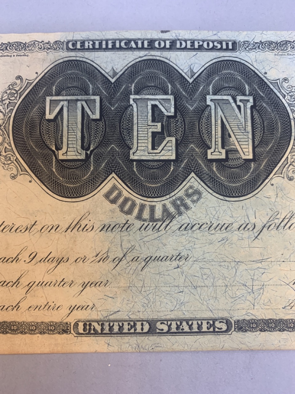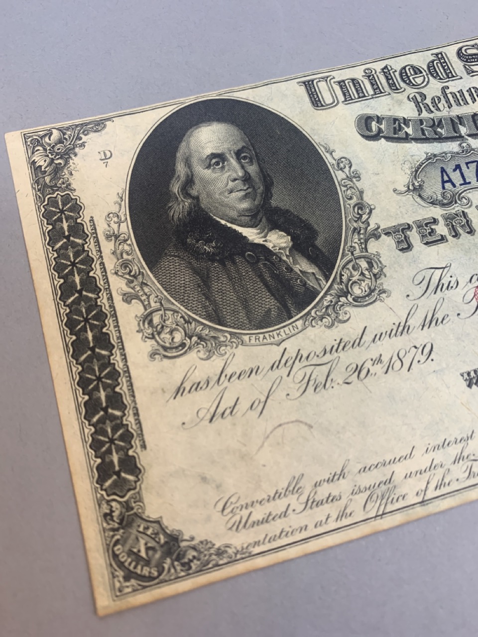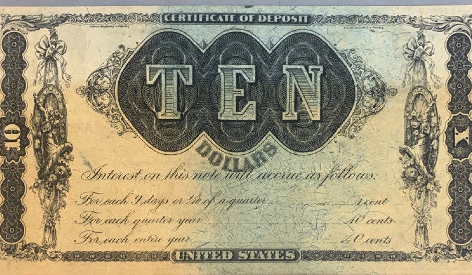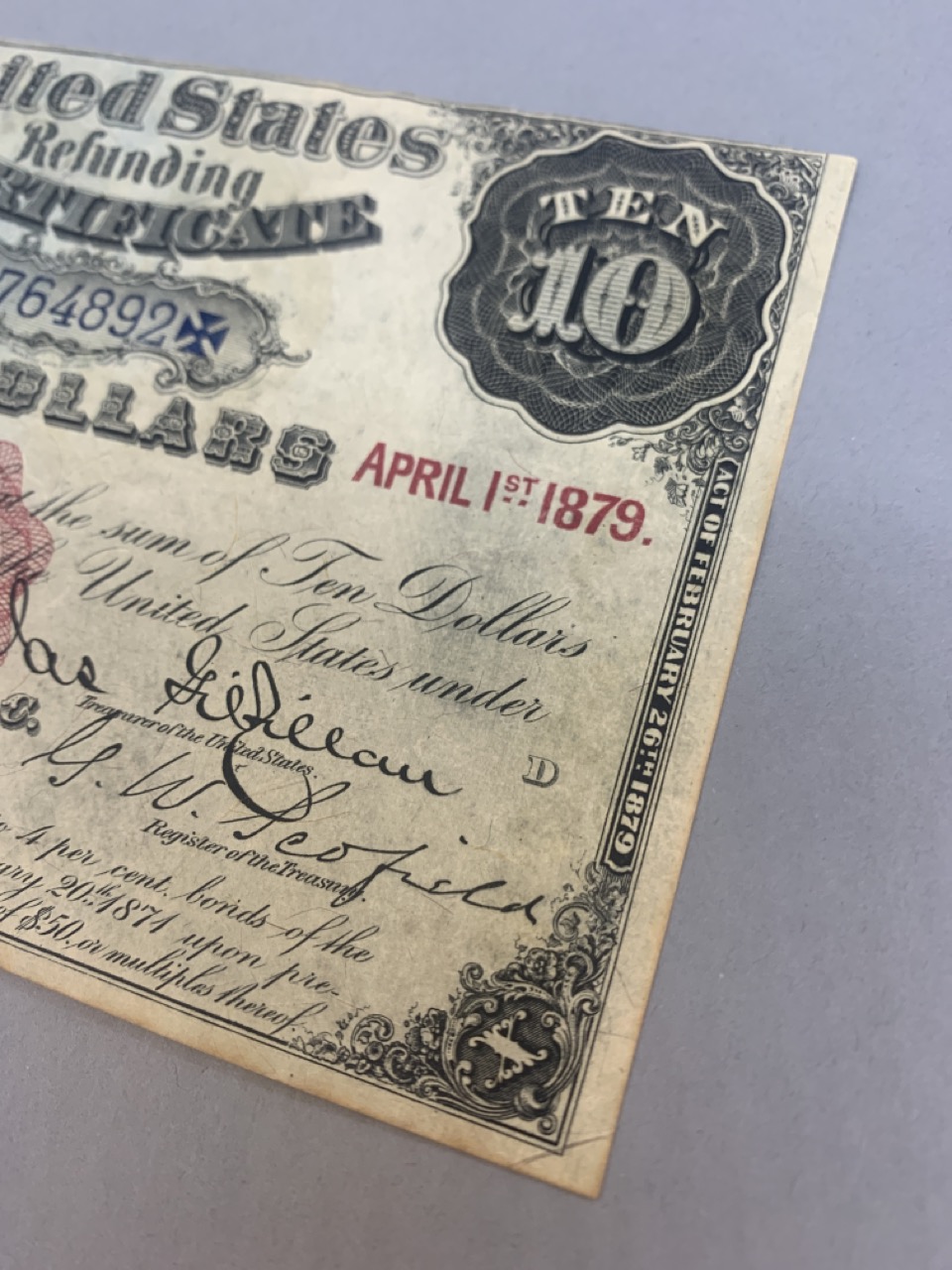 United States $10 Refunding certificate April 1, 1879. Provenance: The Connecticut Historical Society and M.Vernon Sheldon Collections Bower & Merena Galleries April 8 and ninth, 1983 Lot 1249. Paper currency collection offered in this sale has been stored away in safety deposit box since early 1980's. Exceptional collection all with sale provenance. Ungraded.