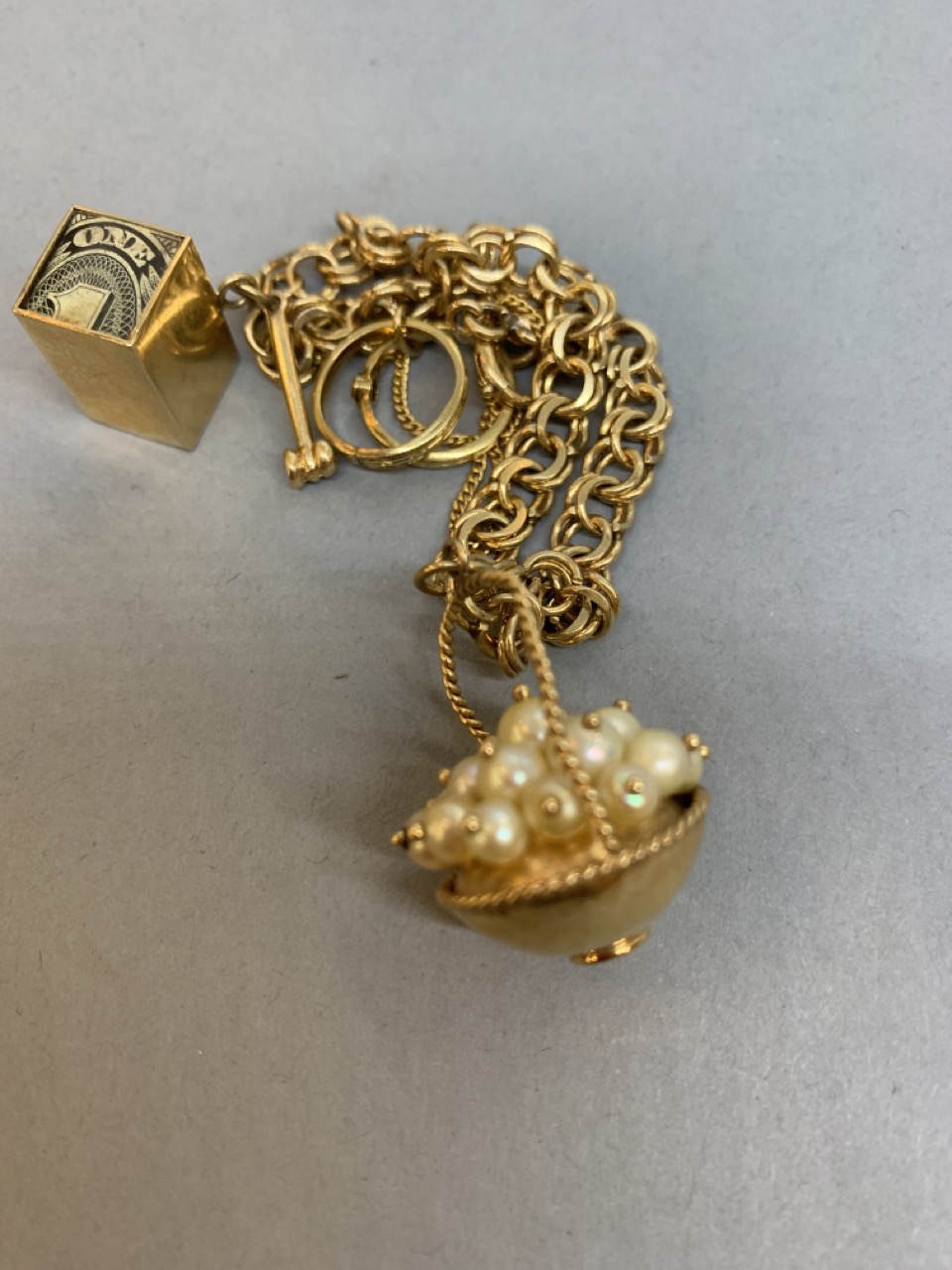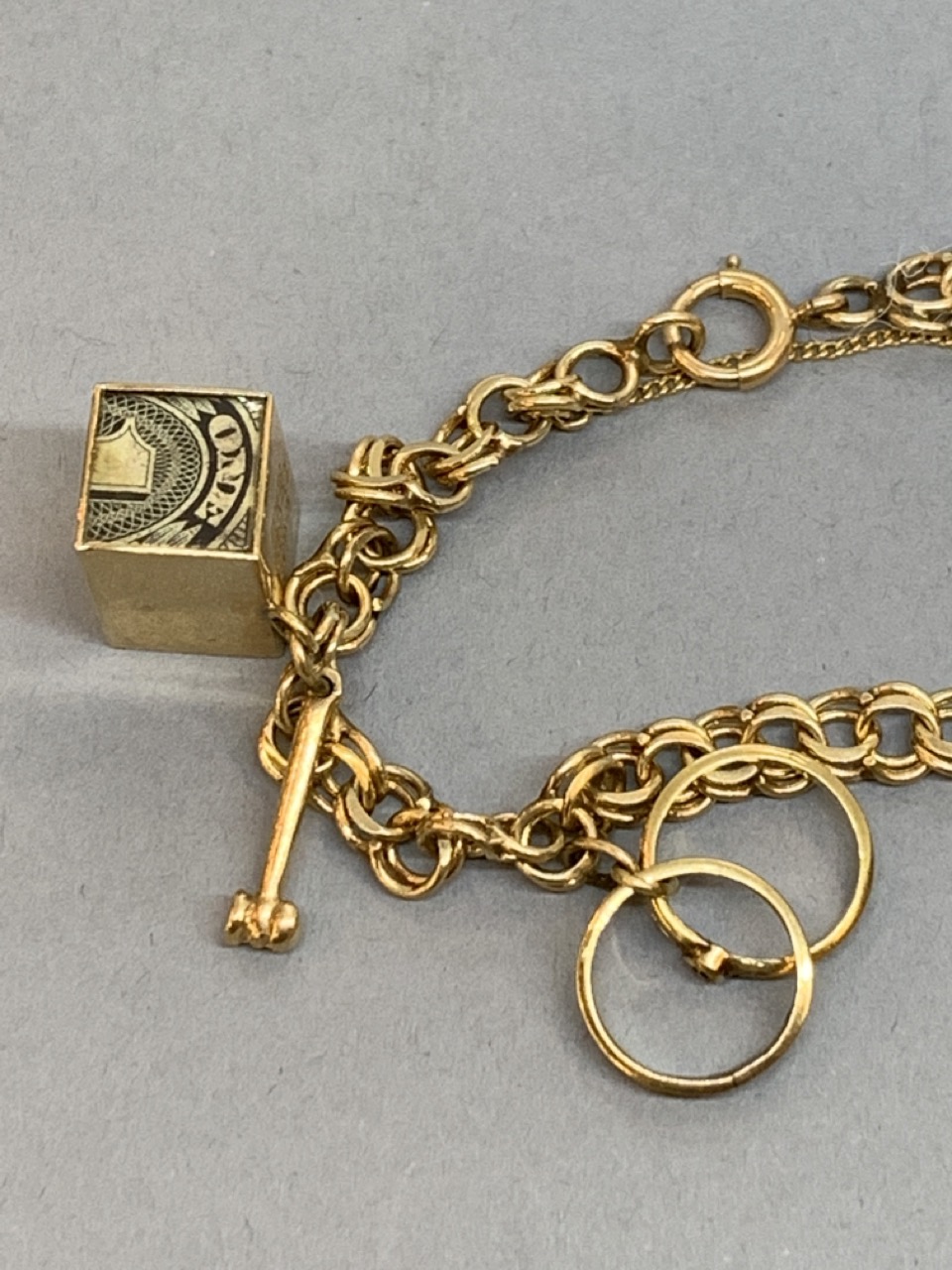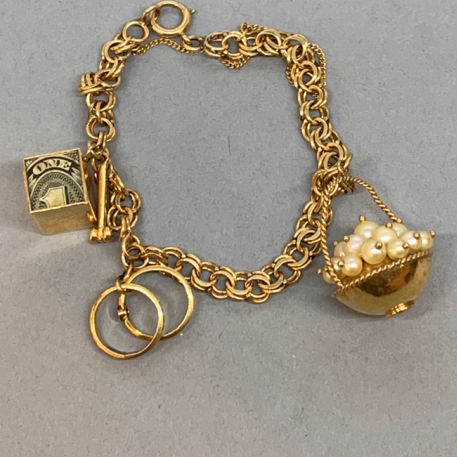 14 karat yellow gold charm bracelet. Dollar bill capsulized charm, gavel, two miniature wedding bands and basket with pearls.