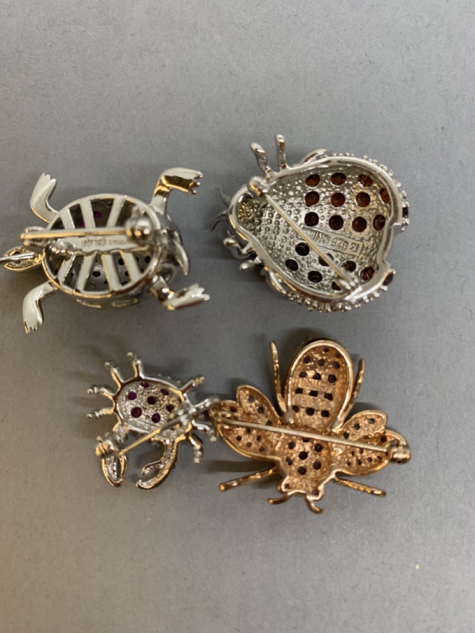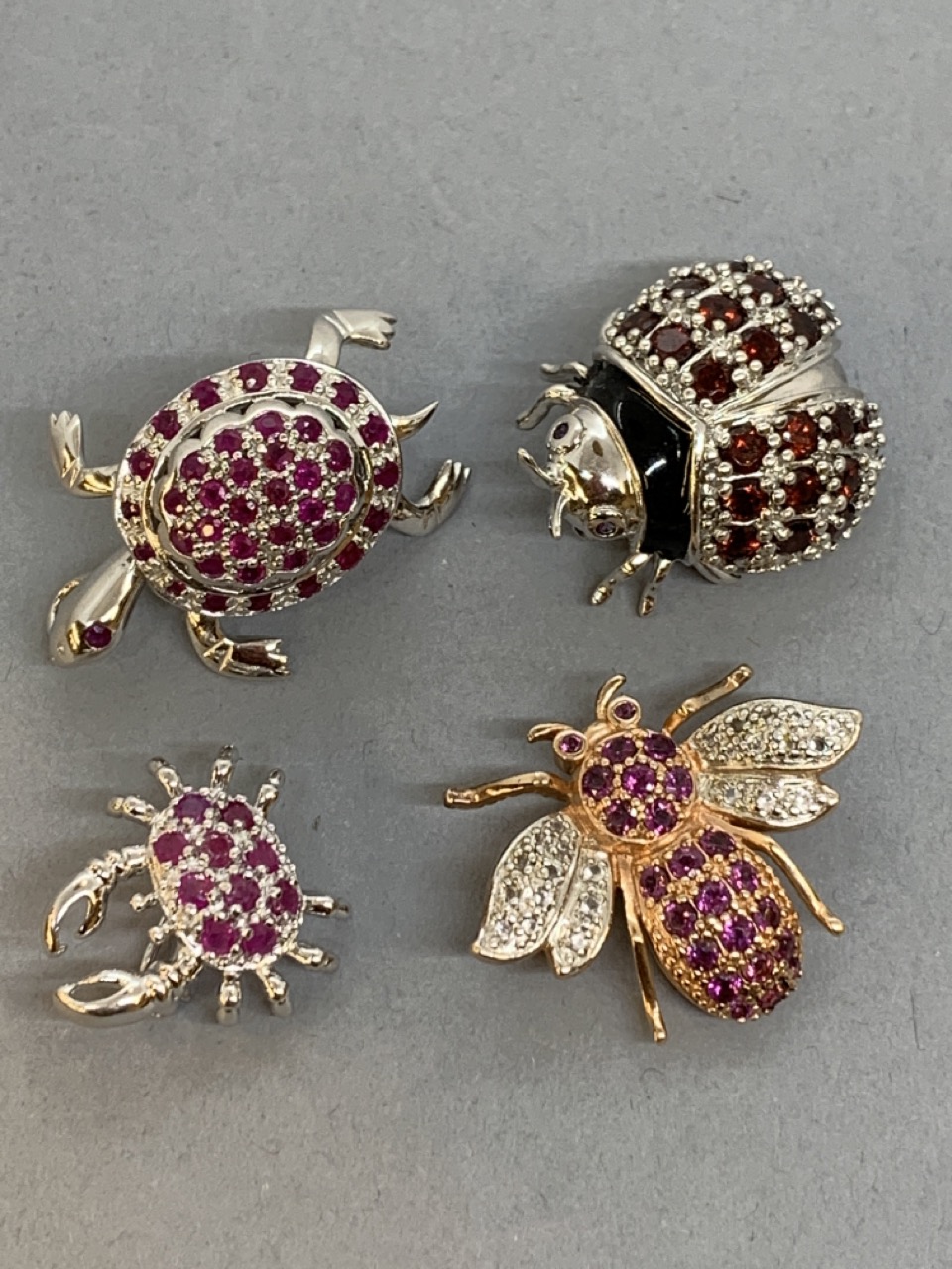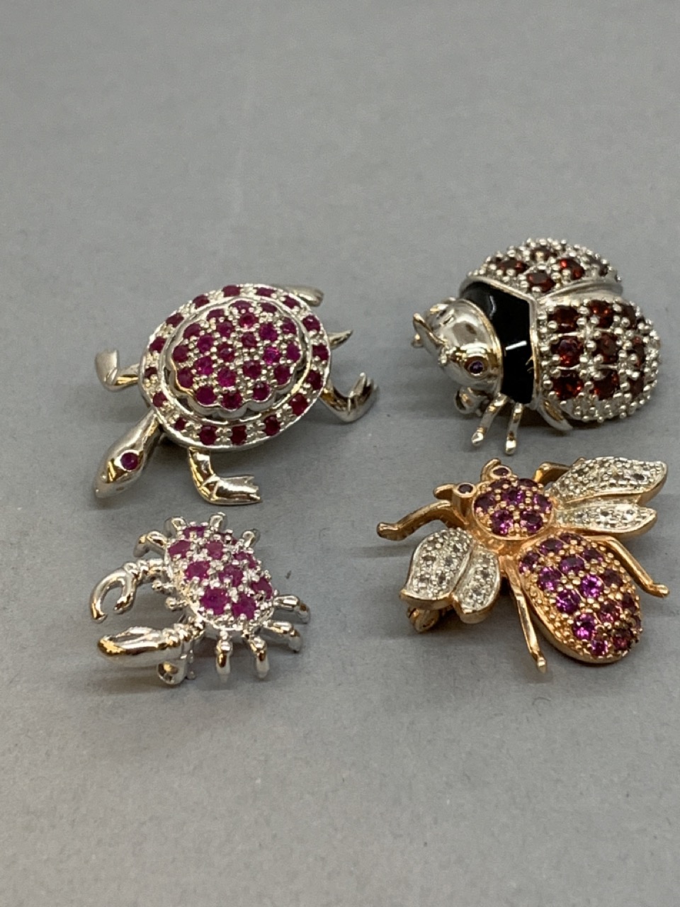 Four sterling silver gemstone animal pins. Turtle, crab, ladybug and bee.