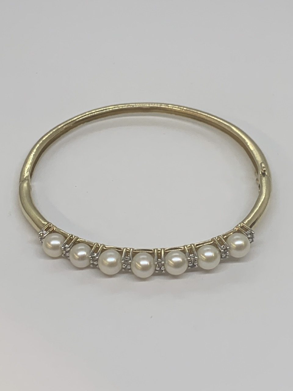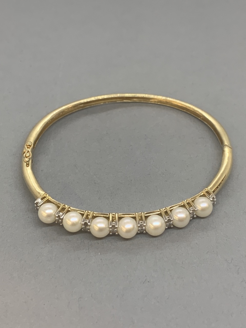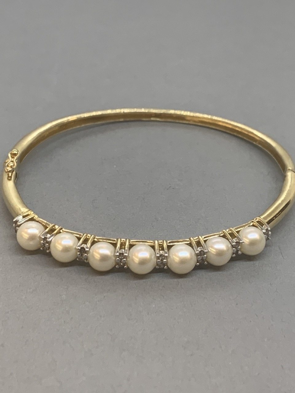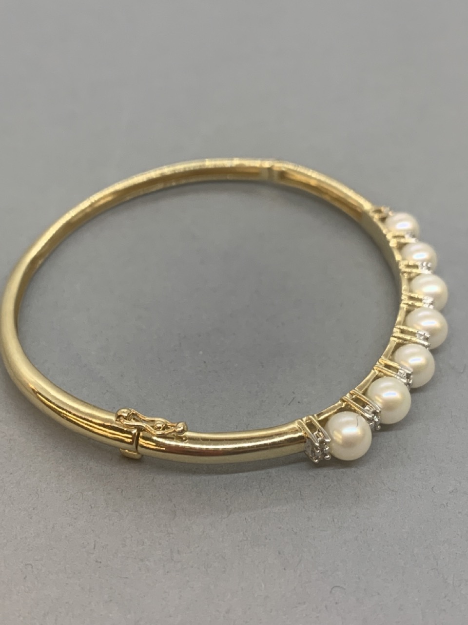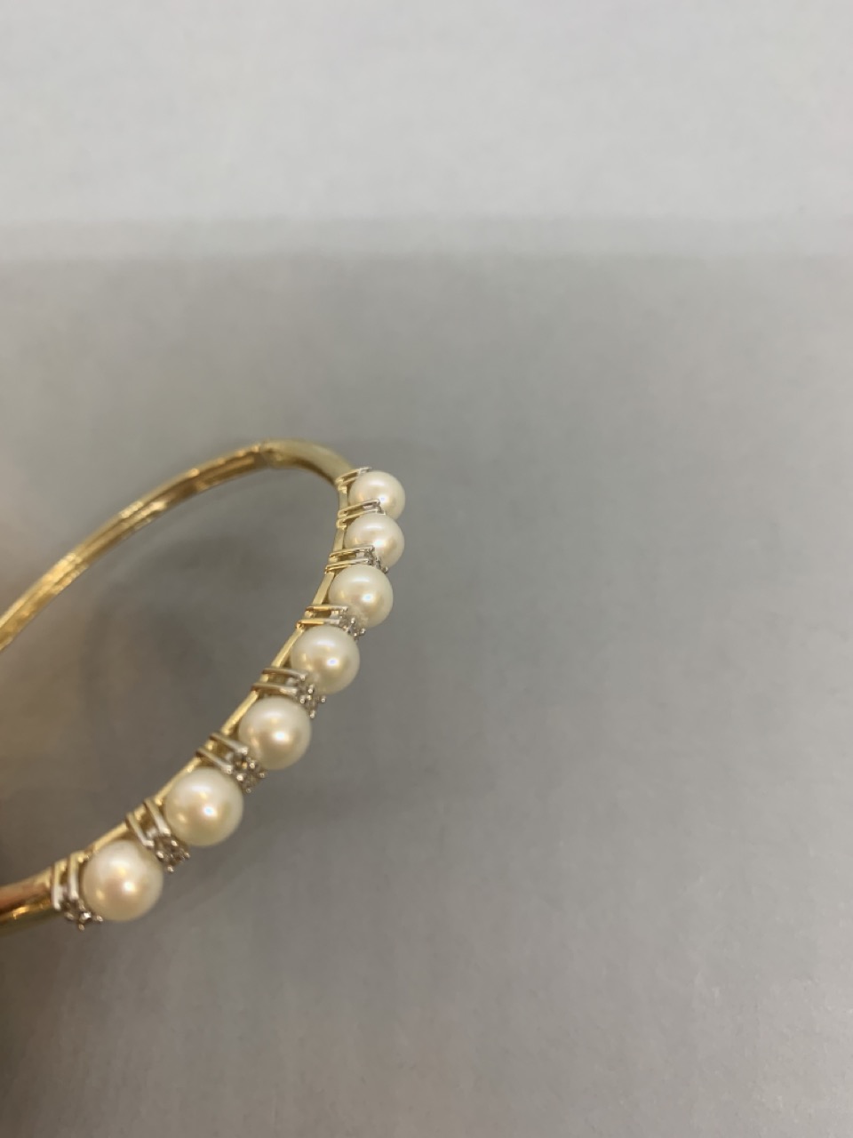 14k y.g. pearl bangle bracelet with 16 diamonds.