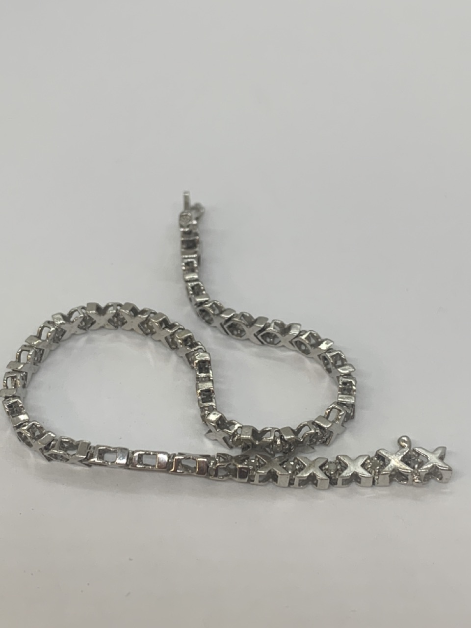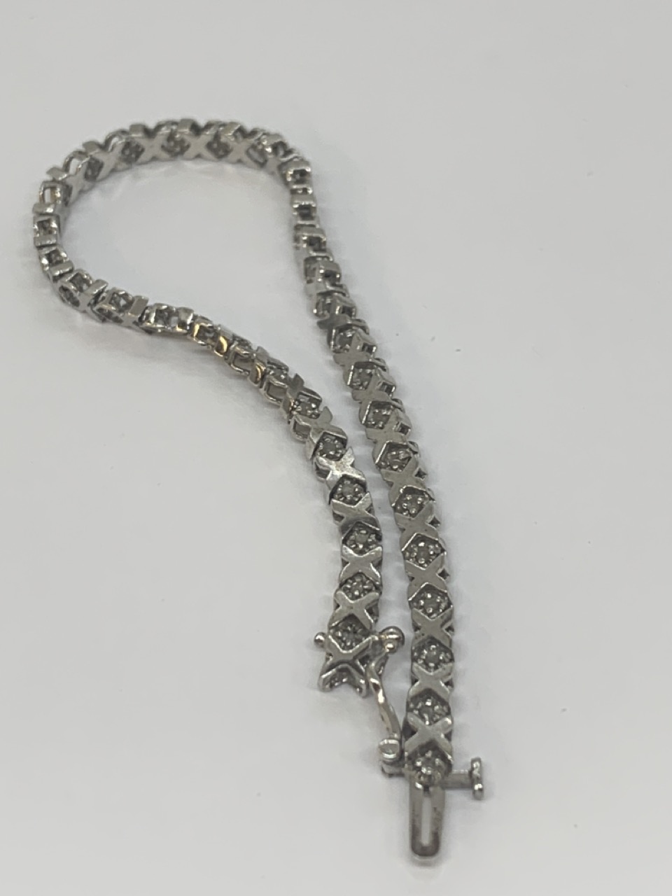 A 14k white gold XO pattern diamond tennis bracelet. 35 diamonds.