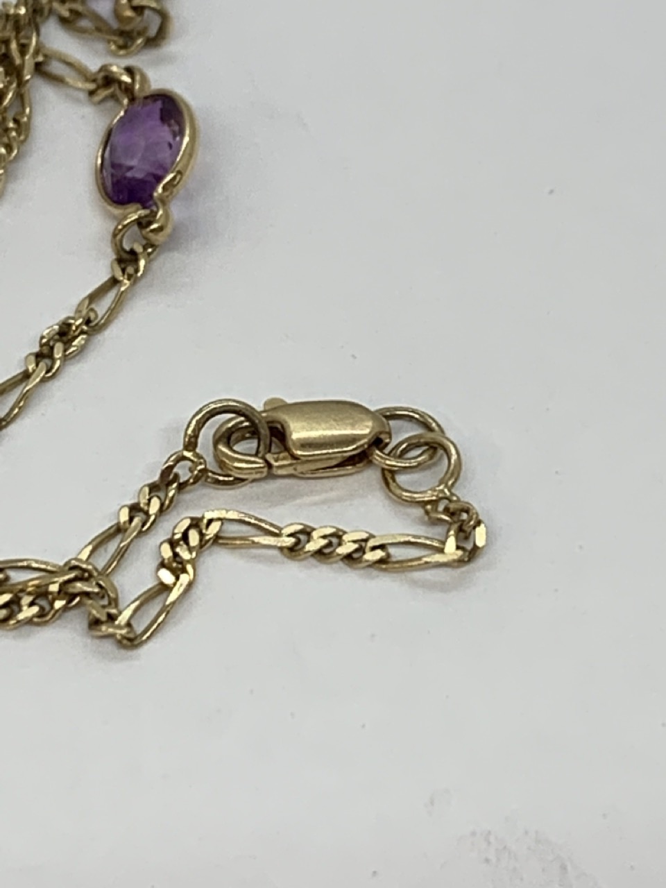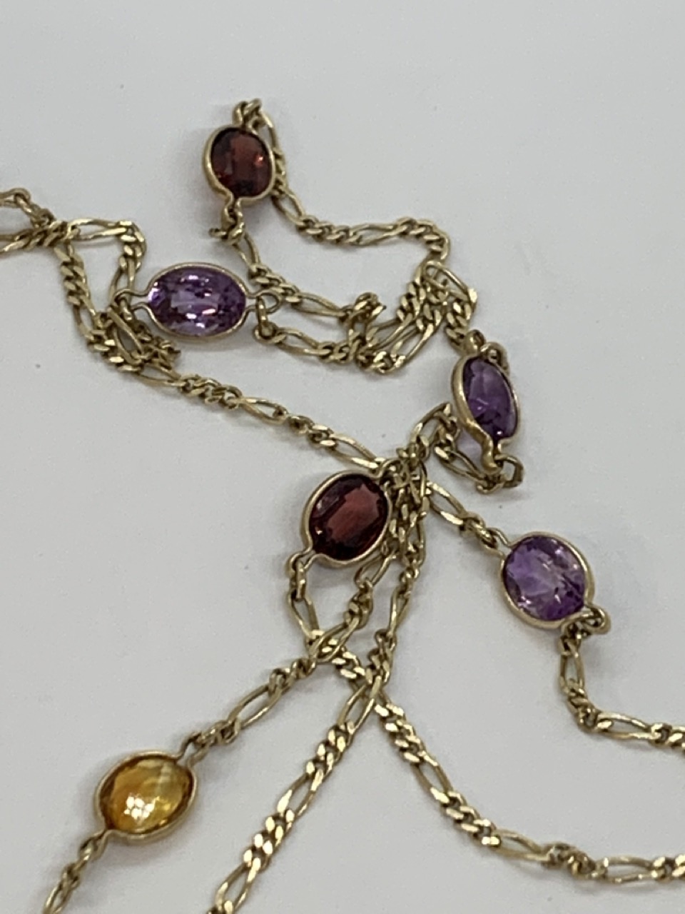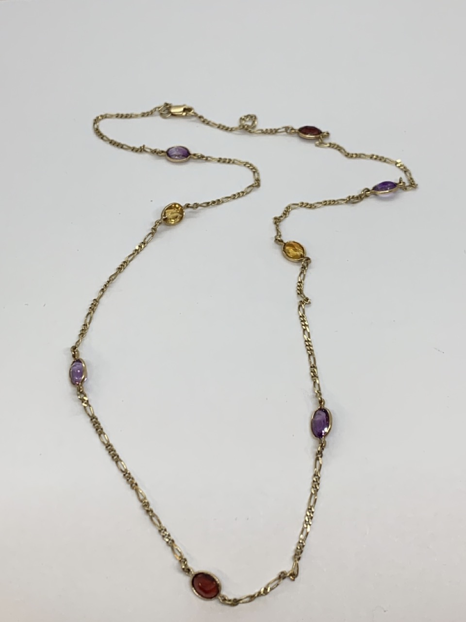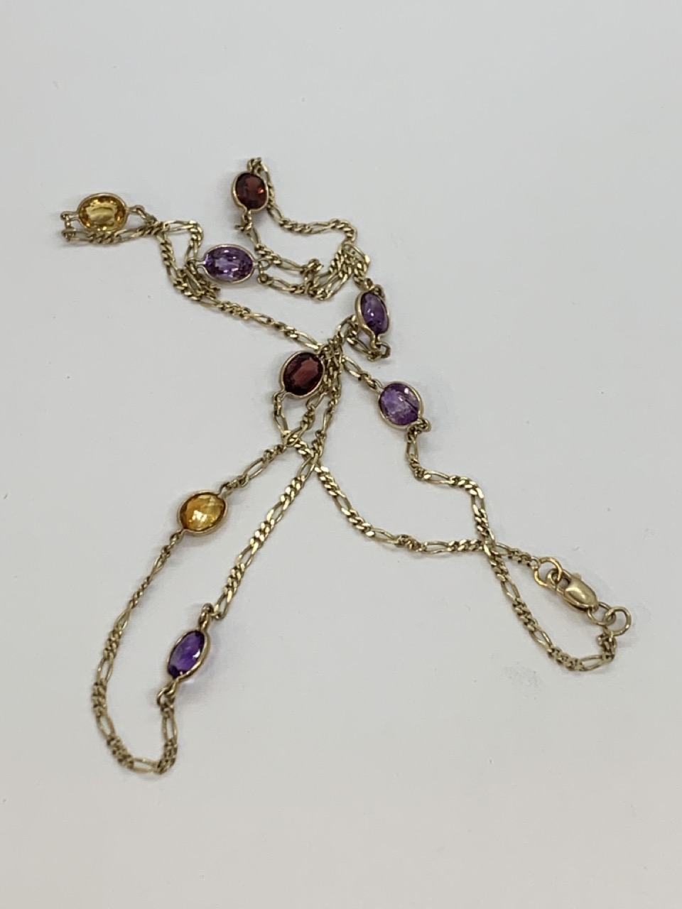 A 14k yellow gold necklace with spaced amethyst, garnet and citrine stones.