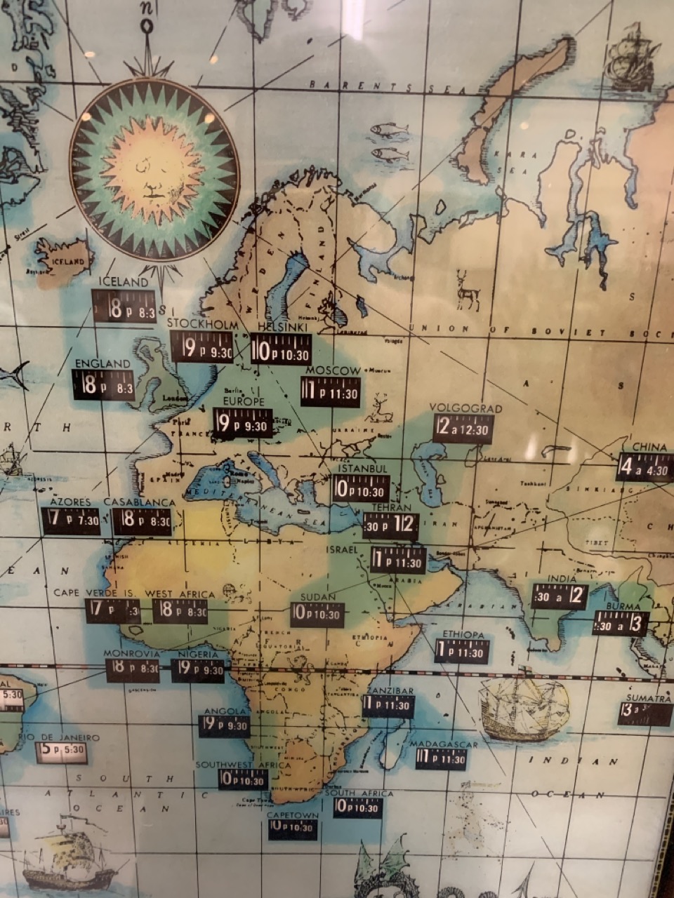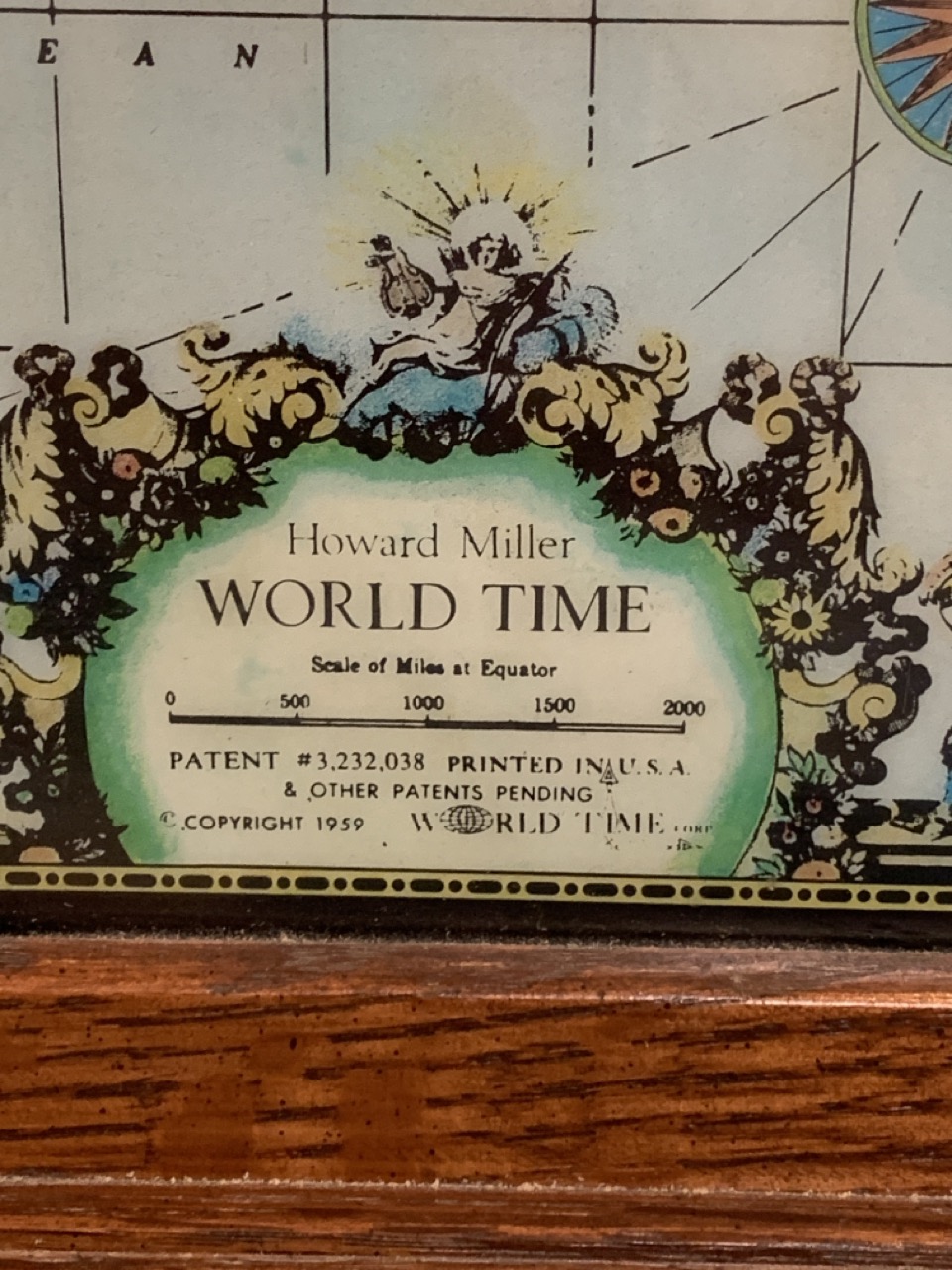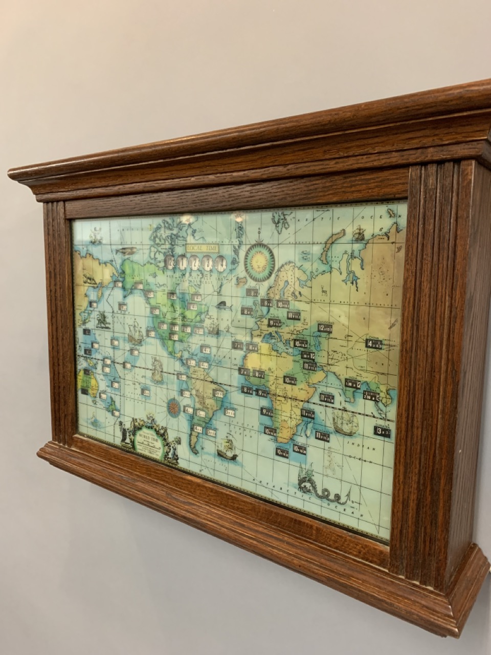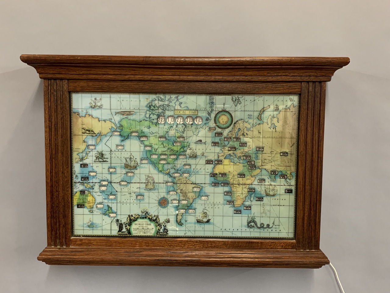 A Howard Miller World Time Clock. Created 1959. Solid oak casing. Powers on and makes humming noice. Service needed. Dimensions: 18” x 25” x 5” depth.