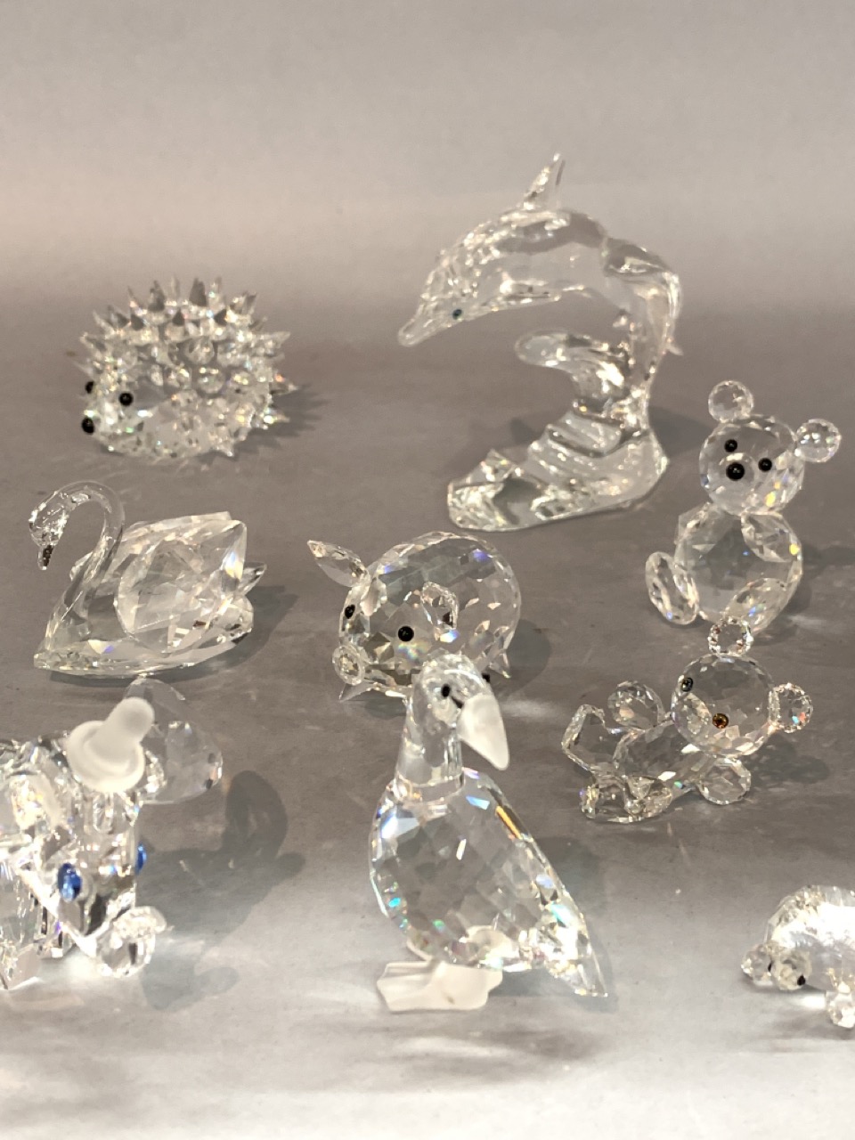 Nine assorted Swarovski glass figures. Animals, flowers, Dumbo elephant etc.