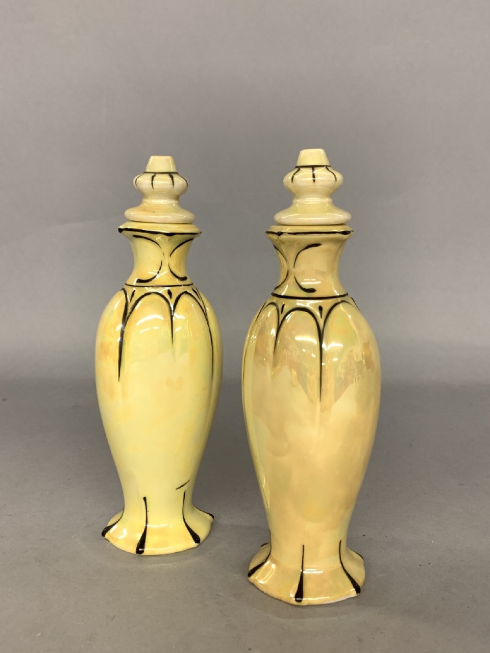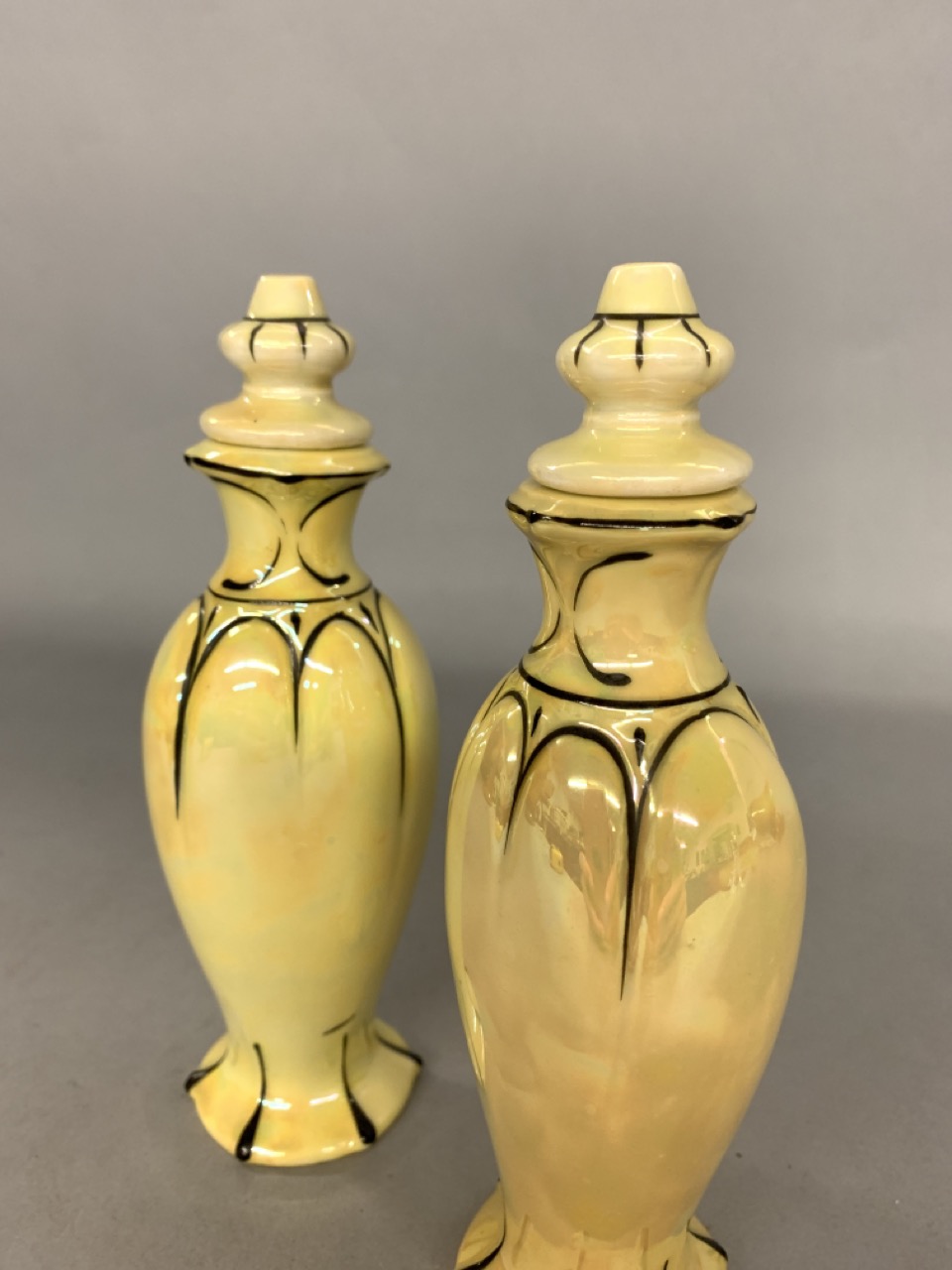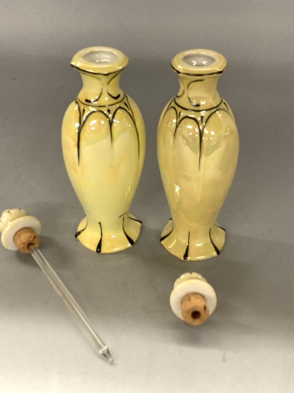 A pair of Art Deco lusterware perfume bottles. One bottle missing dropper. Dimensions: 6” h