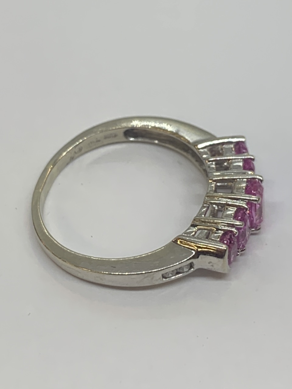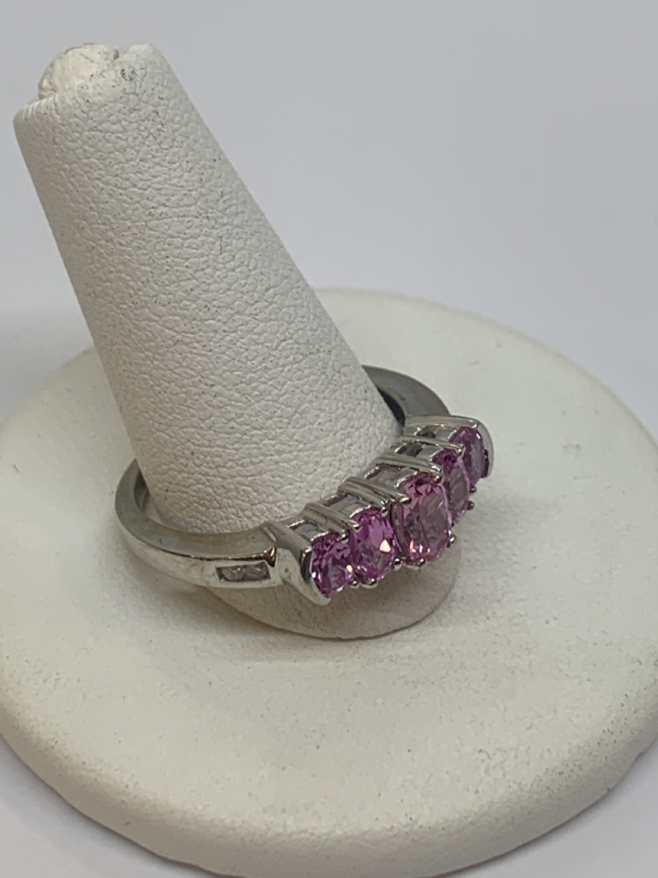 10k gold ring with pink stones and four diamonds.
