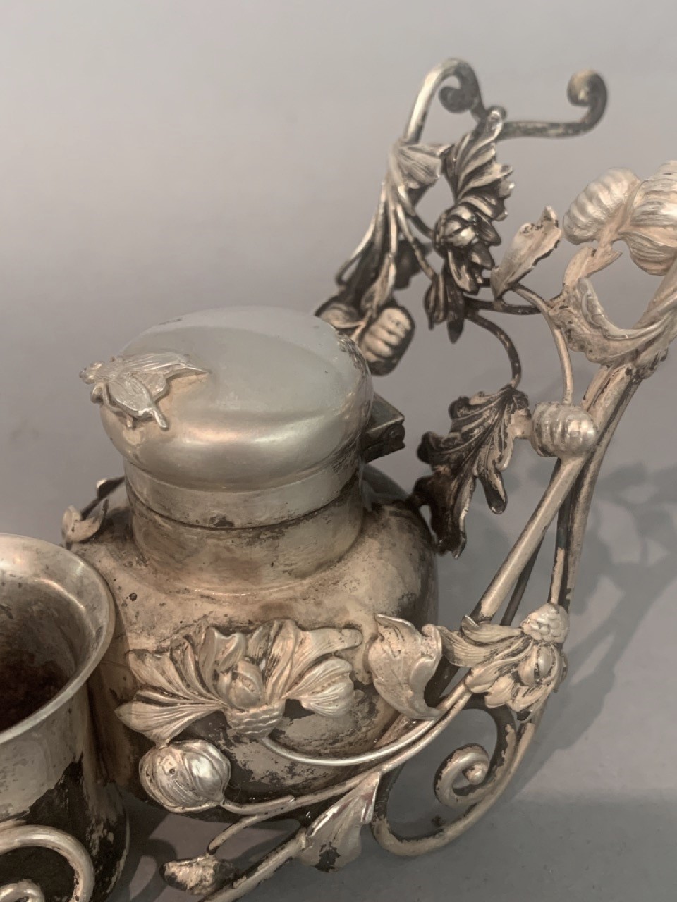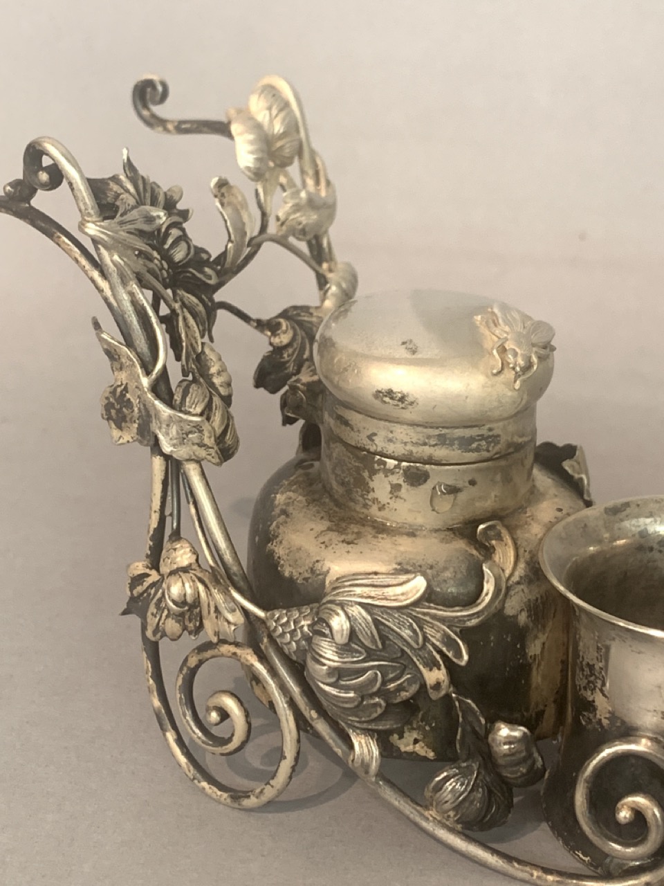 A fine George W. Shiebler Japanesques style sterling sliver inkwell cart with pen rests. Highly ornate. Signed at base with maker marks and sterling 5520.