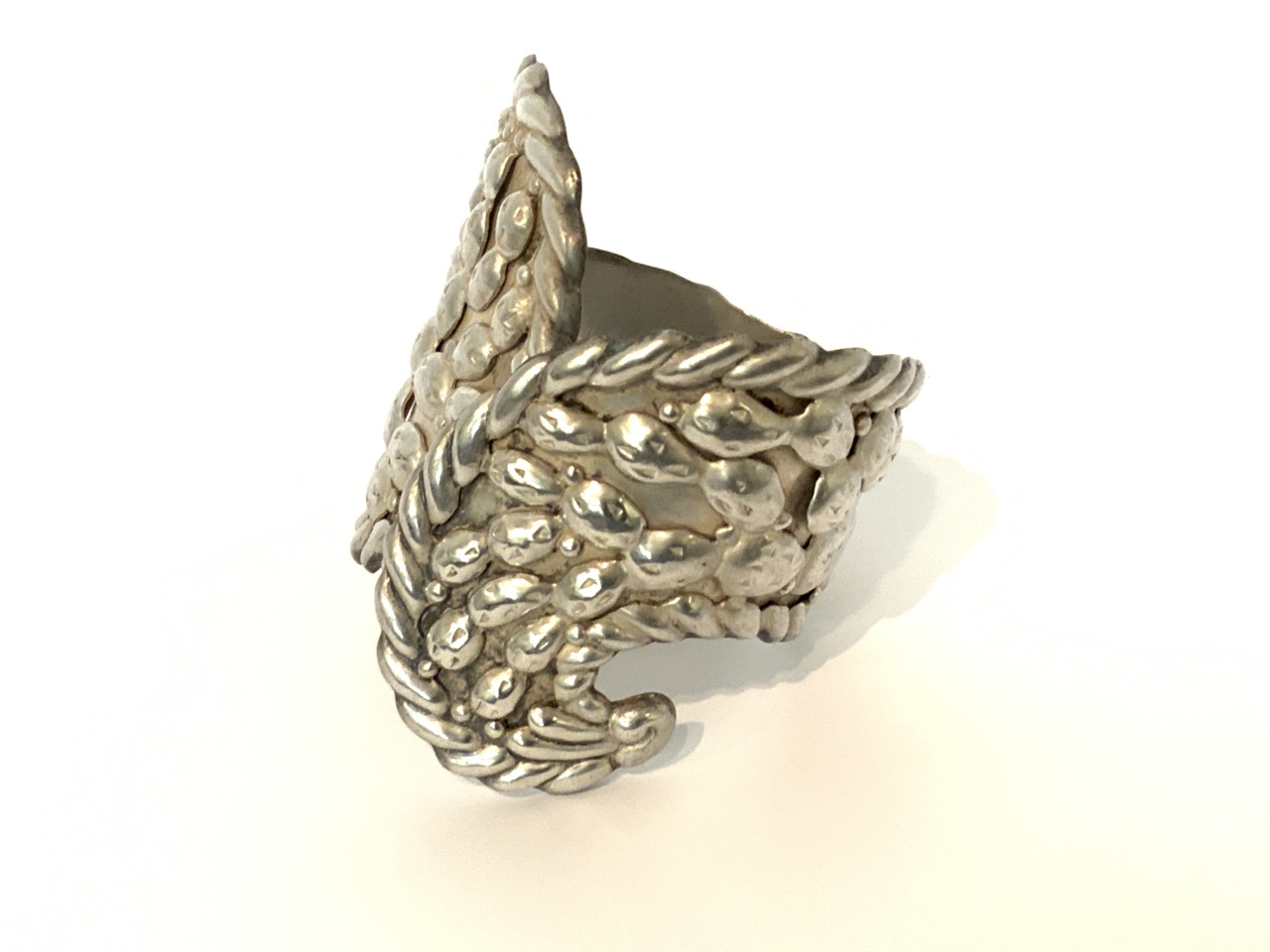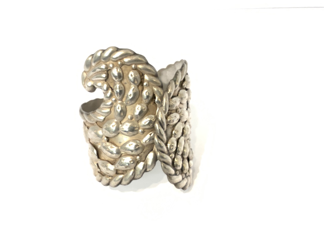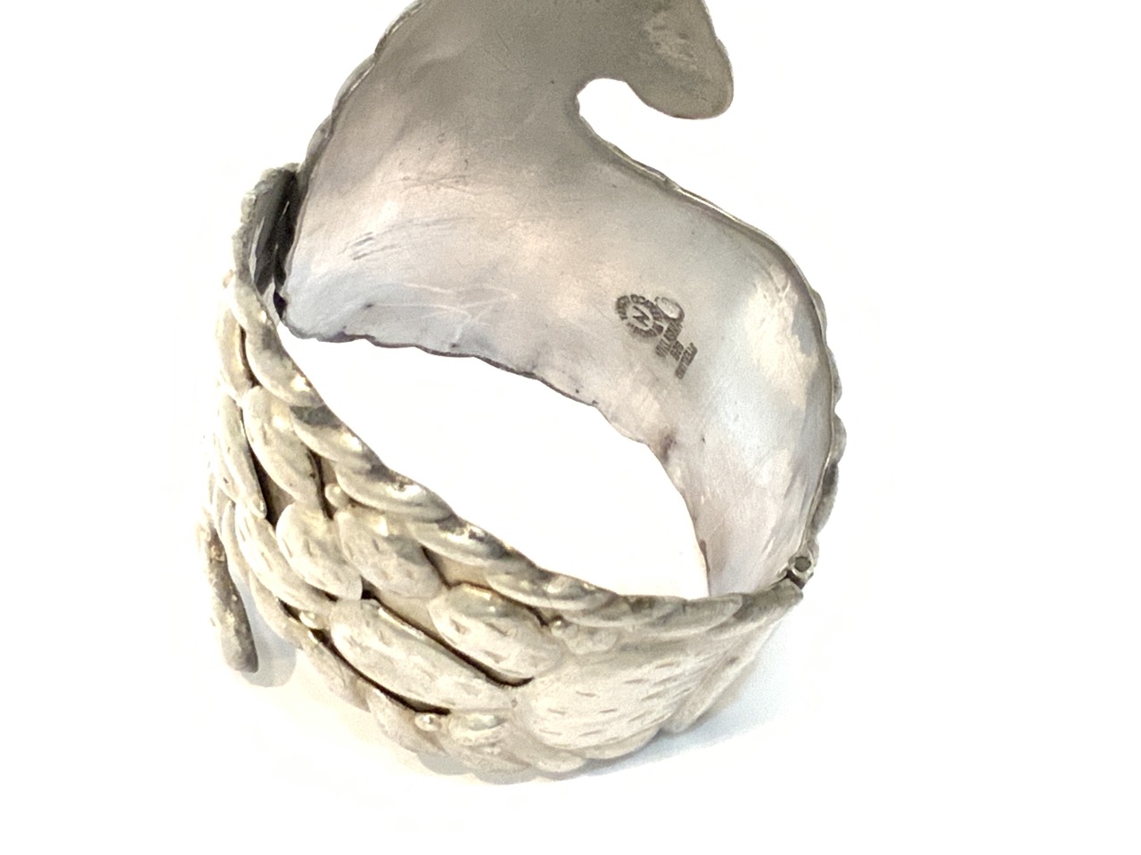 Mexican Taxco hinged cuff bracelet with cactus design. Polishing needed. Signed Taxco, 925 sterling.