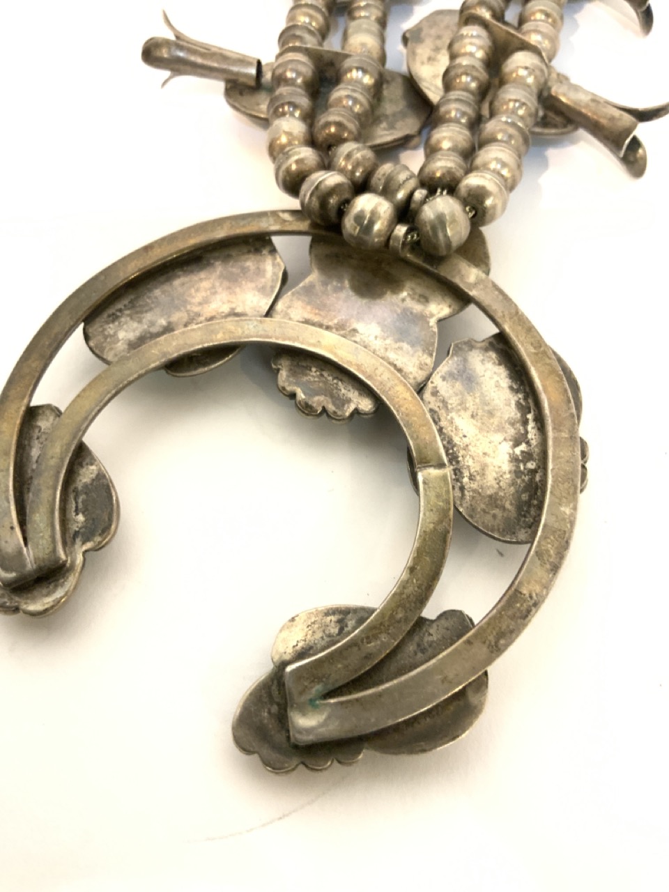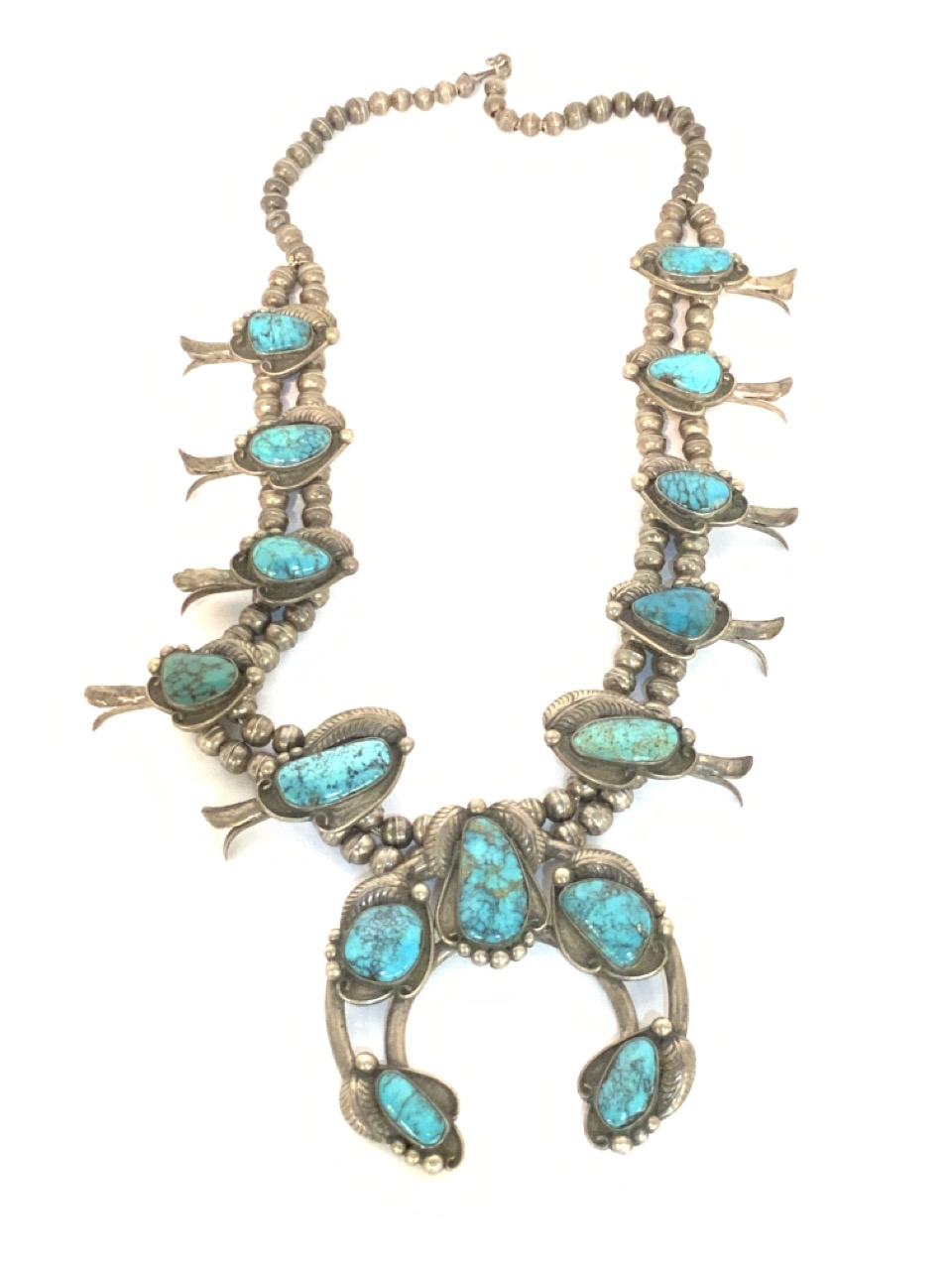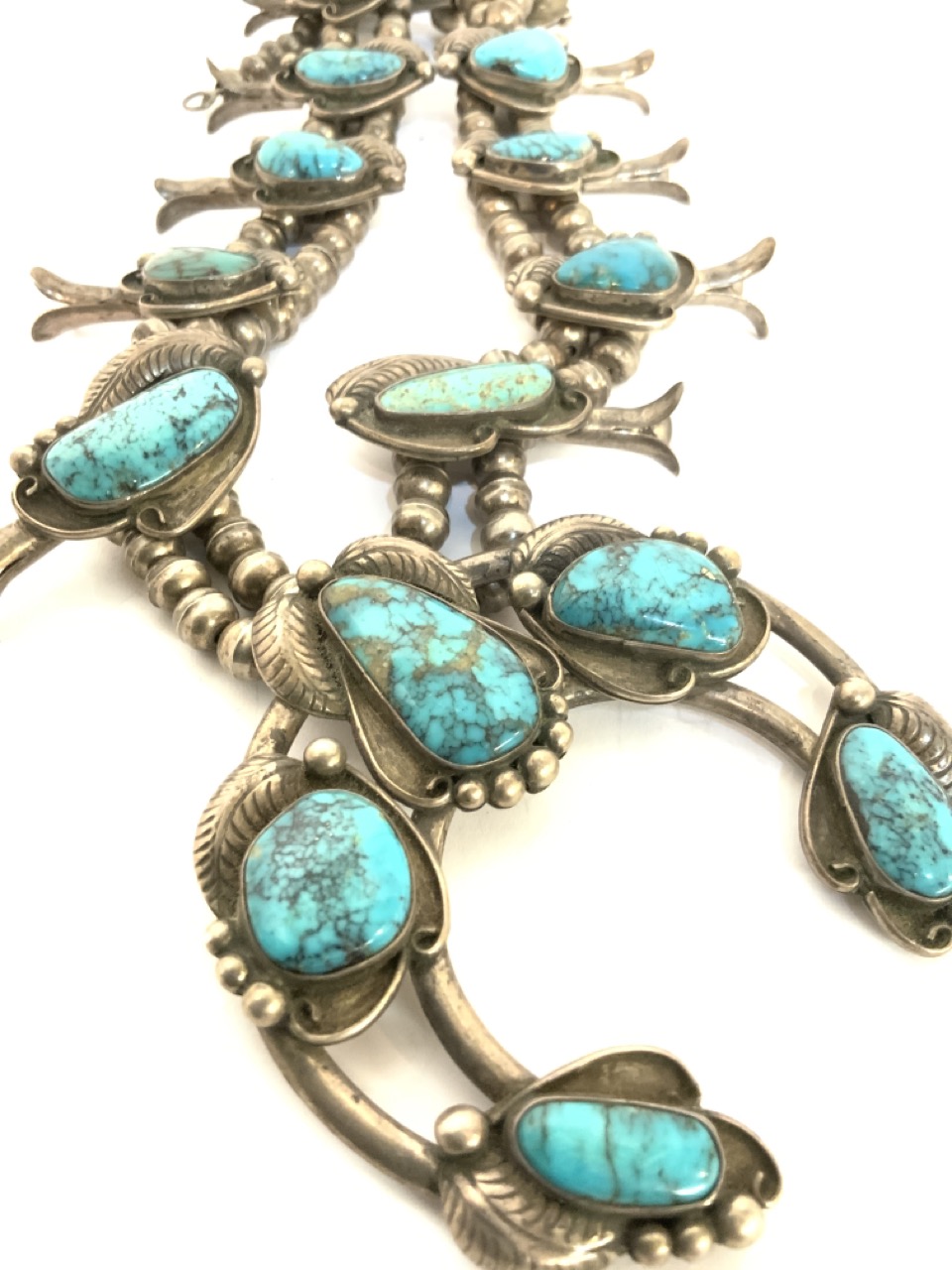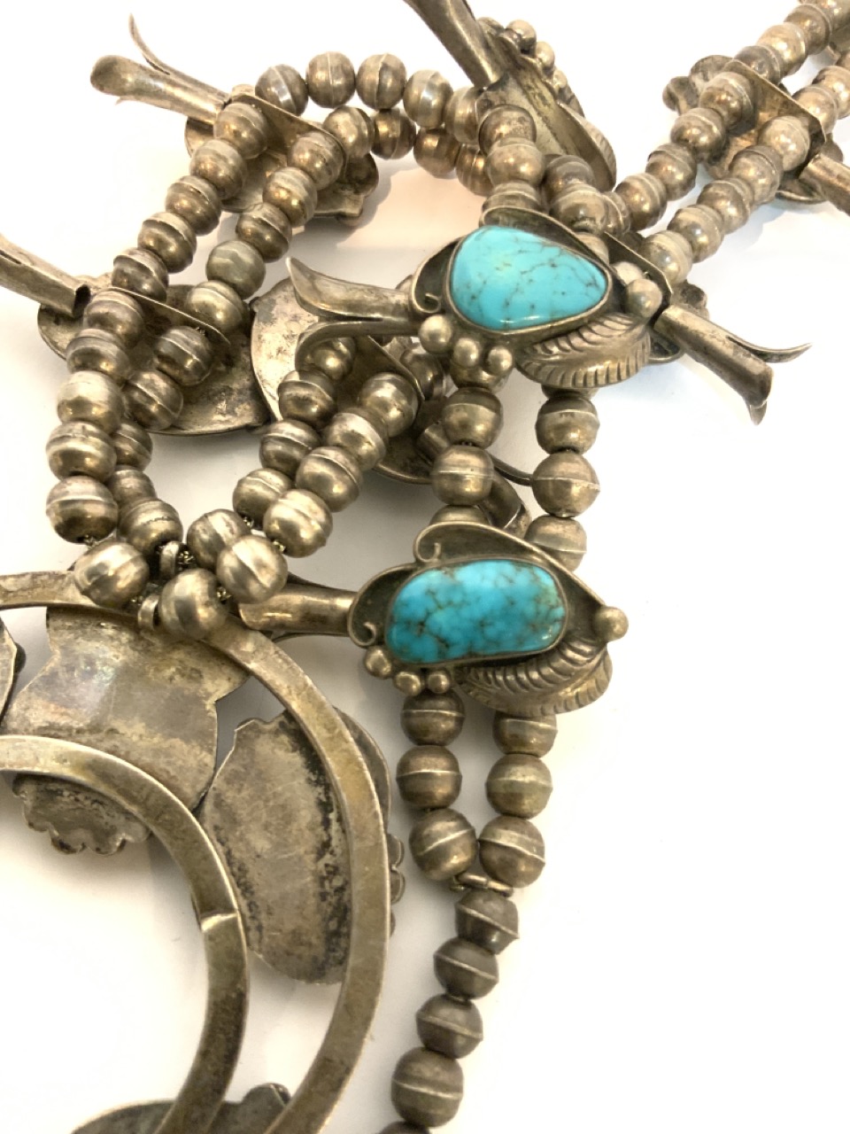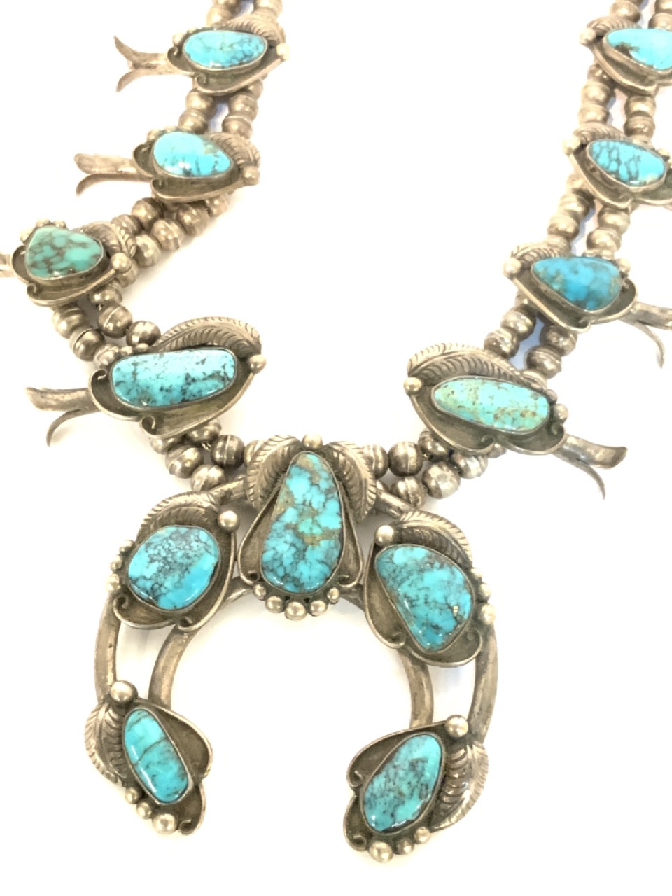Vintage American Indian squash blossom necklace. Sterling silver with turquoise stones. Unmarked.