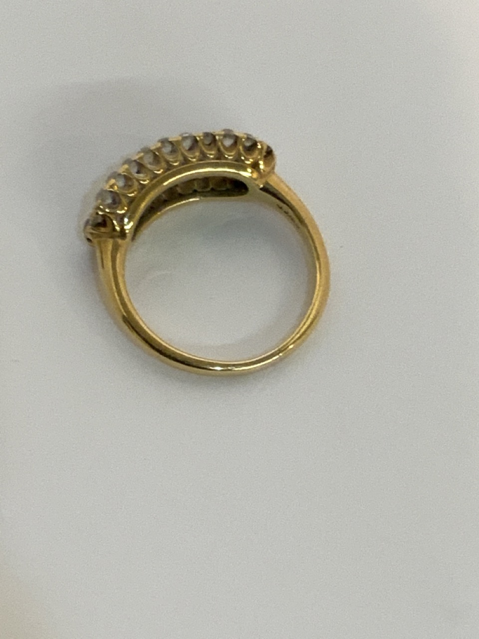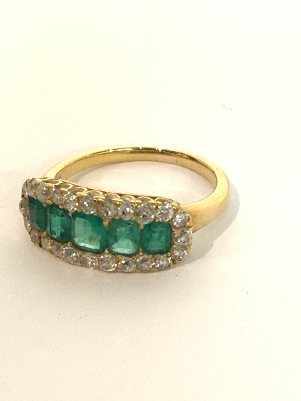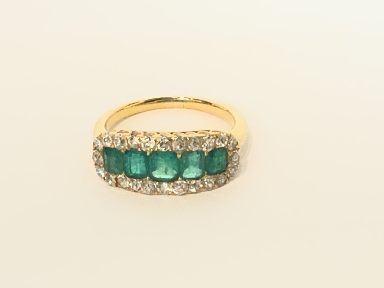 18k yellow gold emerald and diamond ring. 5 baguette emeralds surrounded by 24 round brilliant diamonds.